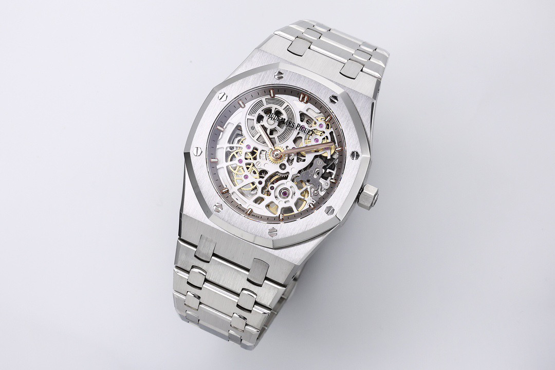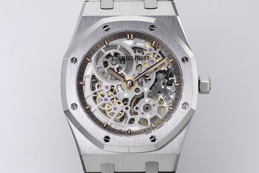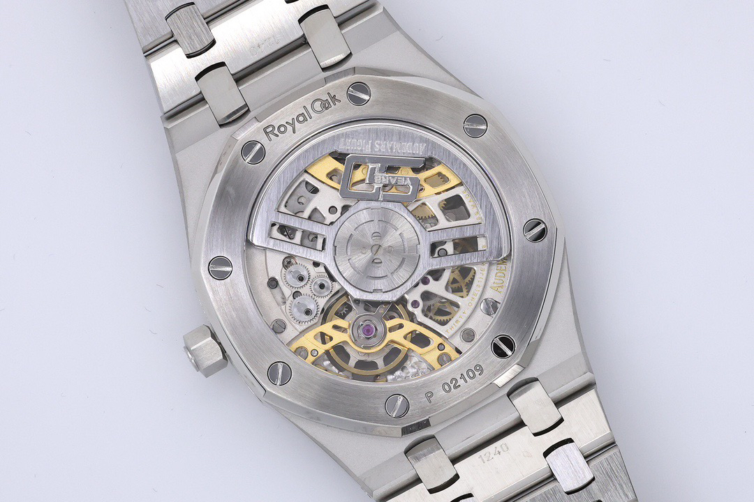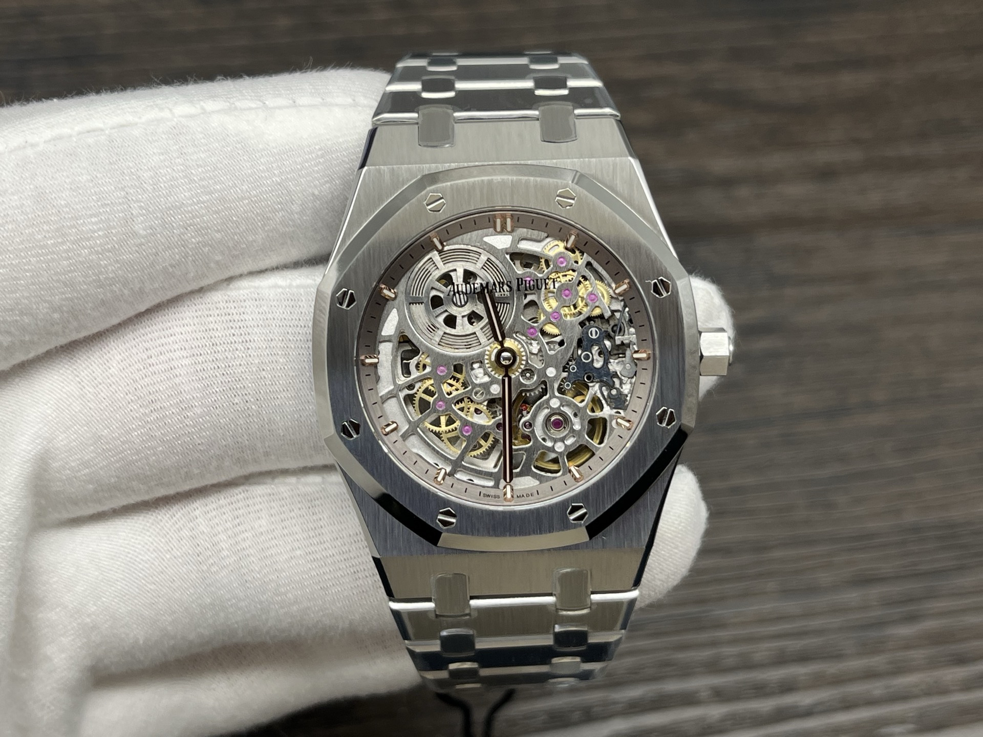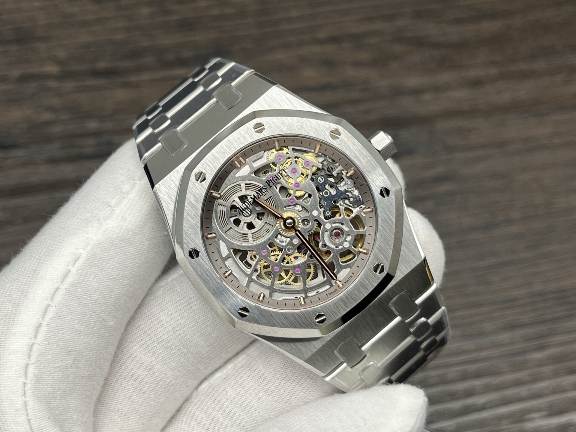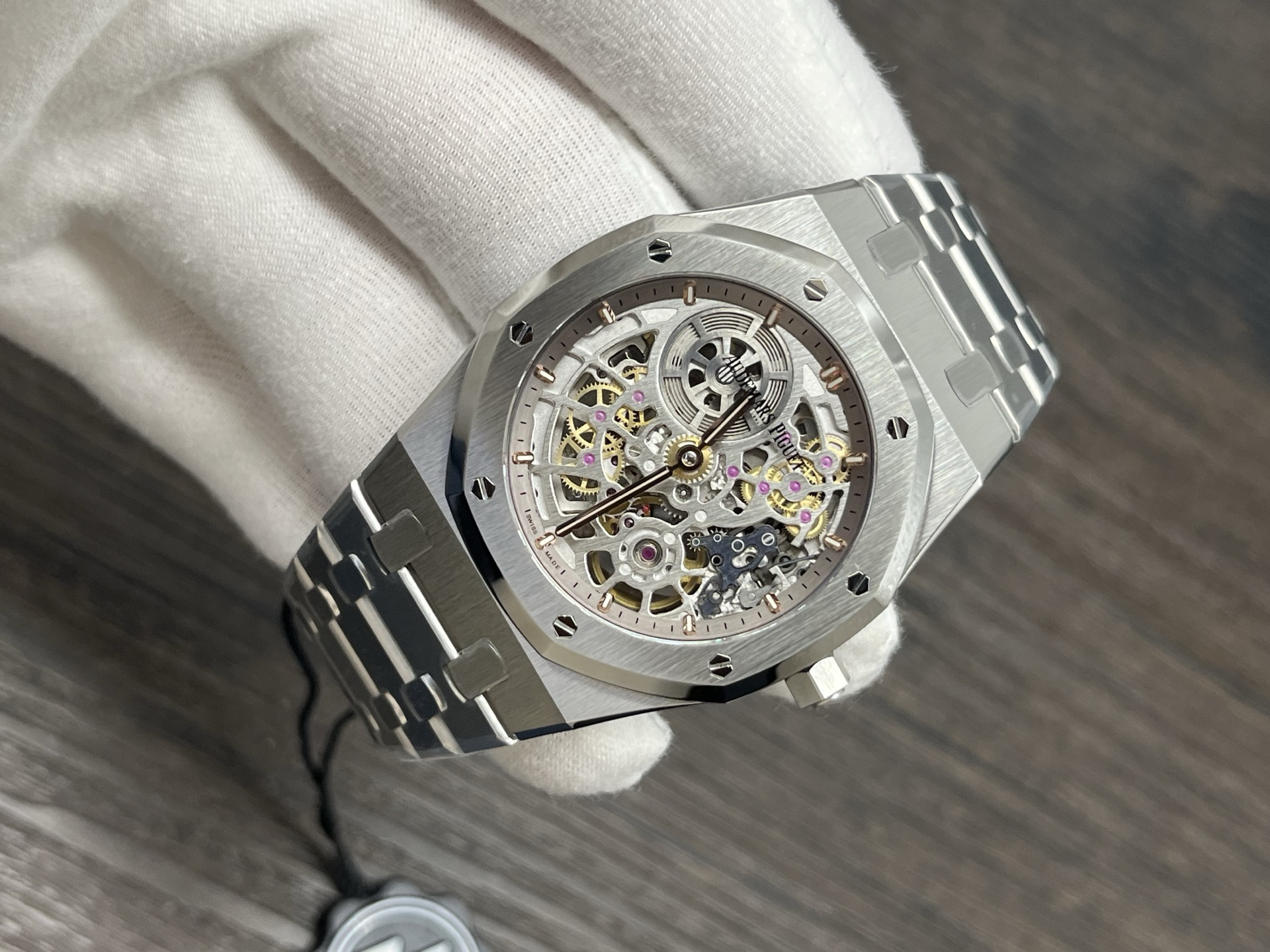 The highly recognizable octagonal 39MM case adopts advanced CNC machining technology to preliminarily cut and shape the stainless steel raw materials, and then uses exquisite wire drawing technology and forging surface polishing treatment to perfectly interweave on the case, presenting a unique luster and texture. The watch strap links are also produced through multiple complex polishing processes, making the surface of the links delicate, tightly connected, and flexible. Ensure comfort and fit when wearing. The AP logo on the watch buckle is finely carved, with clear lines and a three-dimensional steel structure. On the side of the case, the lugs naturally connect with the strap, creating a smooth transition and showcasing a harmonious beauty that is seamlessly integrated!