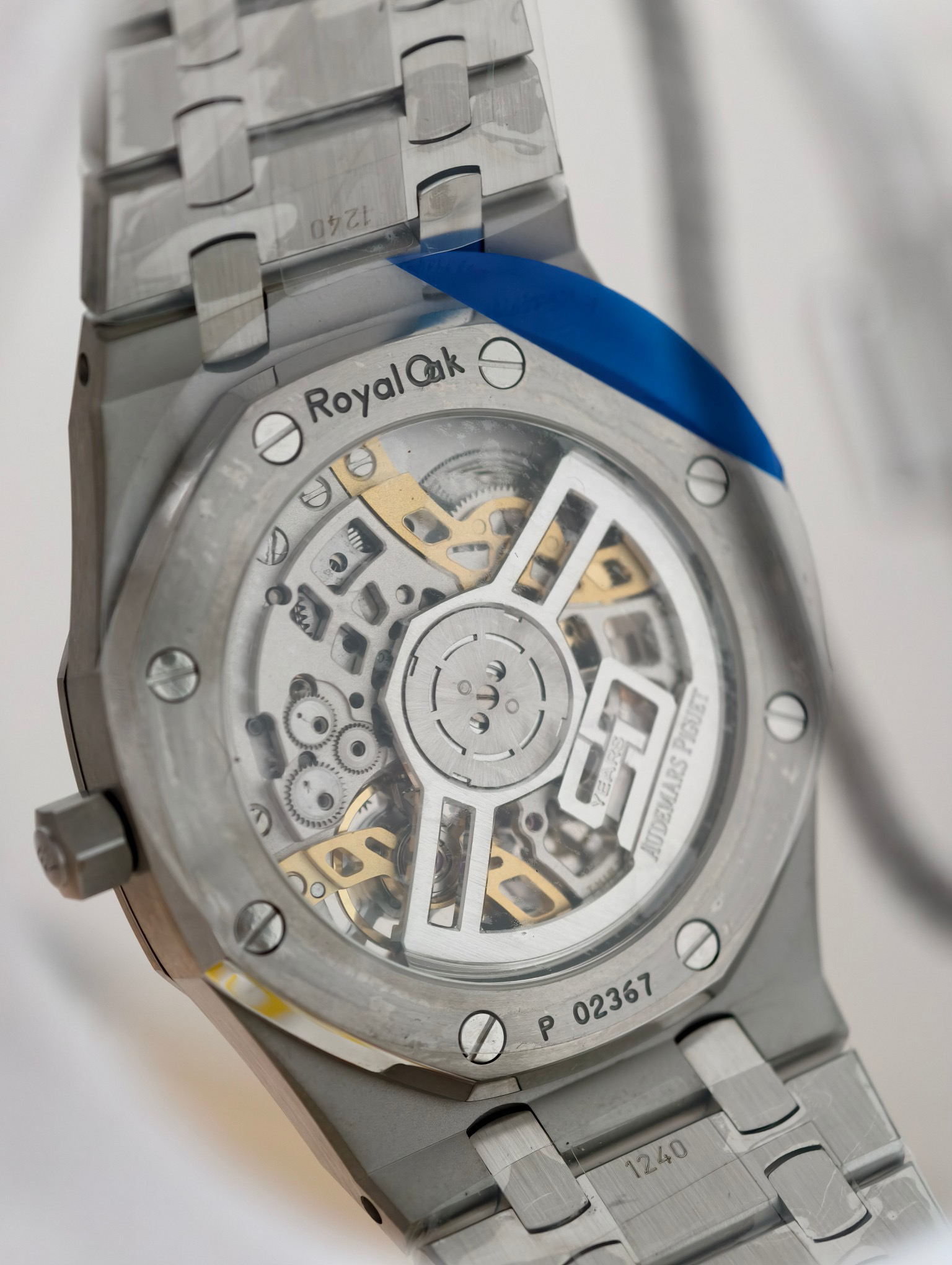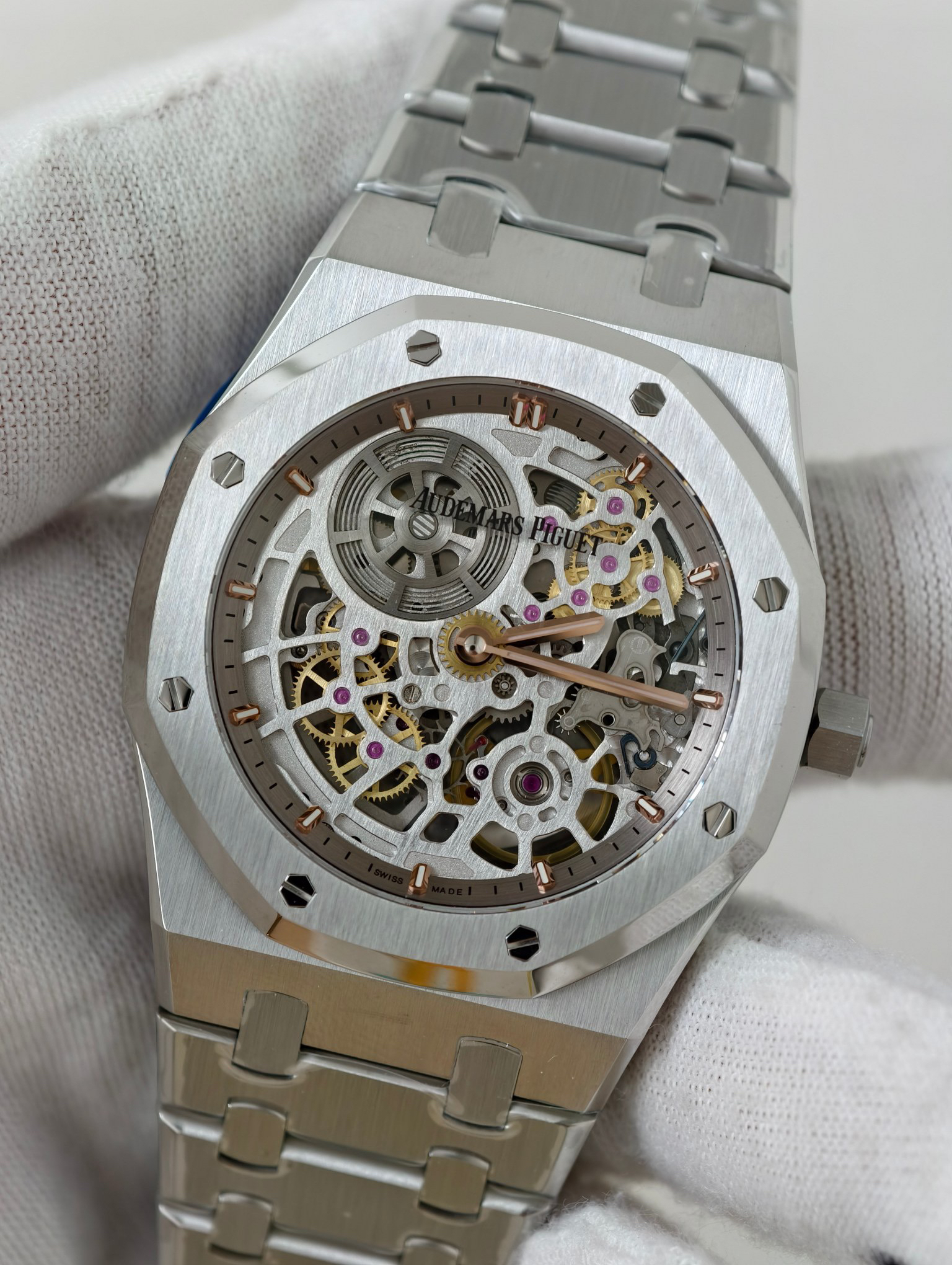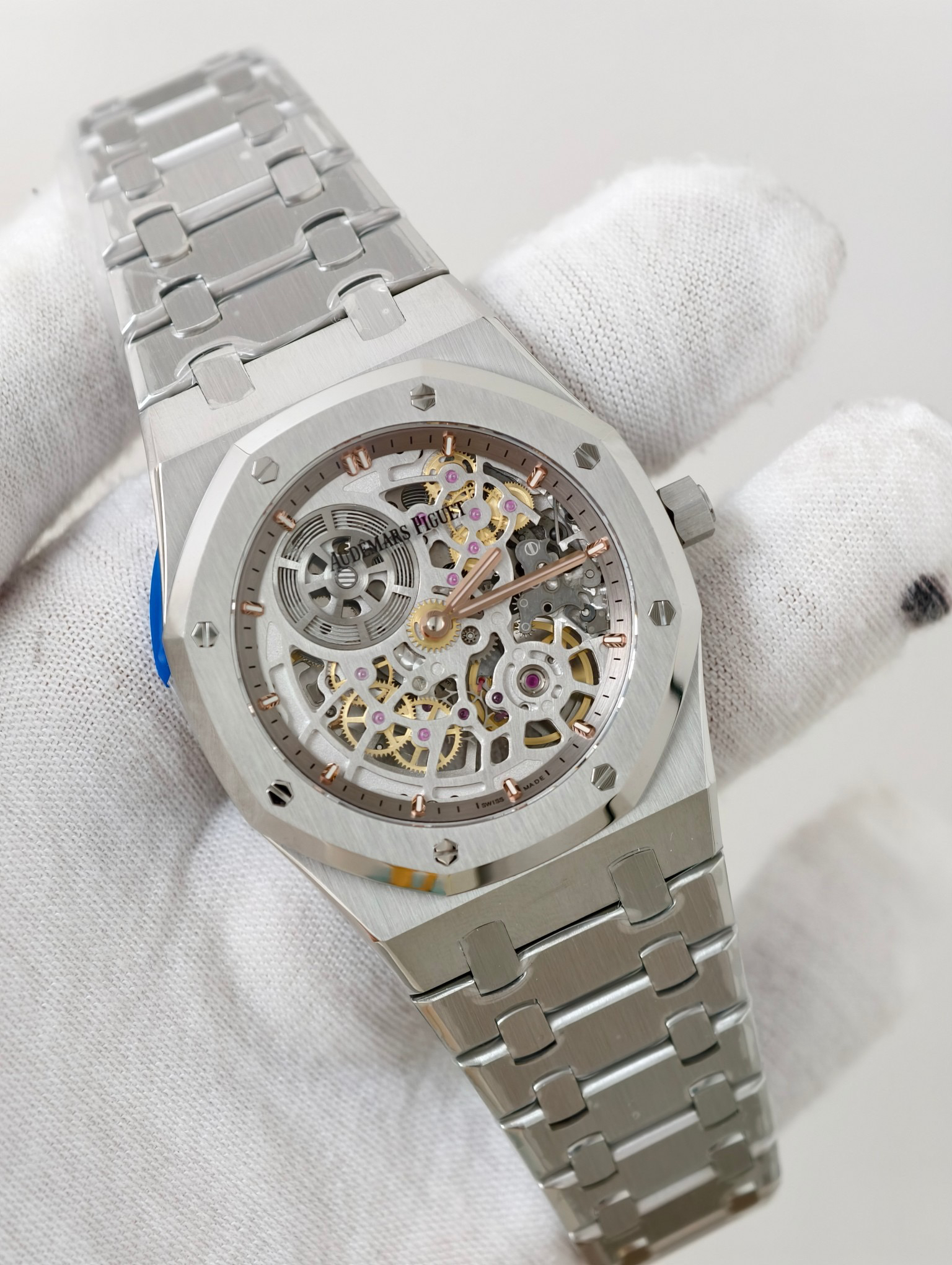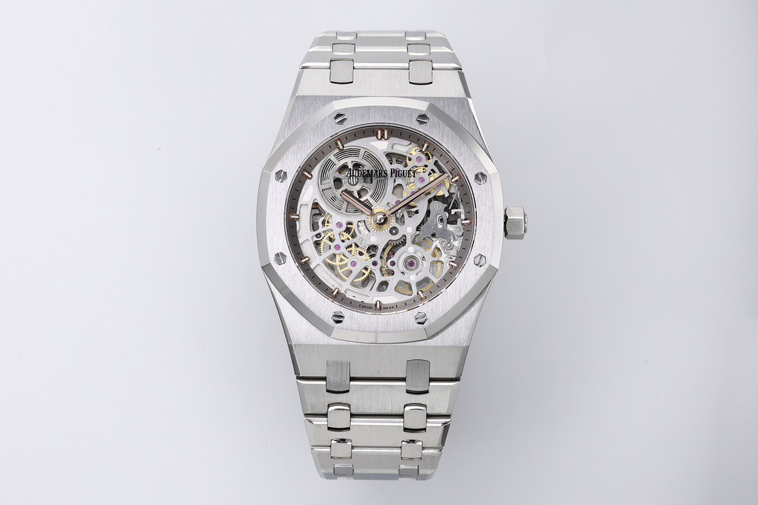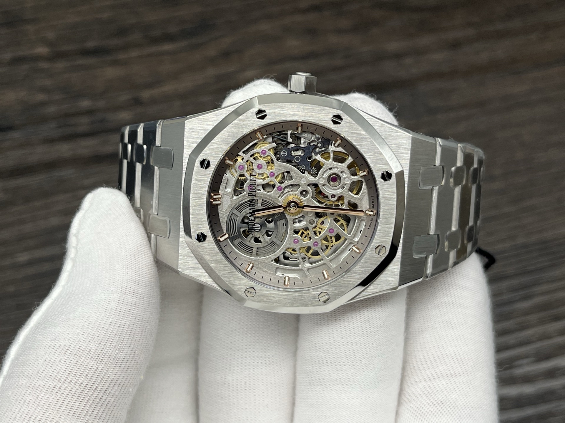 The highly recognizable octagonal 39MM case adopts advanced CNC machining technology to preliminarily cut and shape the stainless steel raw materials, and then uses exquisite wire drawing technology and forging surface polishing treatment to perfectly interweave on the case, presenting a unique luster and texture. The watch strap links are also produced through multiple complex polishing processes, making the surface of the links delicate, tightly connected, and flexible. Ensure comfort and fit when wearing. The AP logo on the watch buckle is finely carved, with clear lines and a three-dimensional steel structure. On the side of the case, the lugs naturally connect with the strap, creating a smooth transition and showcasing a harmonious beauty that is seamlessly integrated!