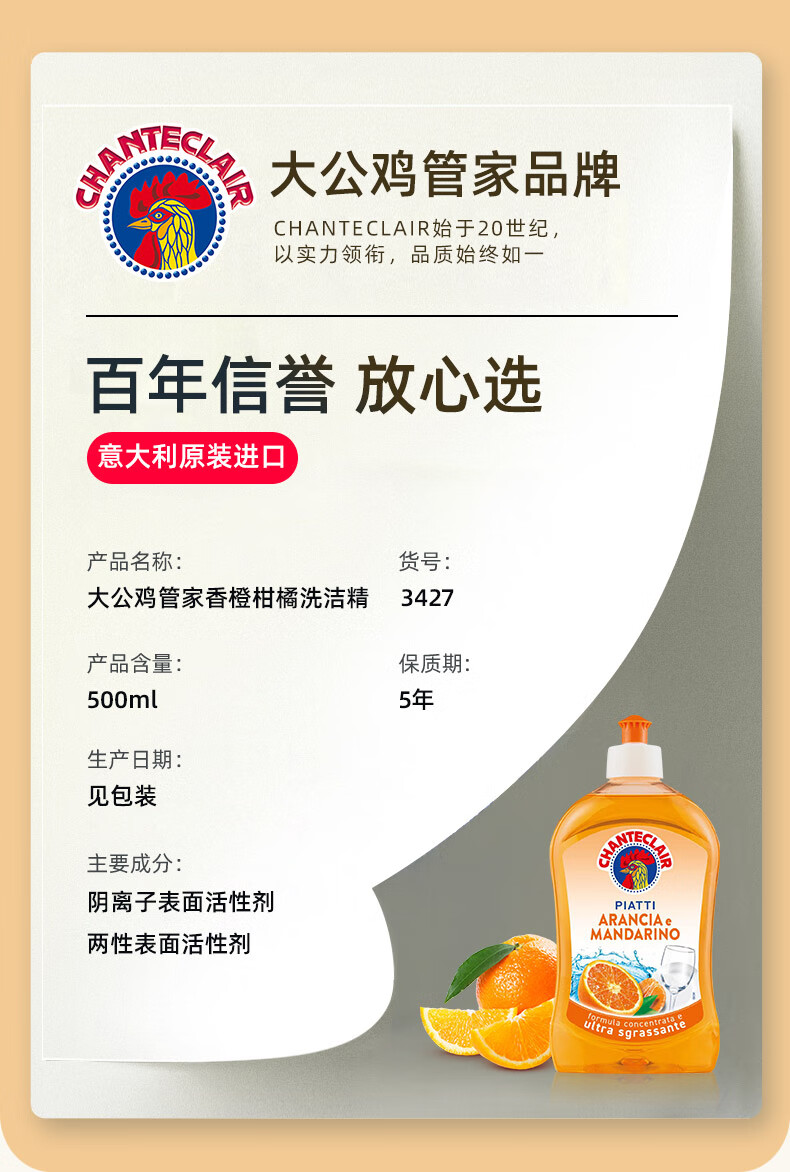 大公鸡管家洗洁精(香橙味)500ml(新老包装随机发货哦~)