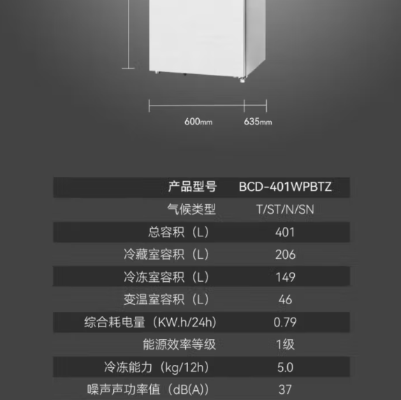 美菱 冰箱 BCD-401WPBTZ盐湖白 401升 两门 超薄嵌入 一级能效 风冷 变频 电脑控温 底部散热 盐湖白颜色 断电记忆