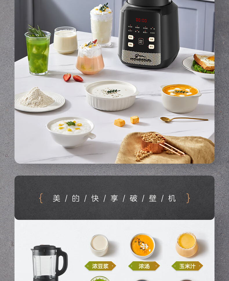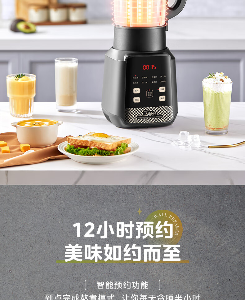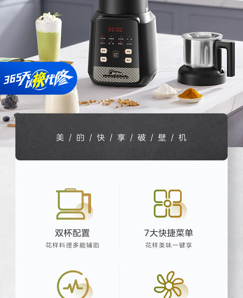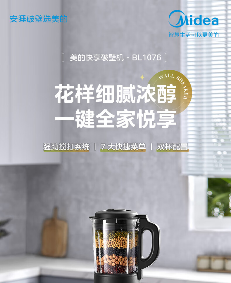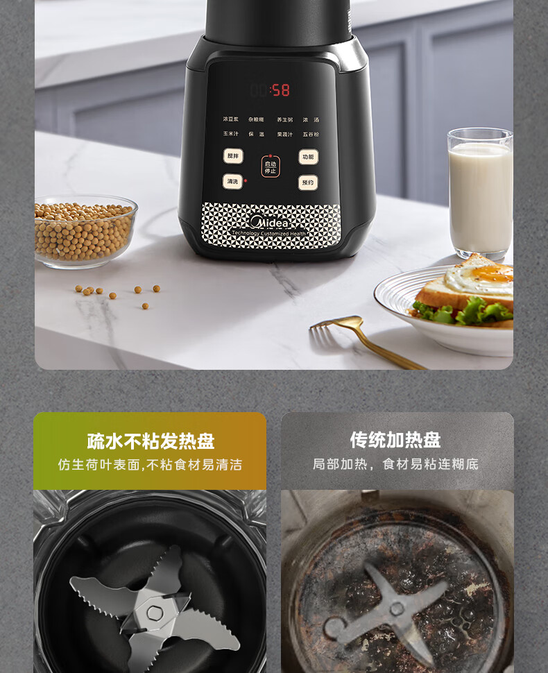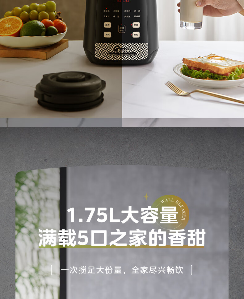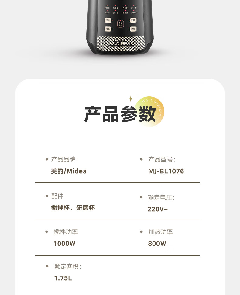 美的(Midea)破壁机料理机加热大功率豆浆研磨杯果汁双杯1000W烧汤奶昔BL1076高硼硅玻璃六页 黑色