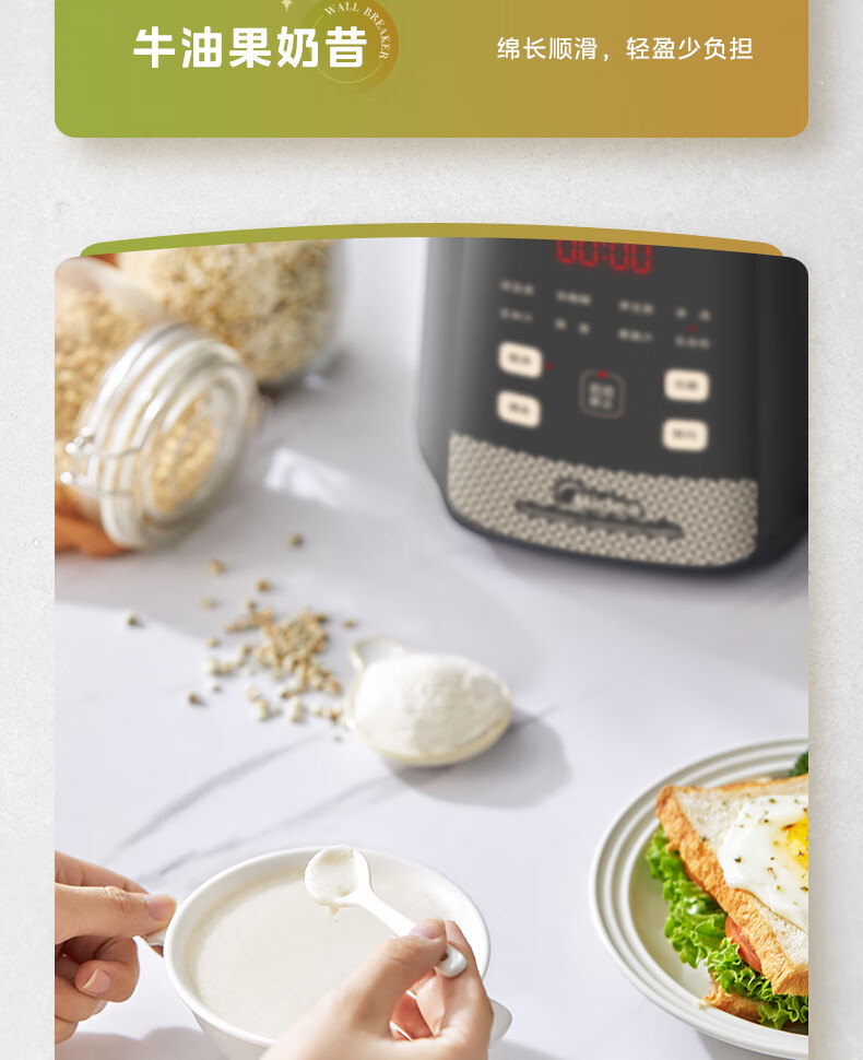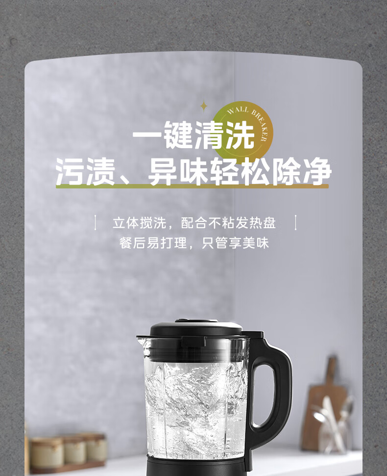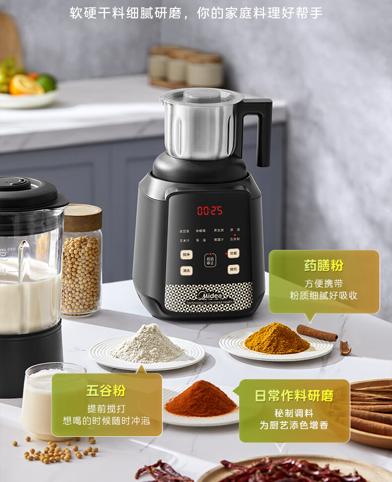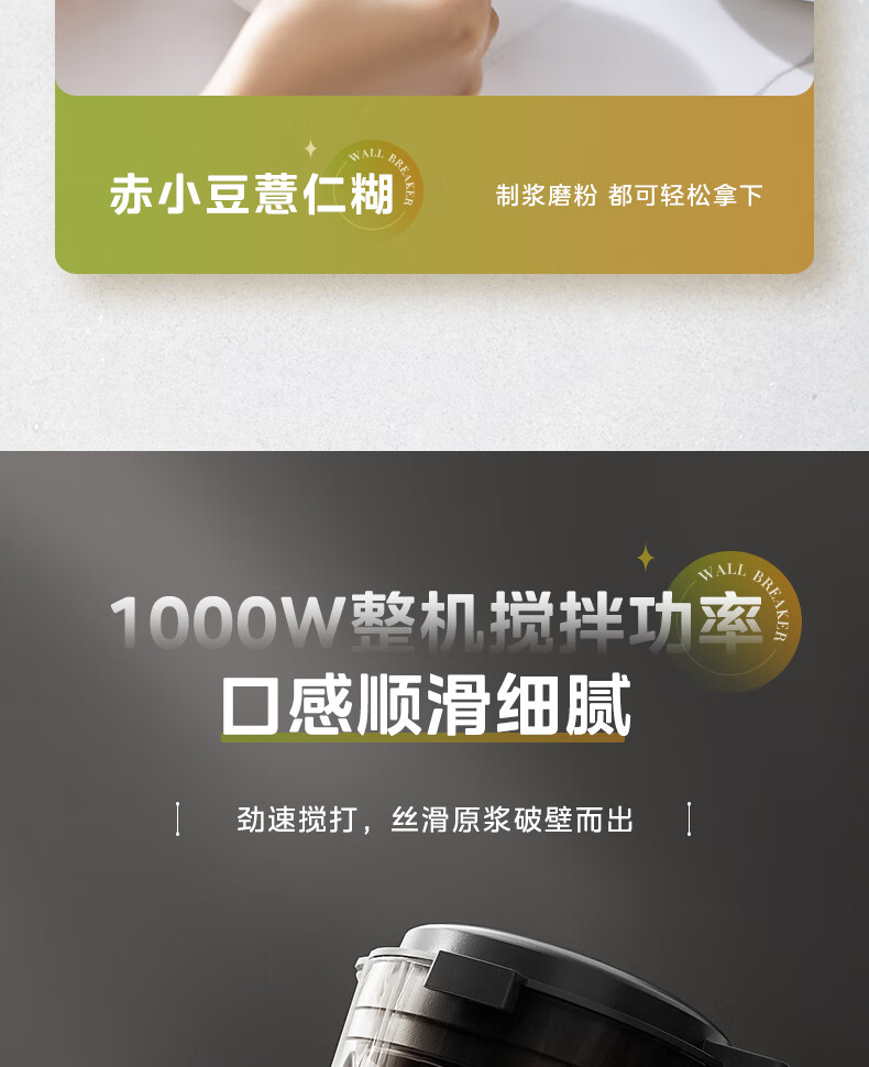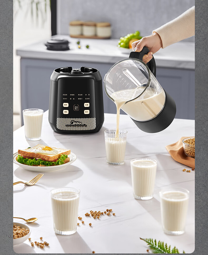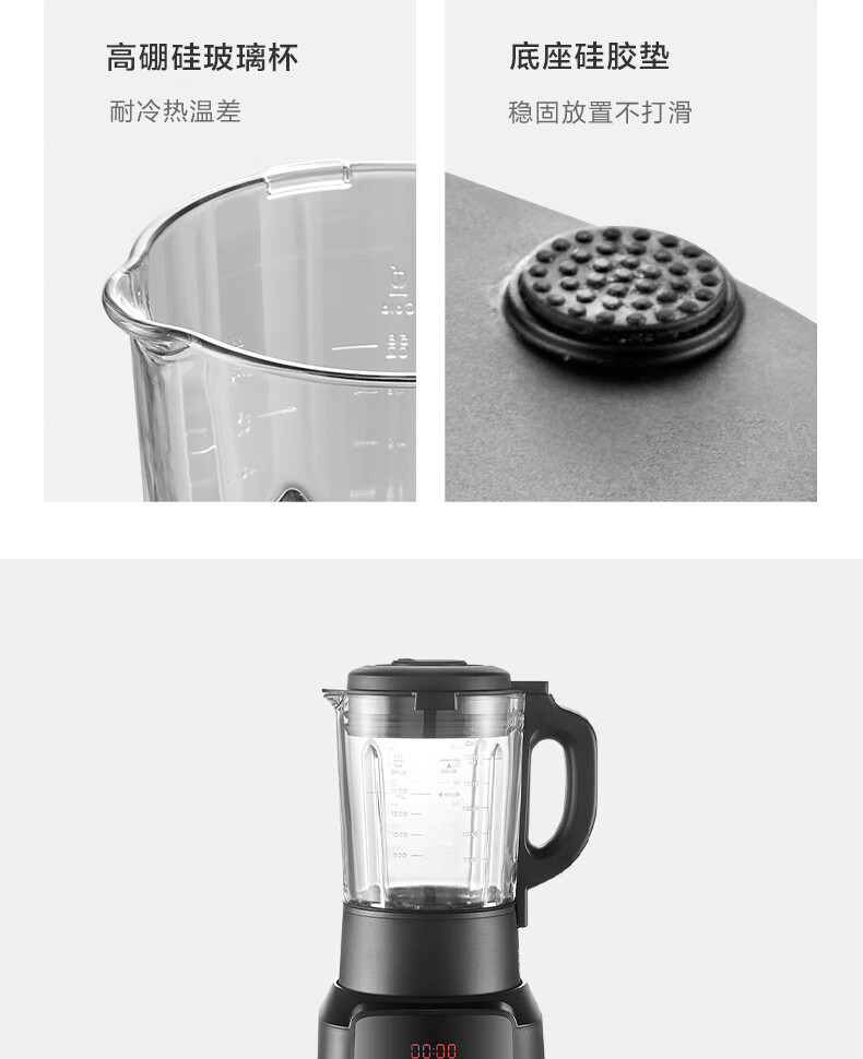 美的(Midea)破壁机料理机加热大功率豆浆研磨杯果汁双杯1000W烧汤奶昔BL1076高硼硅玻璃六页 黑色