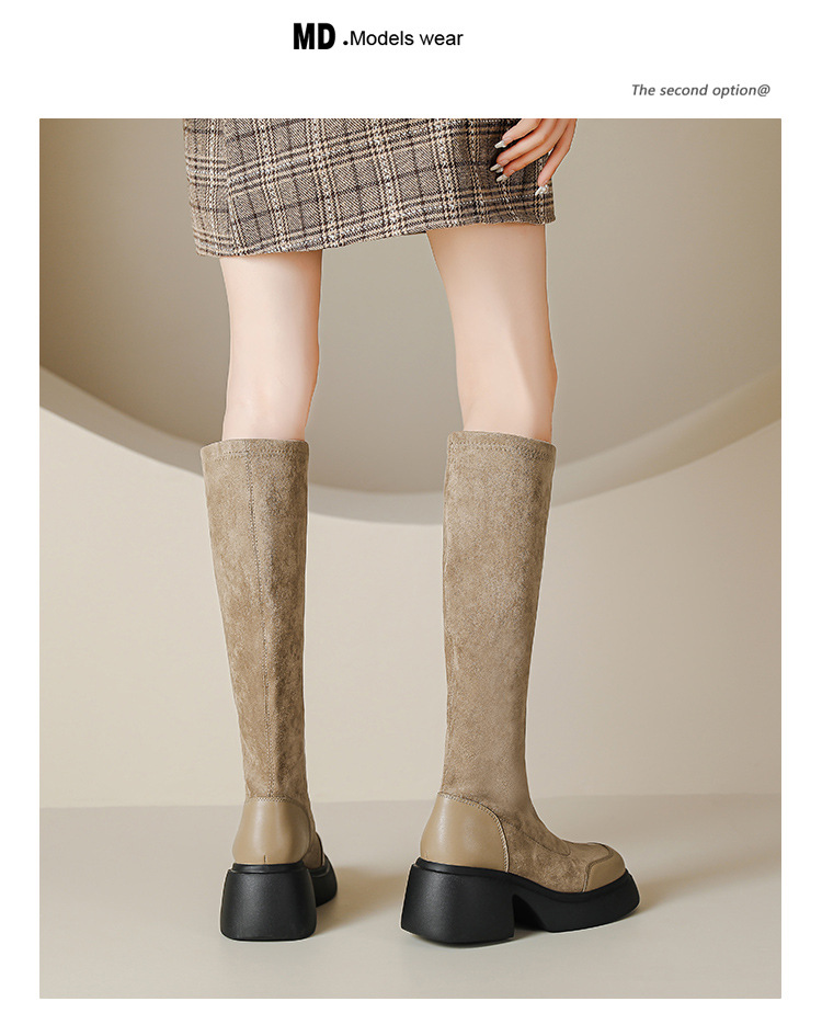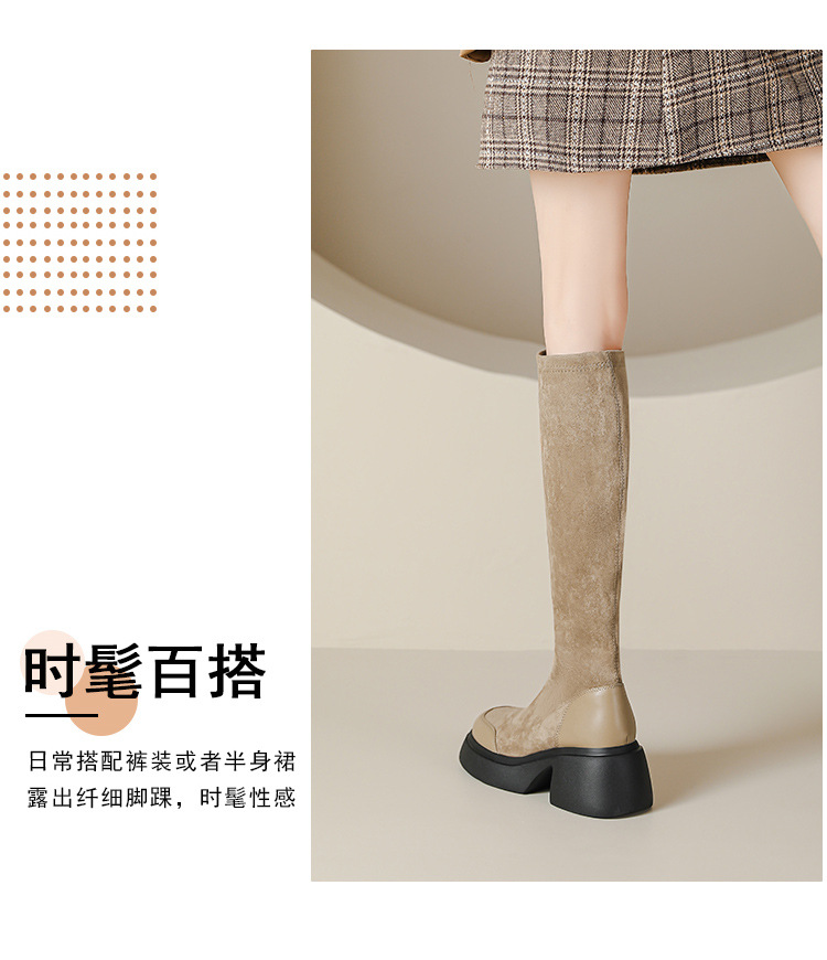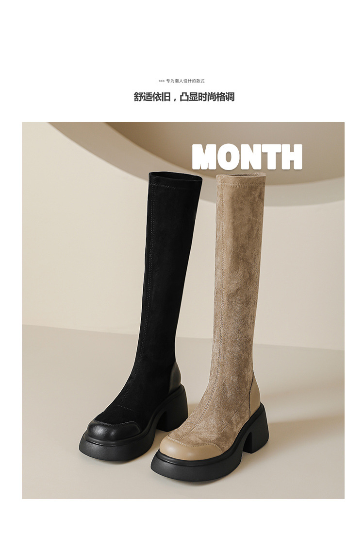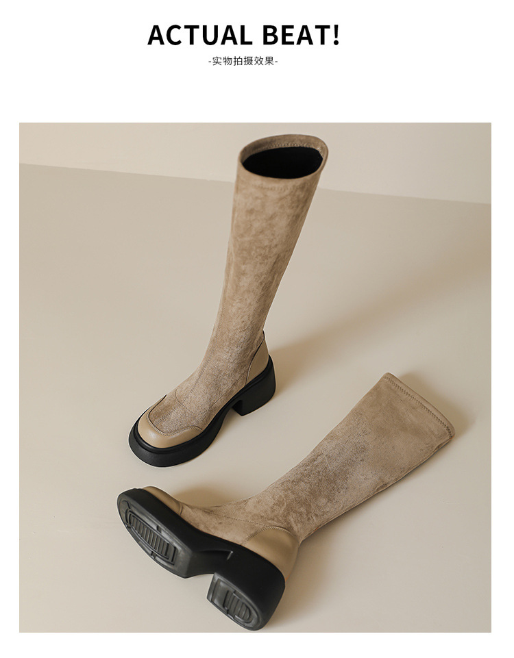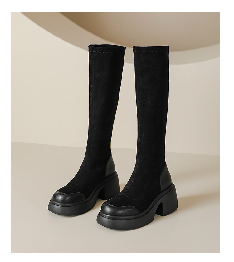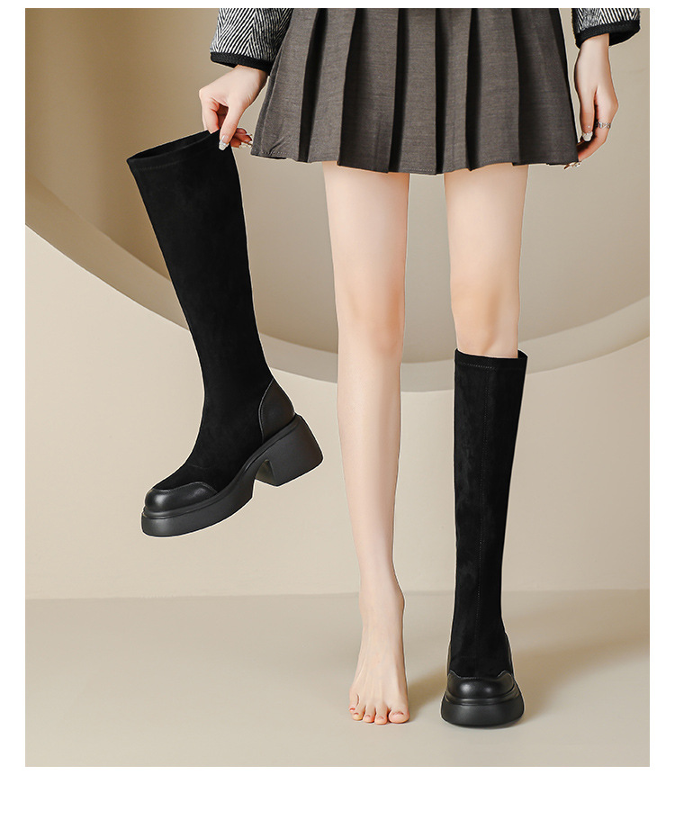 绒面厚底马丁靴长靴女秋冬款粗跟7cm高跟防水台轻底弹力显瘦高靴