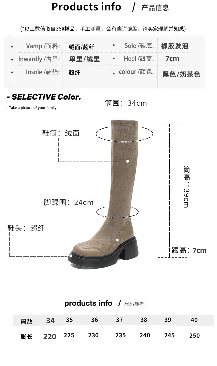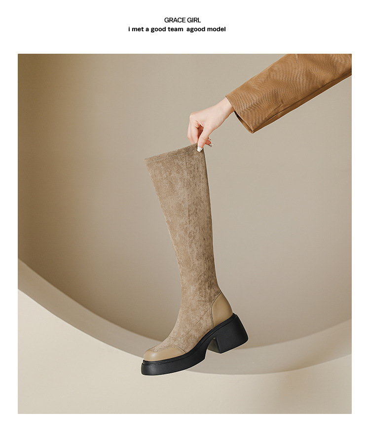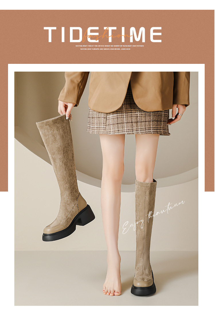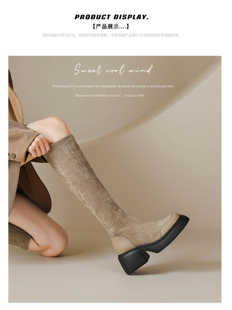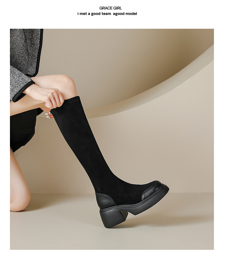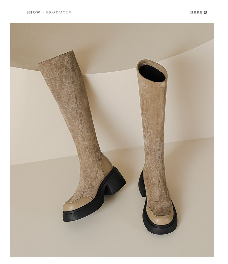 绒面厚底马丁靴长靴女秋冬款粗跟7cm高跟防水台轻底弹力显瘦高靴