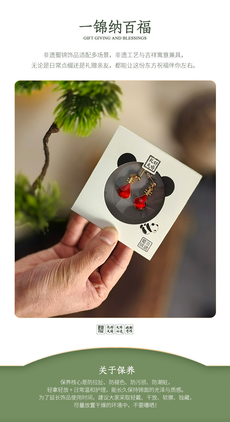 特别说明:每一件饰品图案,都是蜀锦的独特切片。因面料裁剪位置不同,图案随机分布,所以每一件的花纹位置都不一样,每一款都是独一份的。