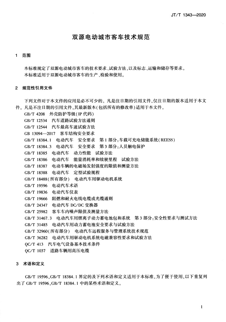 双源电动城市客车技术规范(JT/T 1343-2020)