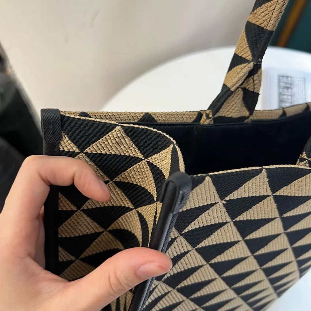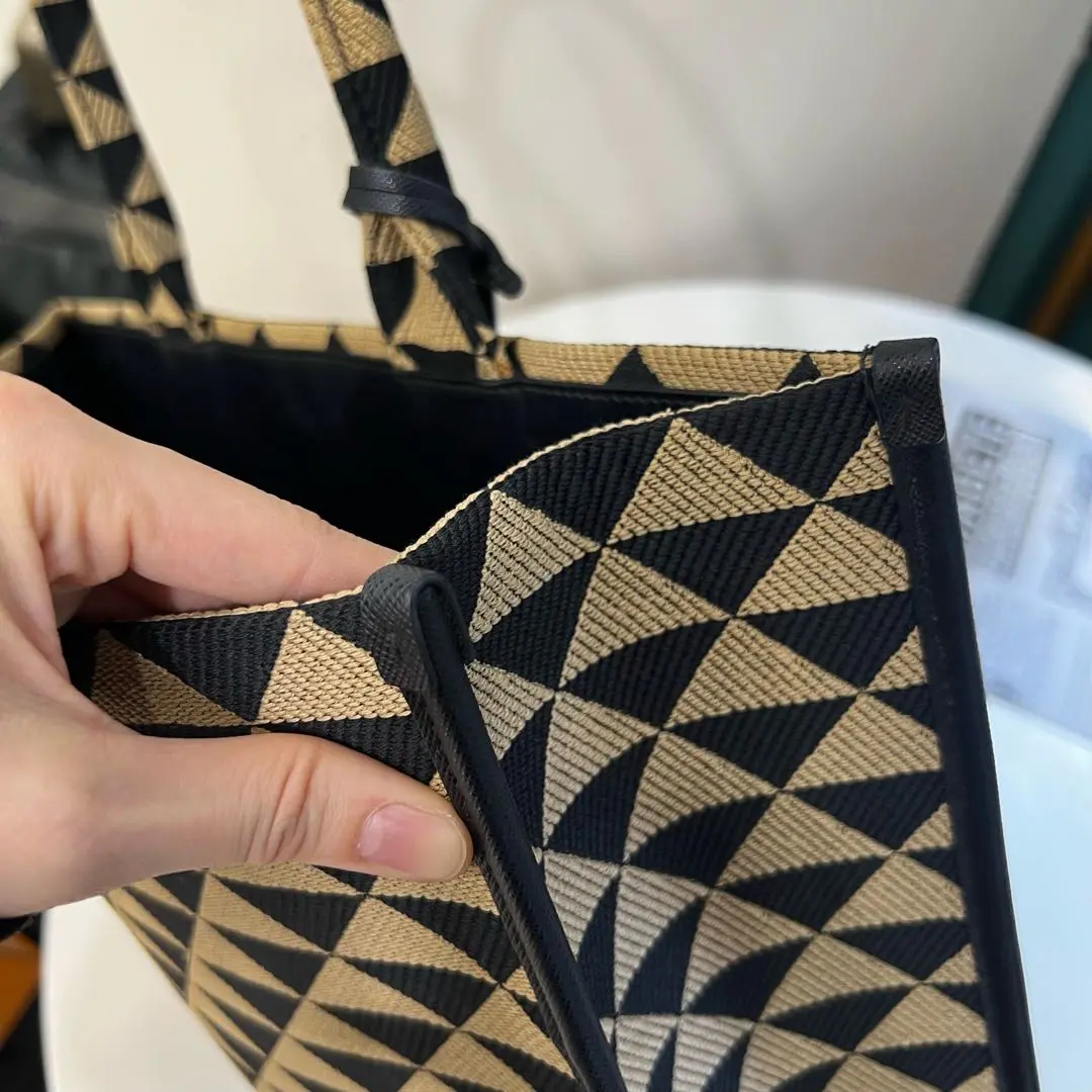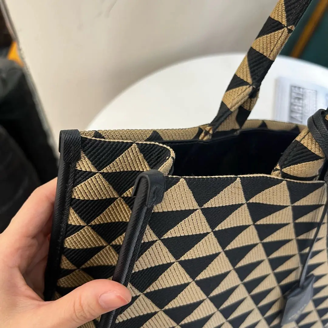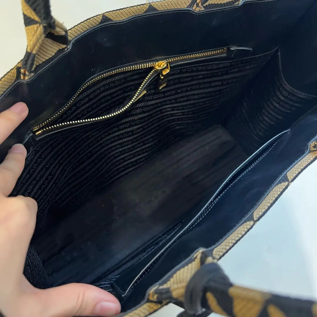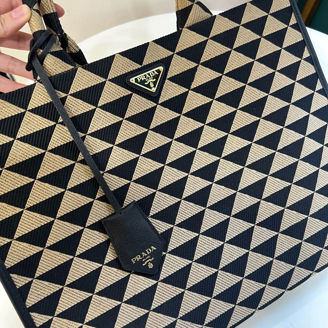 【商品详情】正品二手 Prada Symbole 黑色拼米色 刺绣三角 大号 托特包🍉95新 38x29 配件:挂件。内里正常使用脏。ss22春夏系列 织物倒三角 Prada的特殊印记