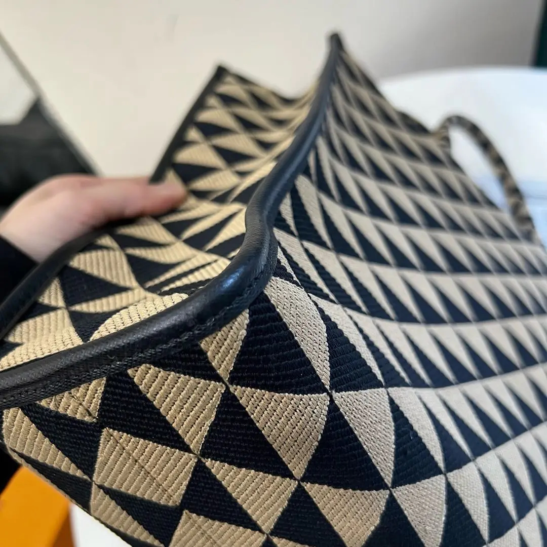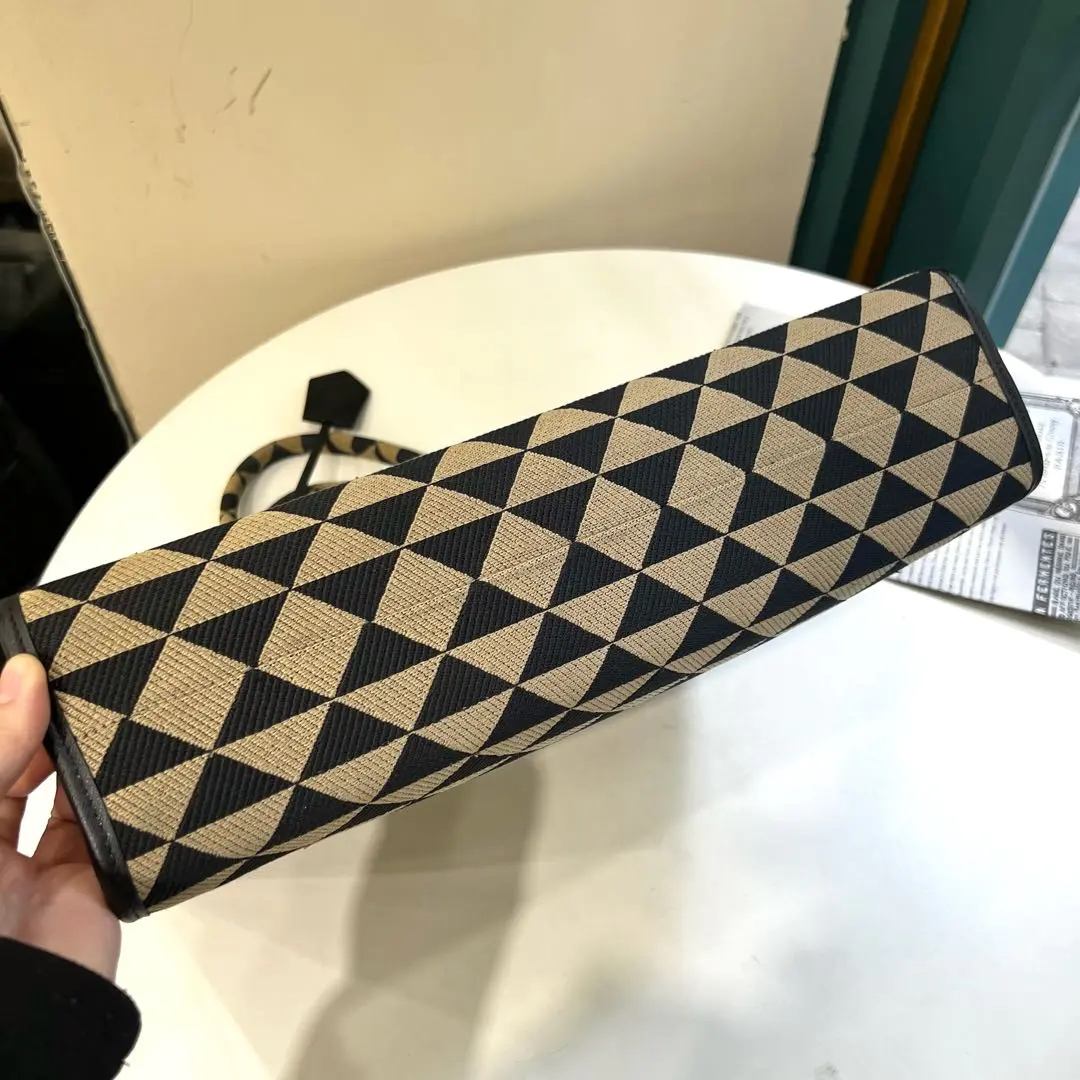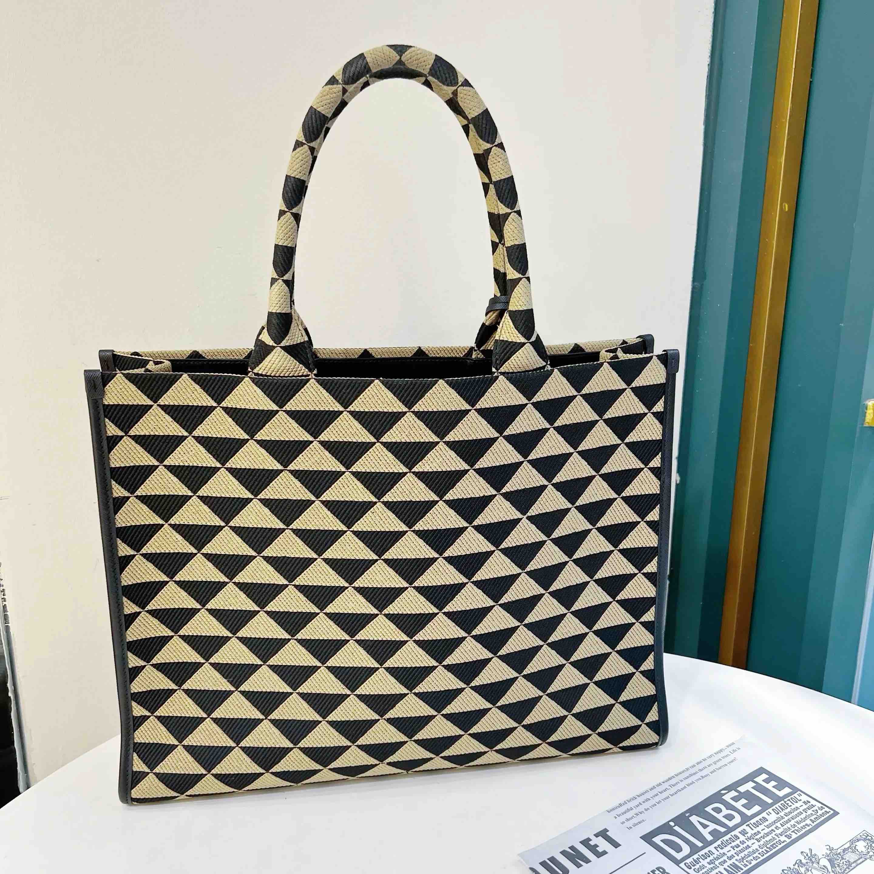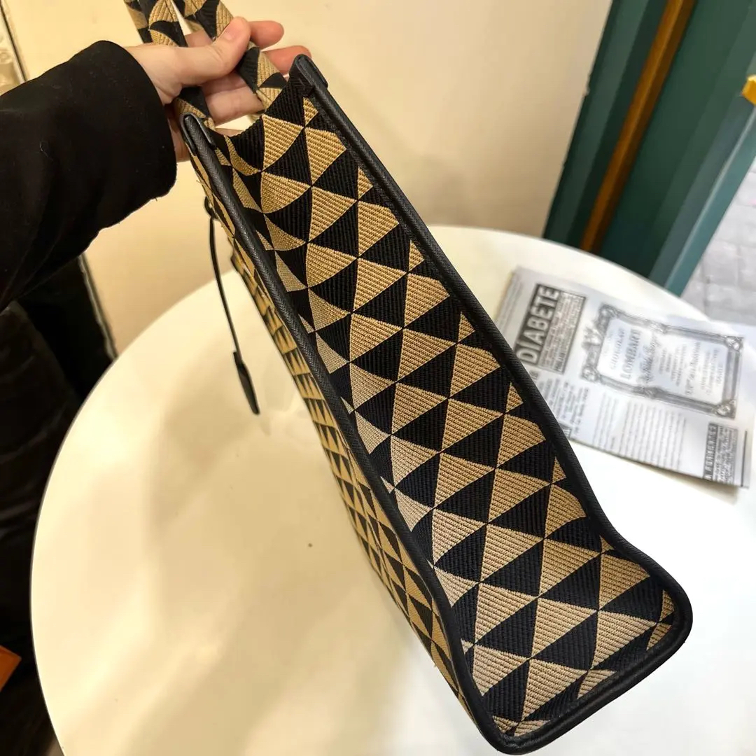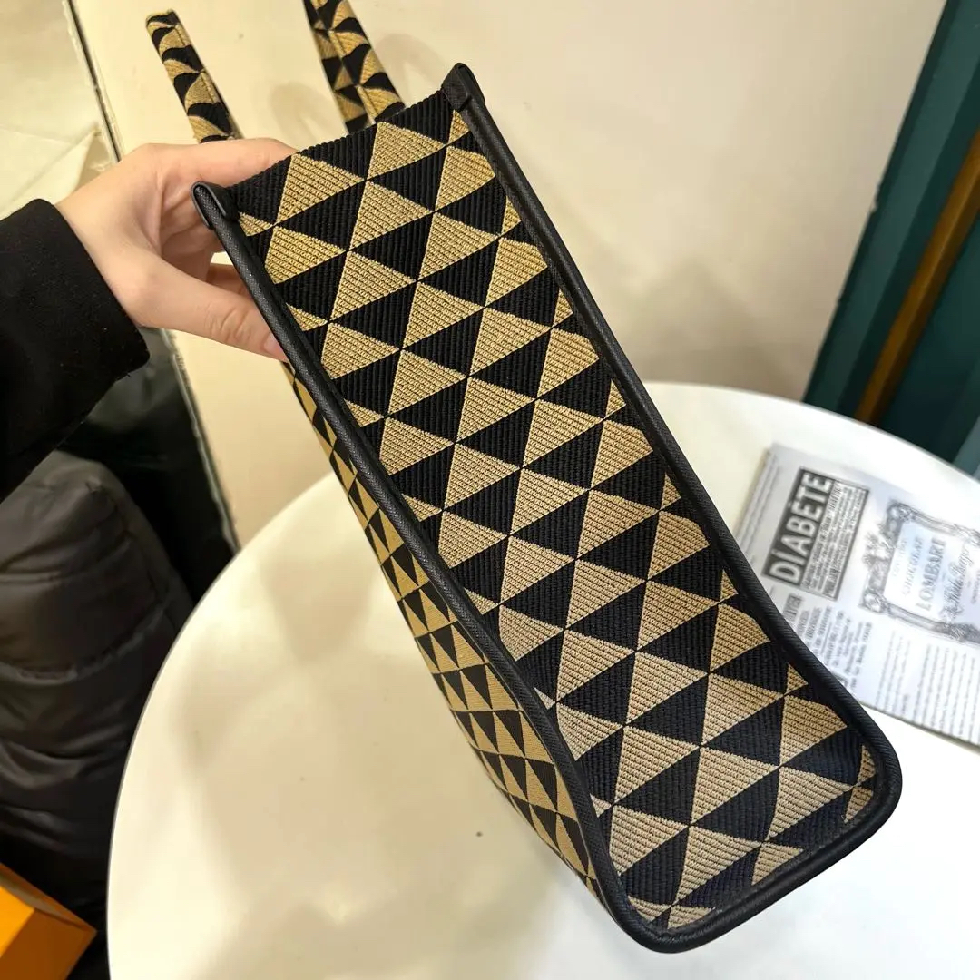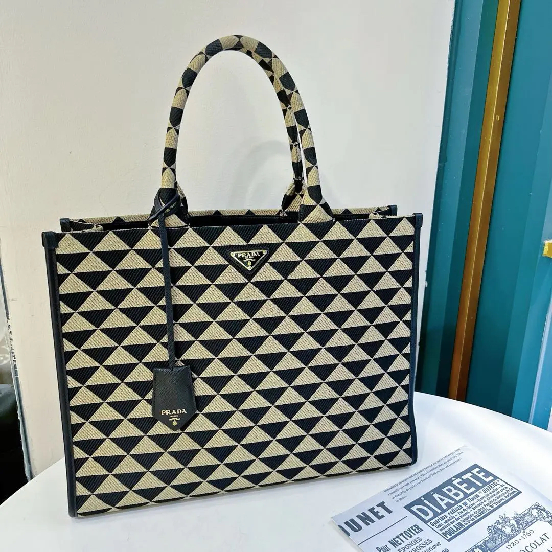 【商品详情】正品二手 Prada Symbole 黑色拼米色 刺绣三角 大号 托特包🍉95新 38x29 配件:挂件。内里正常使用脏。ss22春夏系列 织物倒三角 Prada的特殊印记