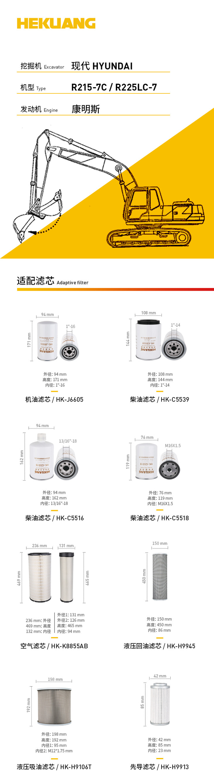 现代R215-7C、R225LC-7(康明斯)挖掘机滤芯 机油柴油空气滤芯 液压油先导滤芯