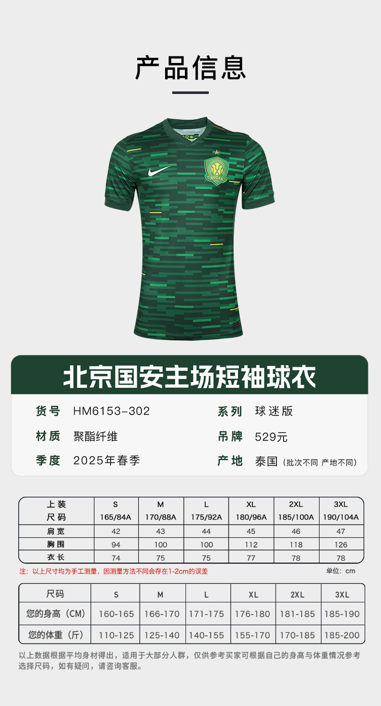 NIKE/耐克 AS BJGA M NK DF JSY SS STAD HM 2025中超联赛 北京国安 主场短袖球衣 球迷版 HM6153-302