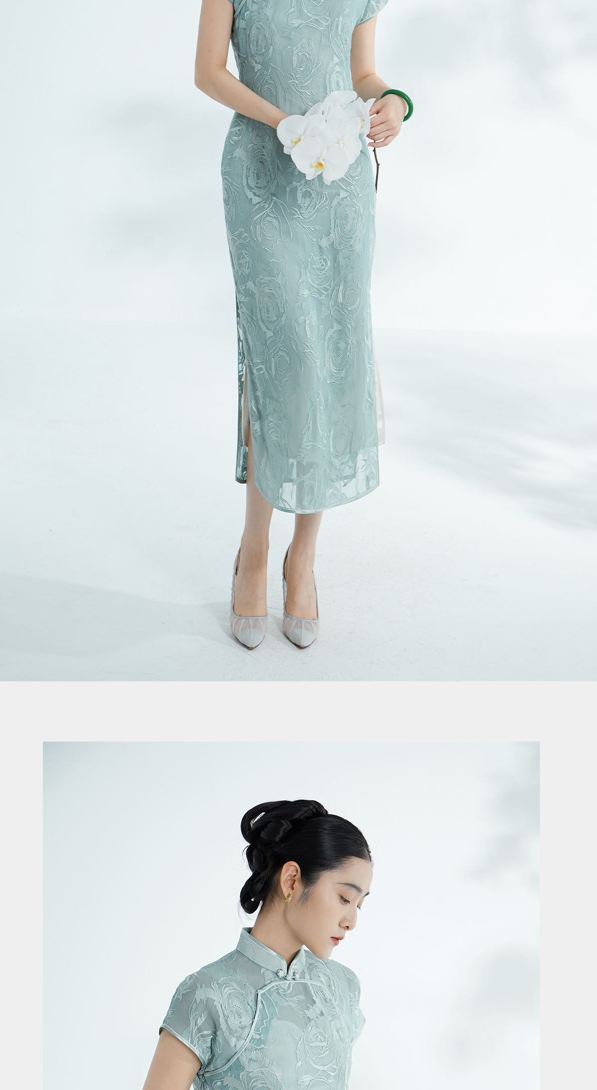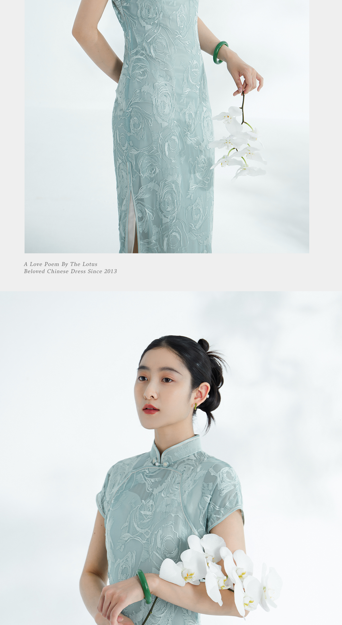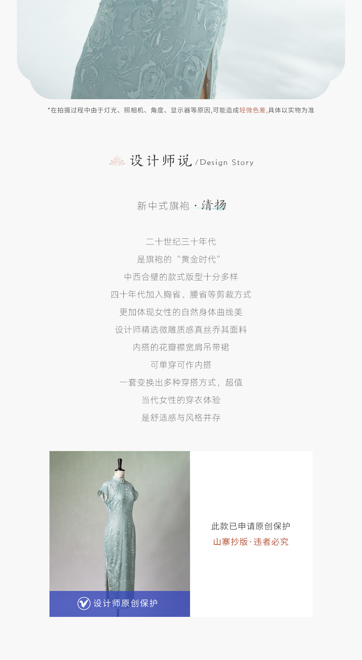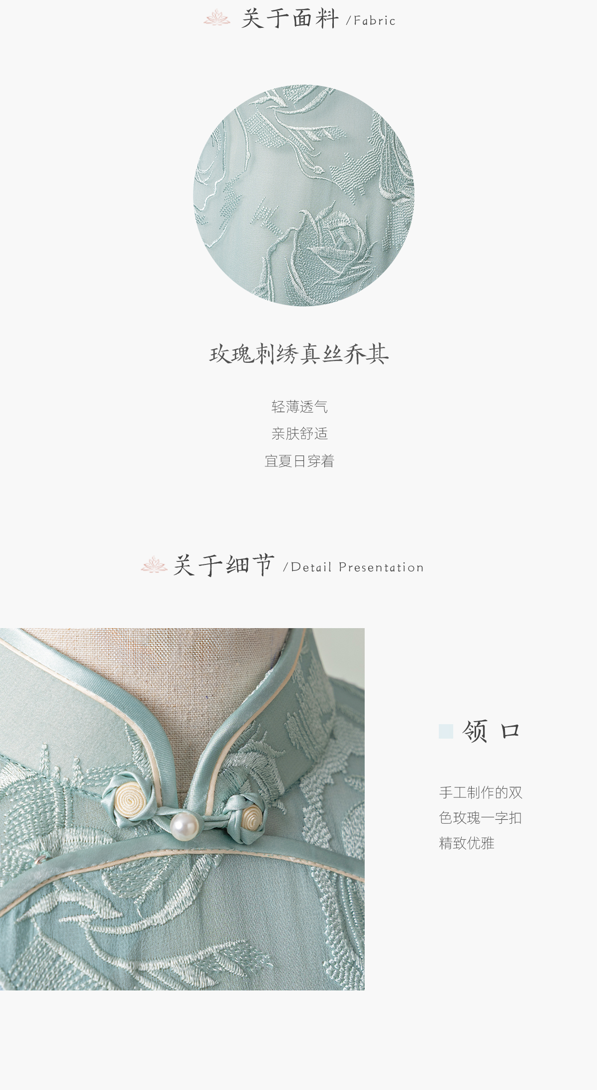 荷言GL 清扬 水蓝色玫瑰刺绣真丝乔其旗袍两件套