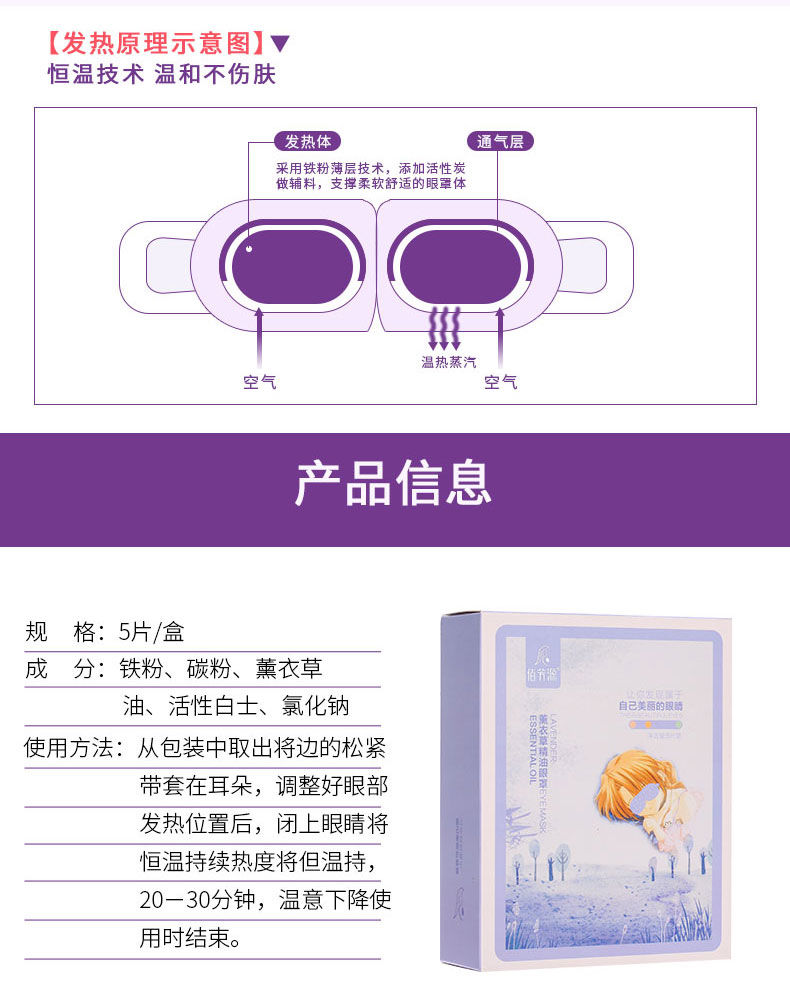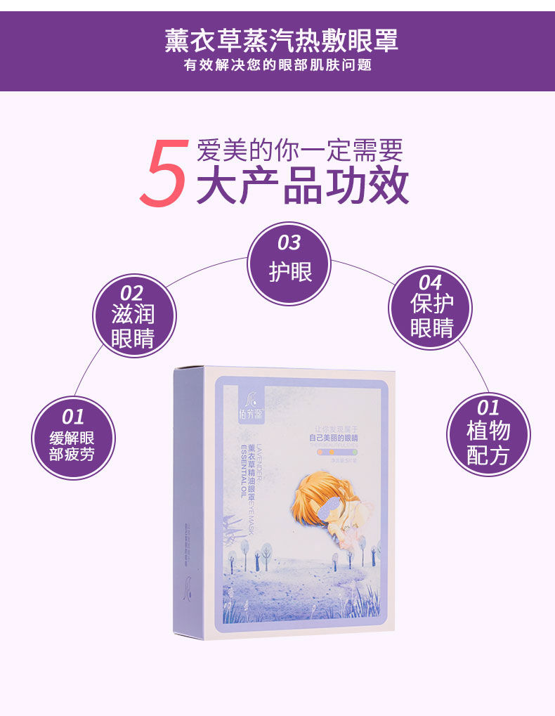 佰芳源薰衣草精油舒缓眼罩5片睡眠蒸汽缓解眼疲劳透气眼部眼罩