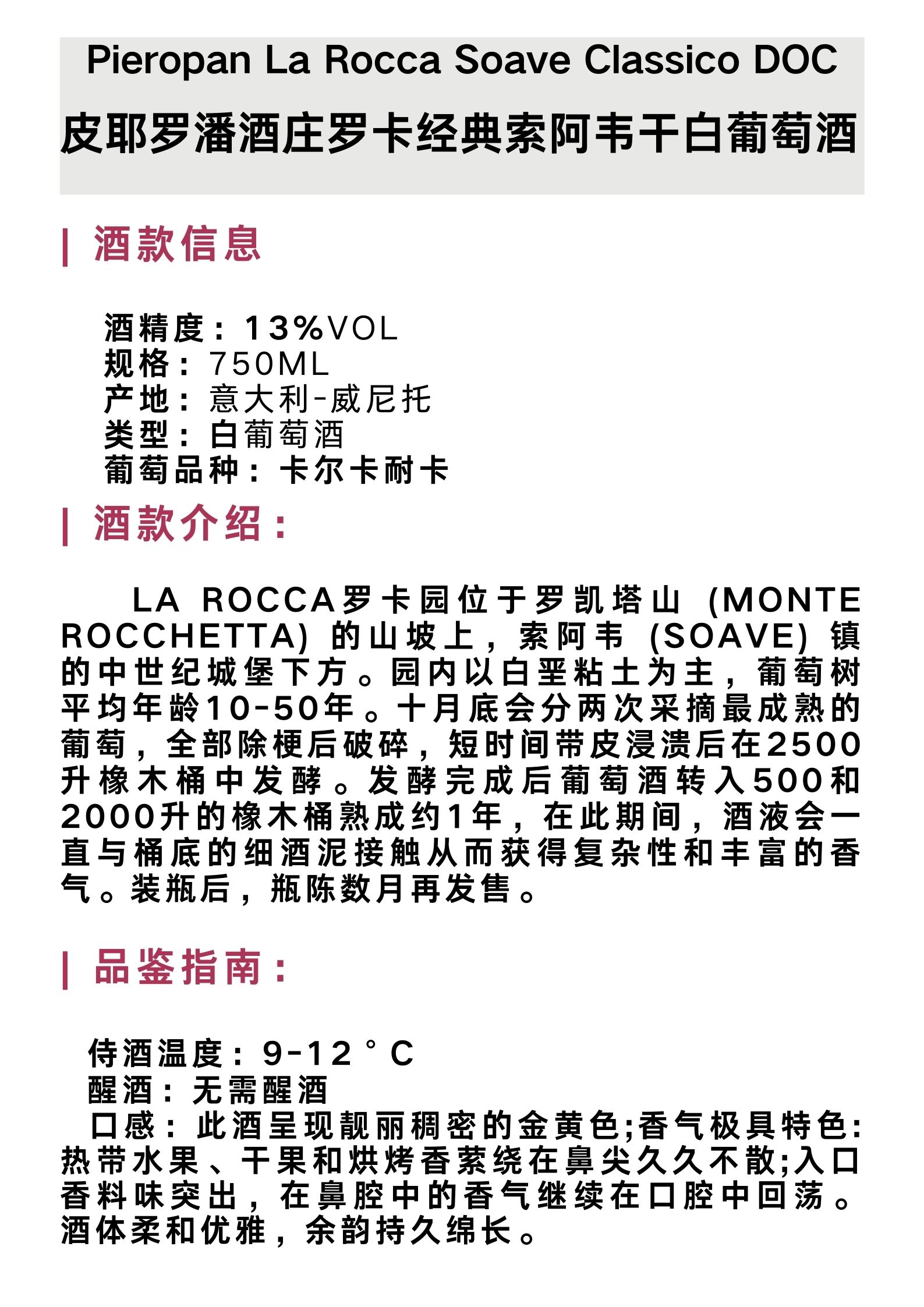 皮耶罗潘酒庄罗卡单一园经典索阿韦干白葡萄酒