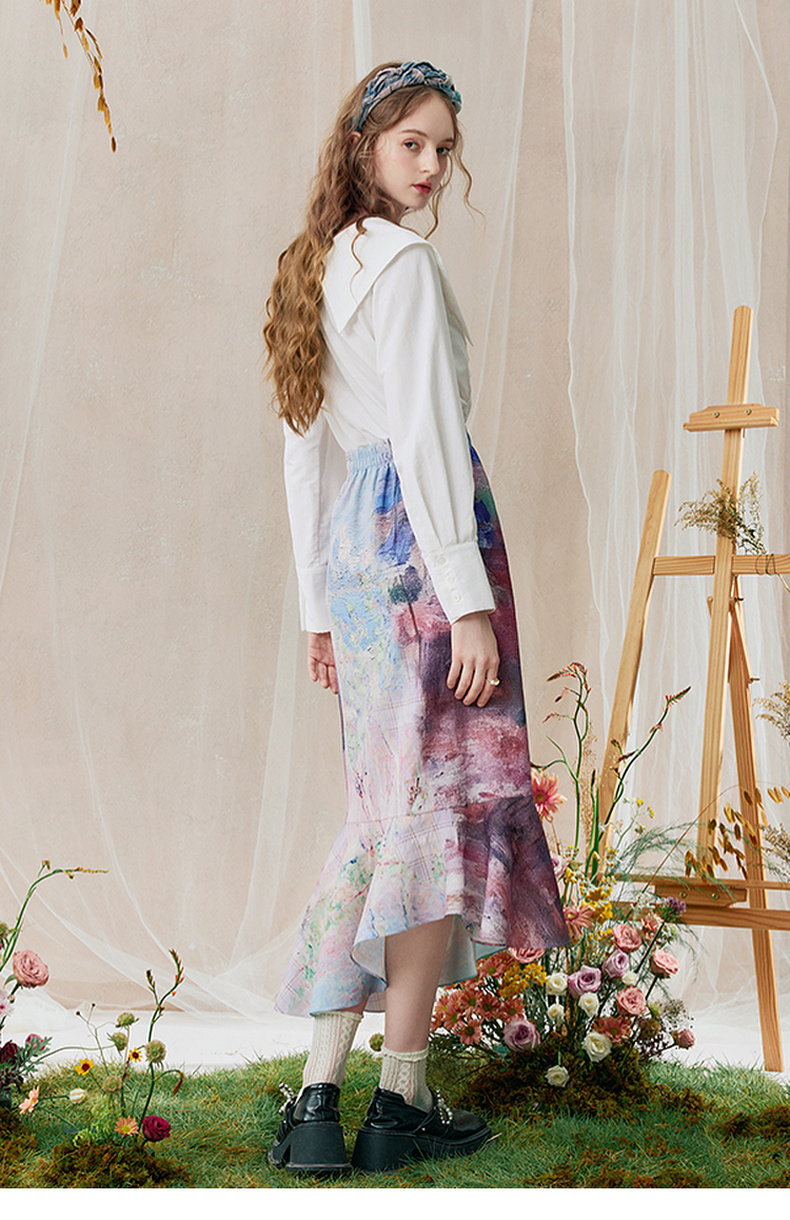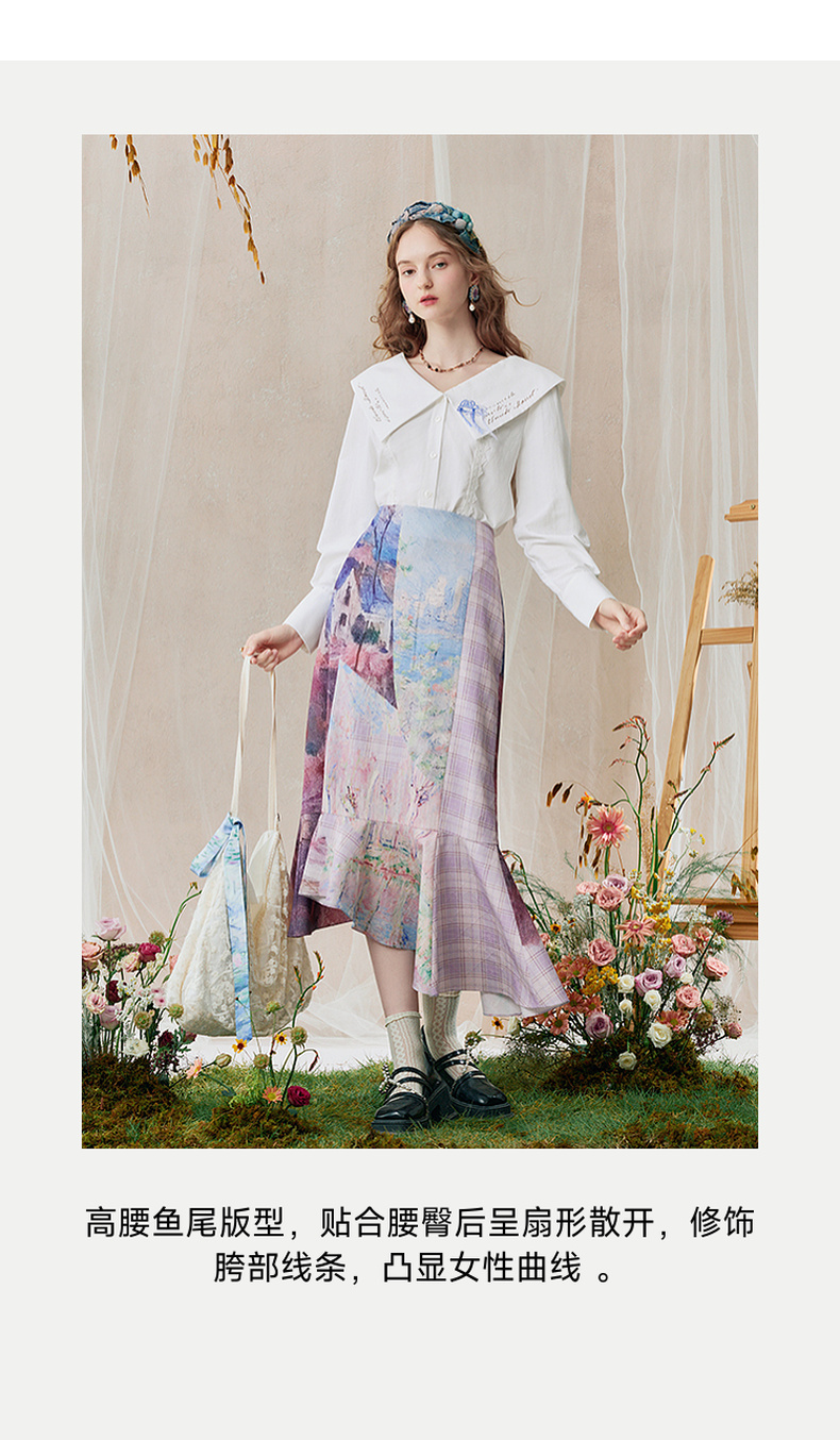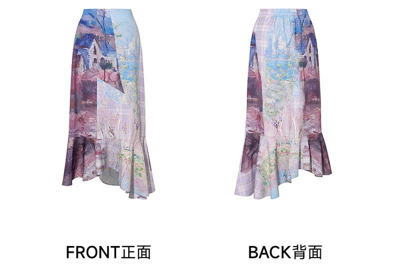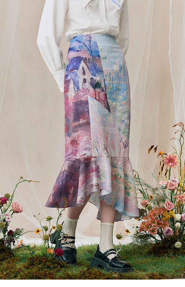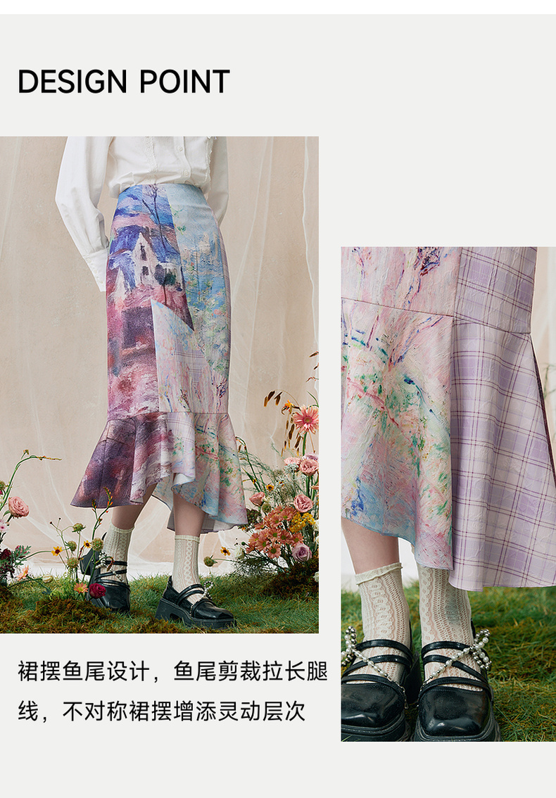 两三事 霓虹迷浪 2025秋季新款复古印花包臀鱼尾裙不对称半身裙