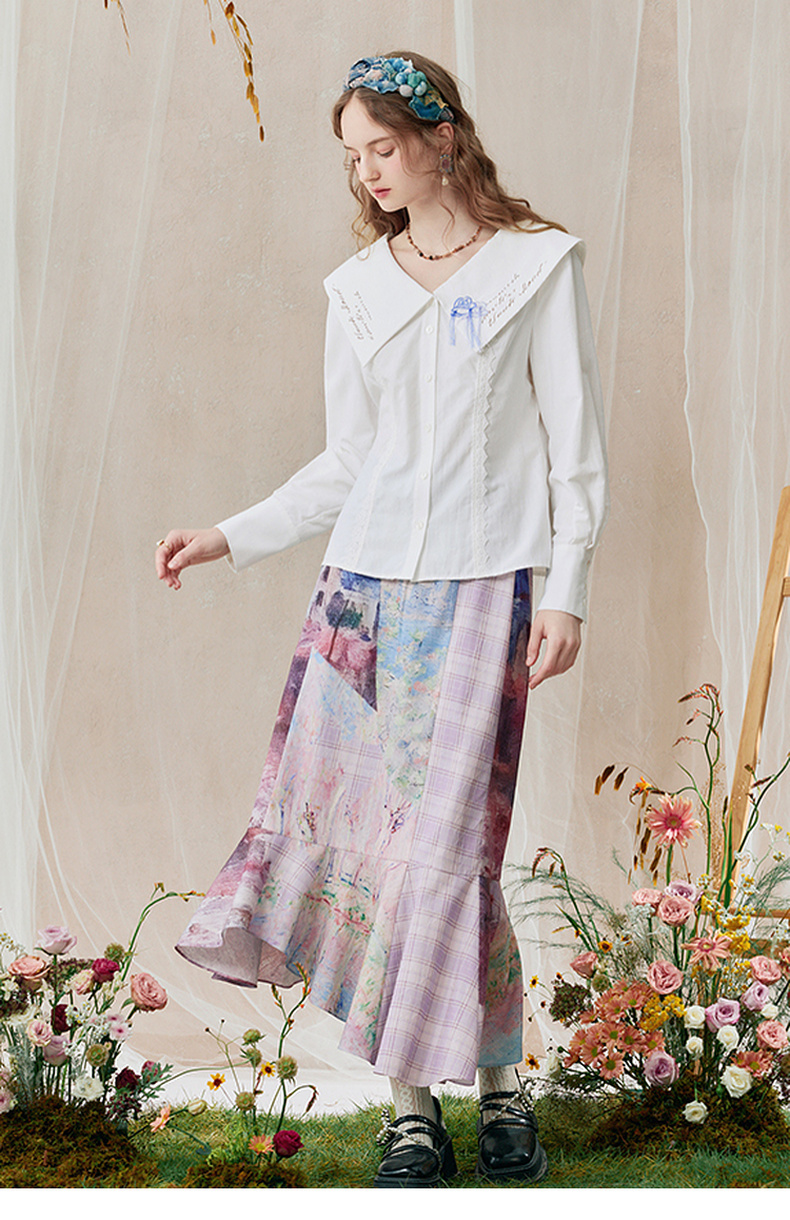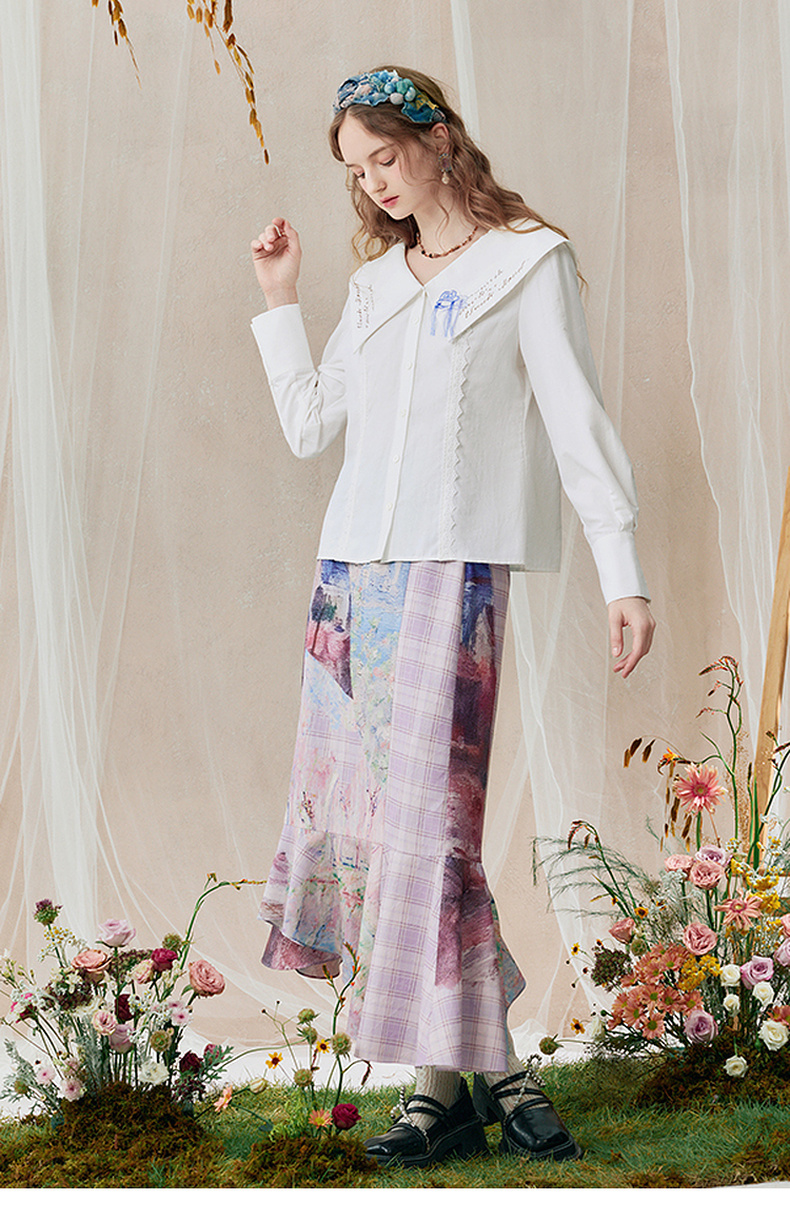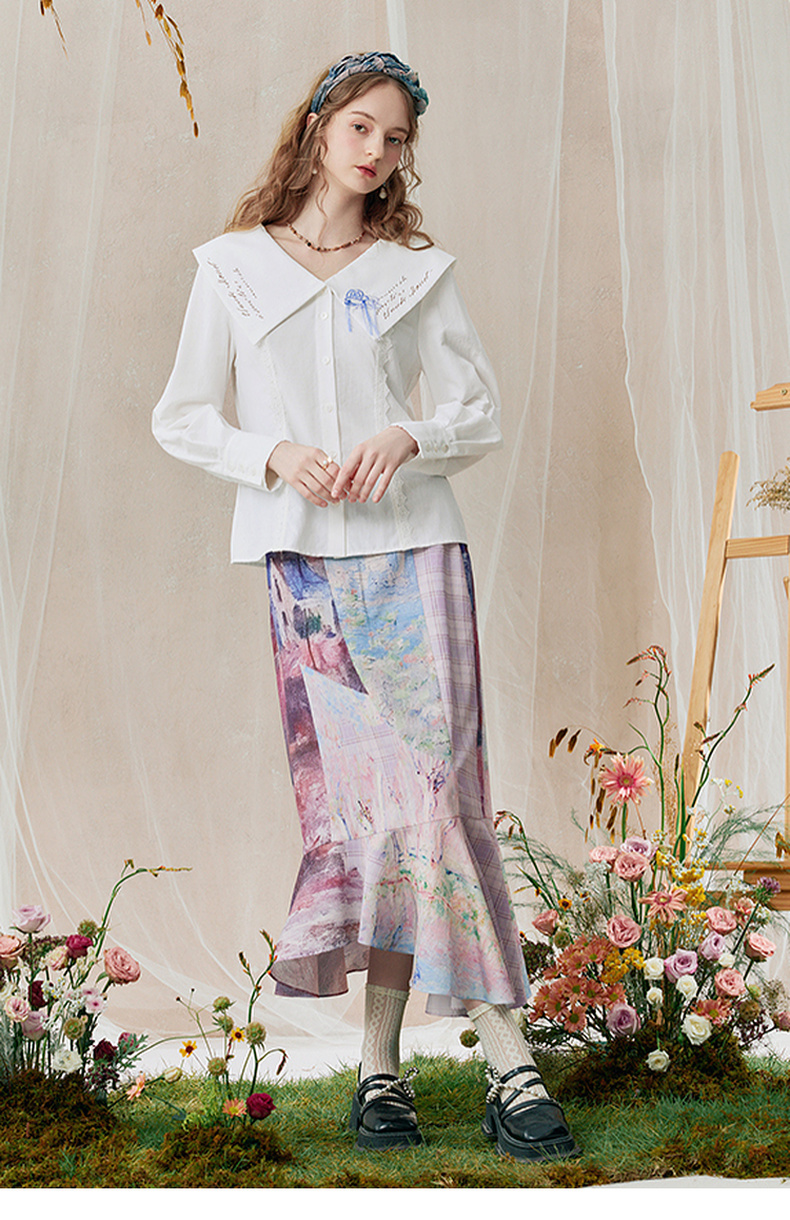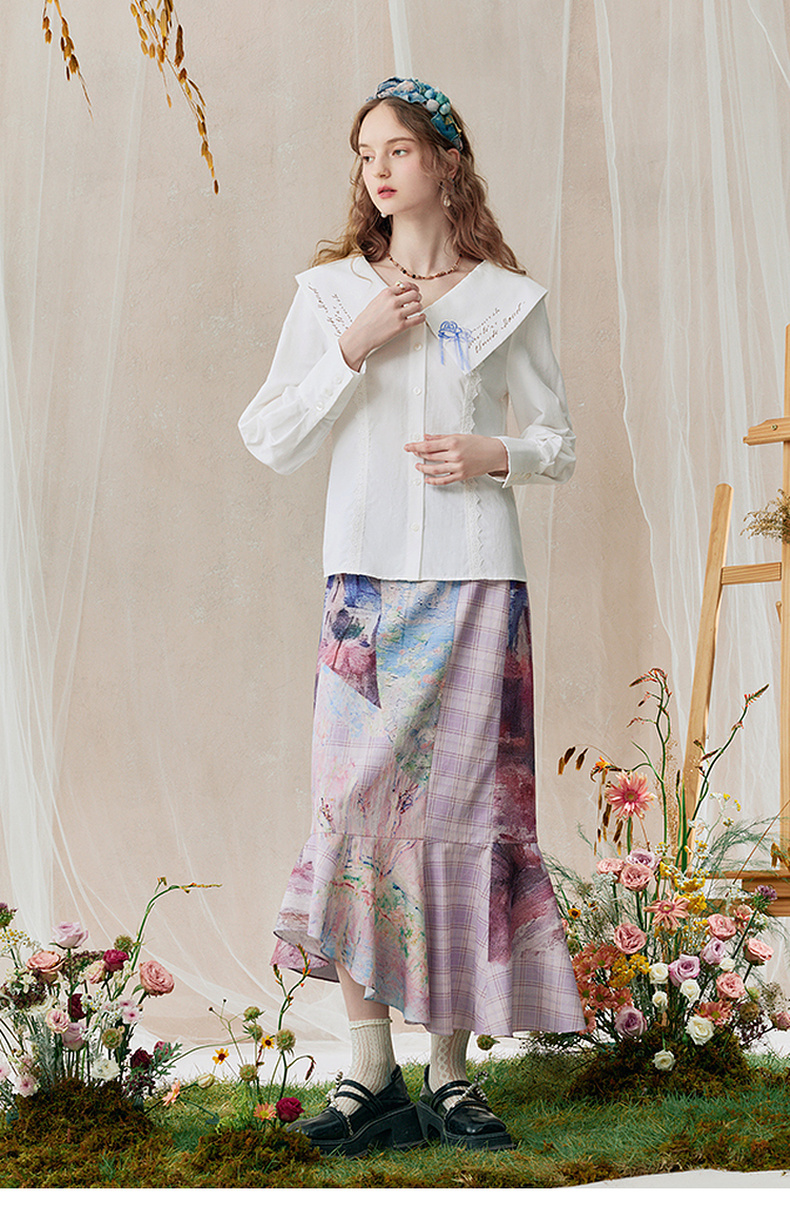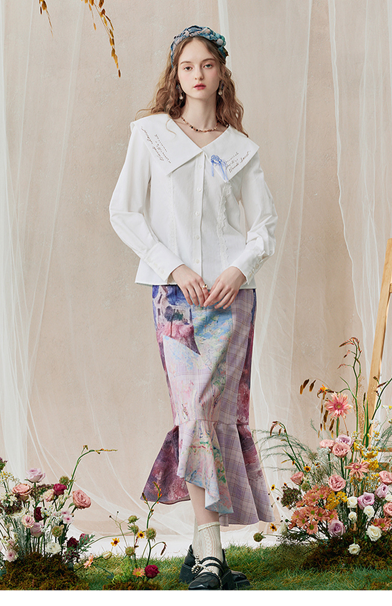 两三事 霓虹迷浪 2025秋季新款复古印花包臀鱼尾裙不对称半身裙