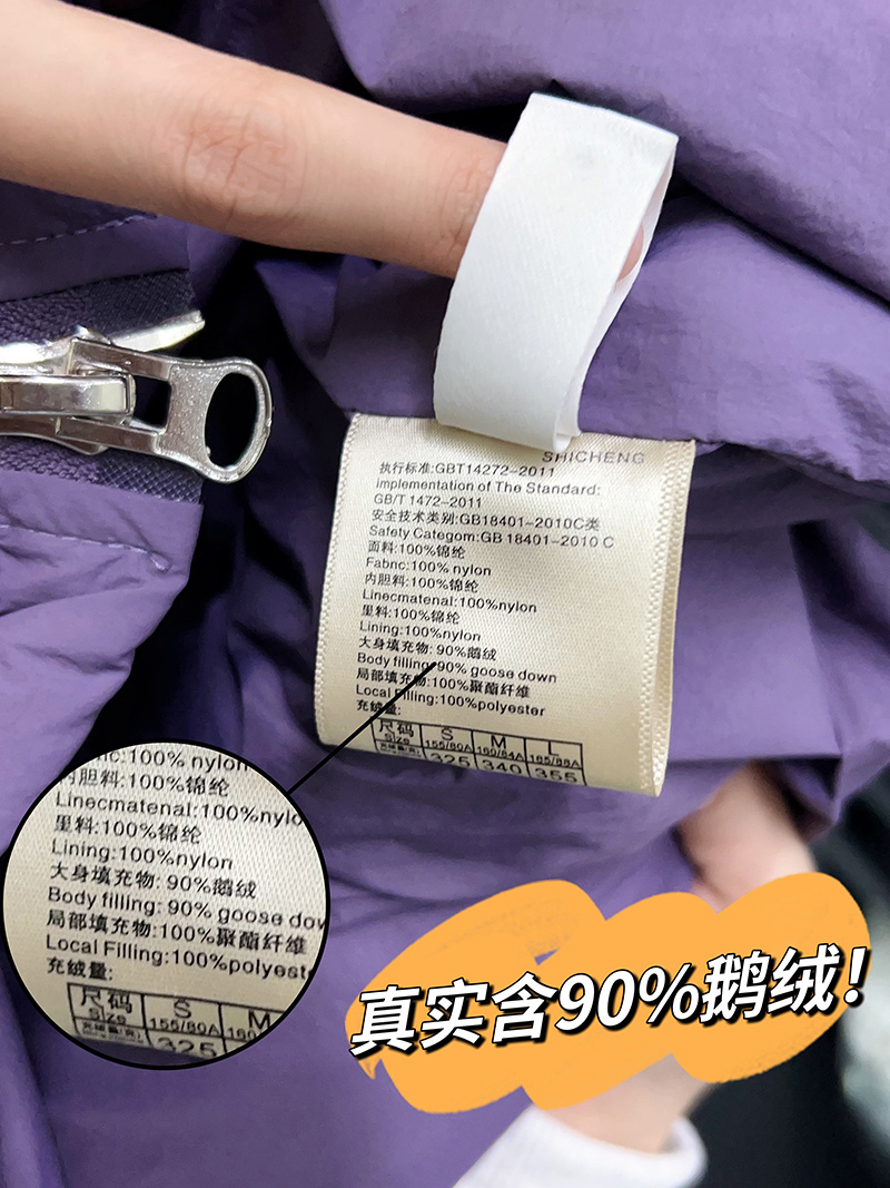 材质:面料:100%锦纶 内胆料:100%锦纶 里料:100%锦纶 大身填充物:90%鹅绒 局部填充物:100%聚酯纤维