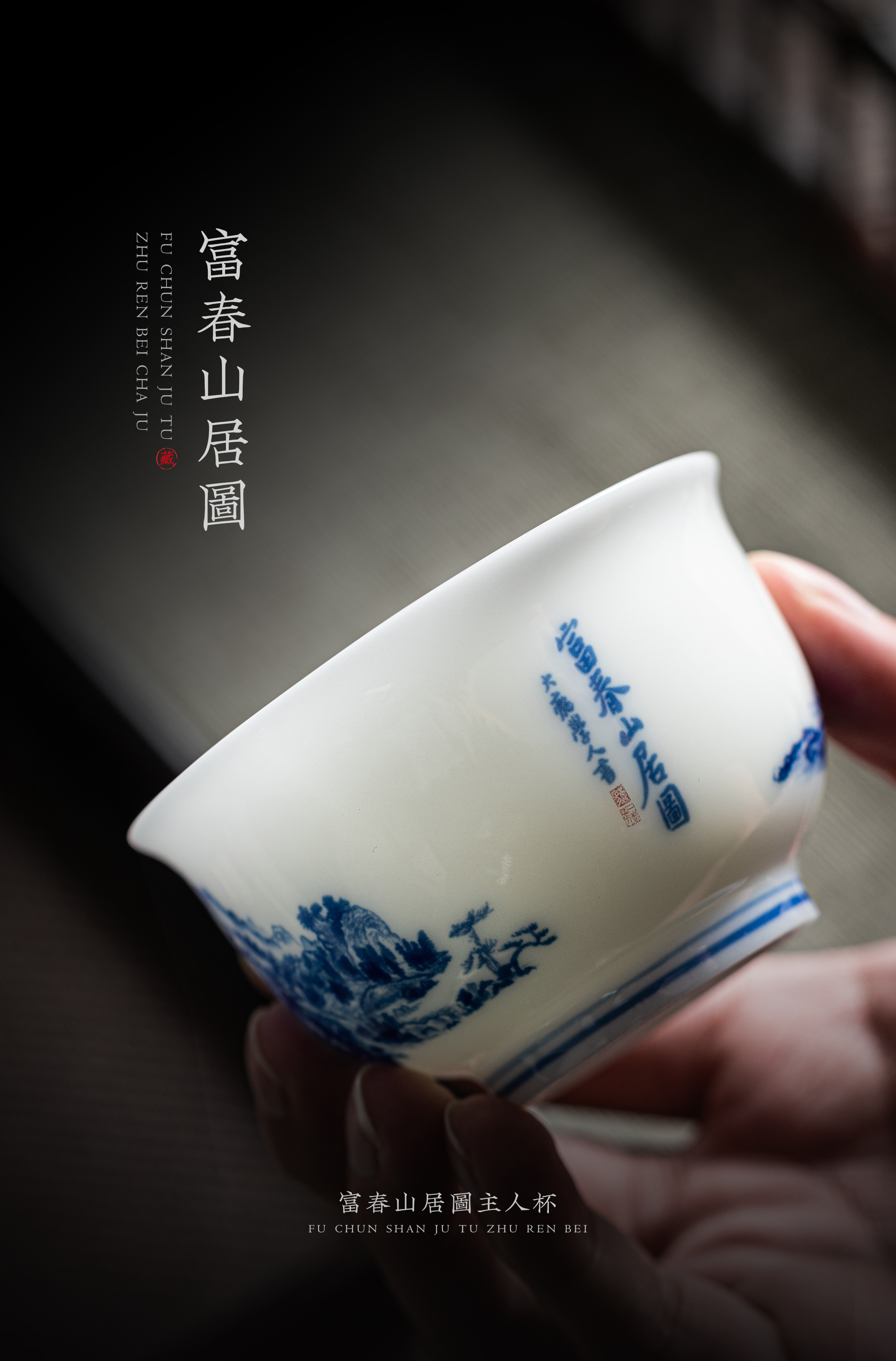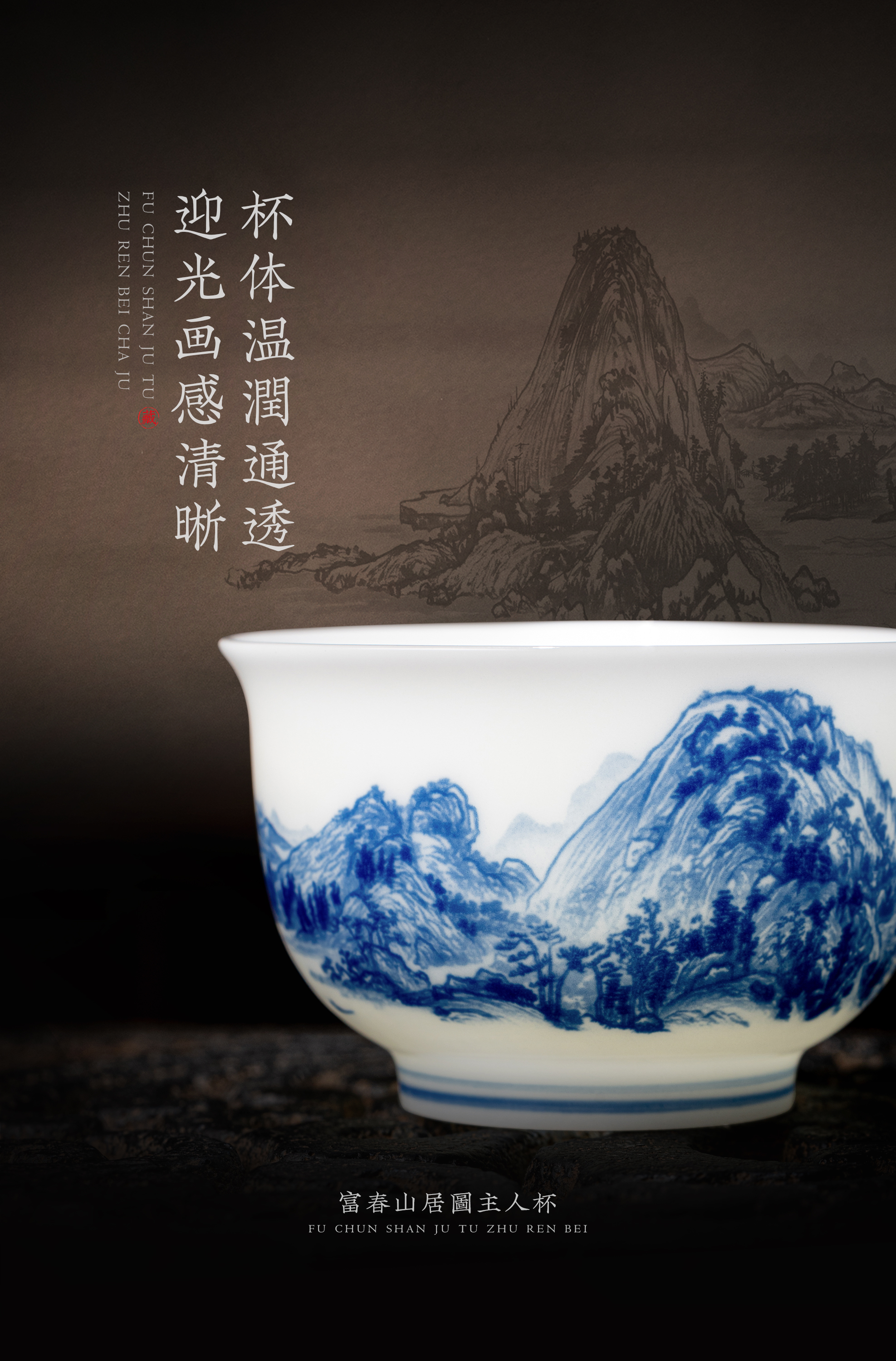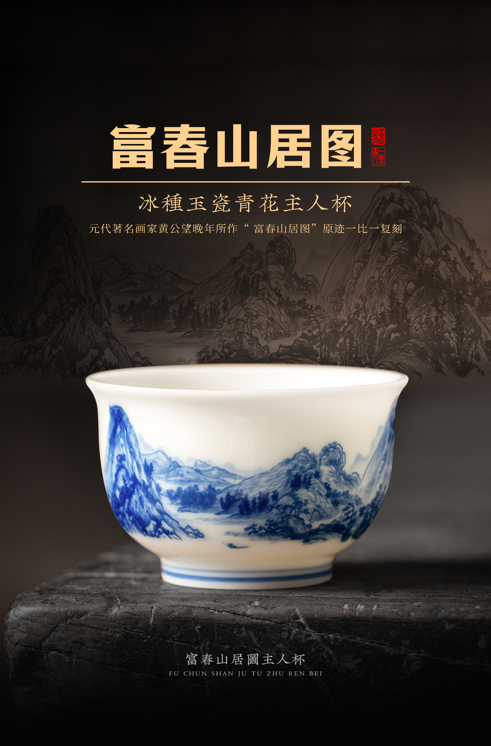 【富春山居图】冰种玉瓷青花主人杯,温润通透 精工复刻,作者签章 品质保证,包装精致 高端好礼