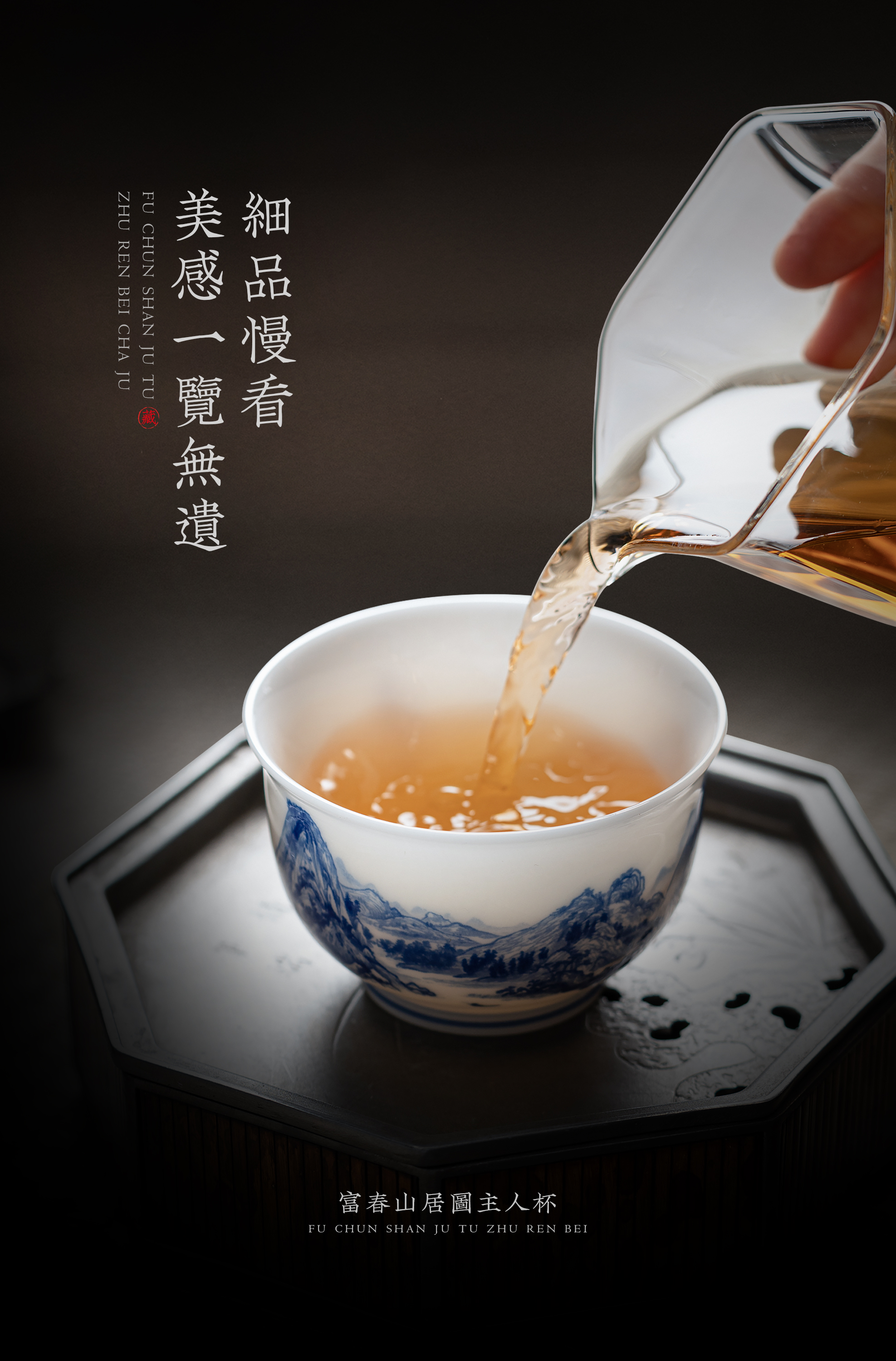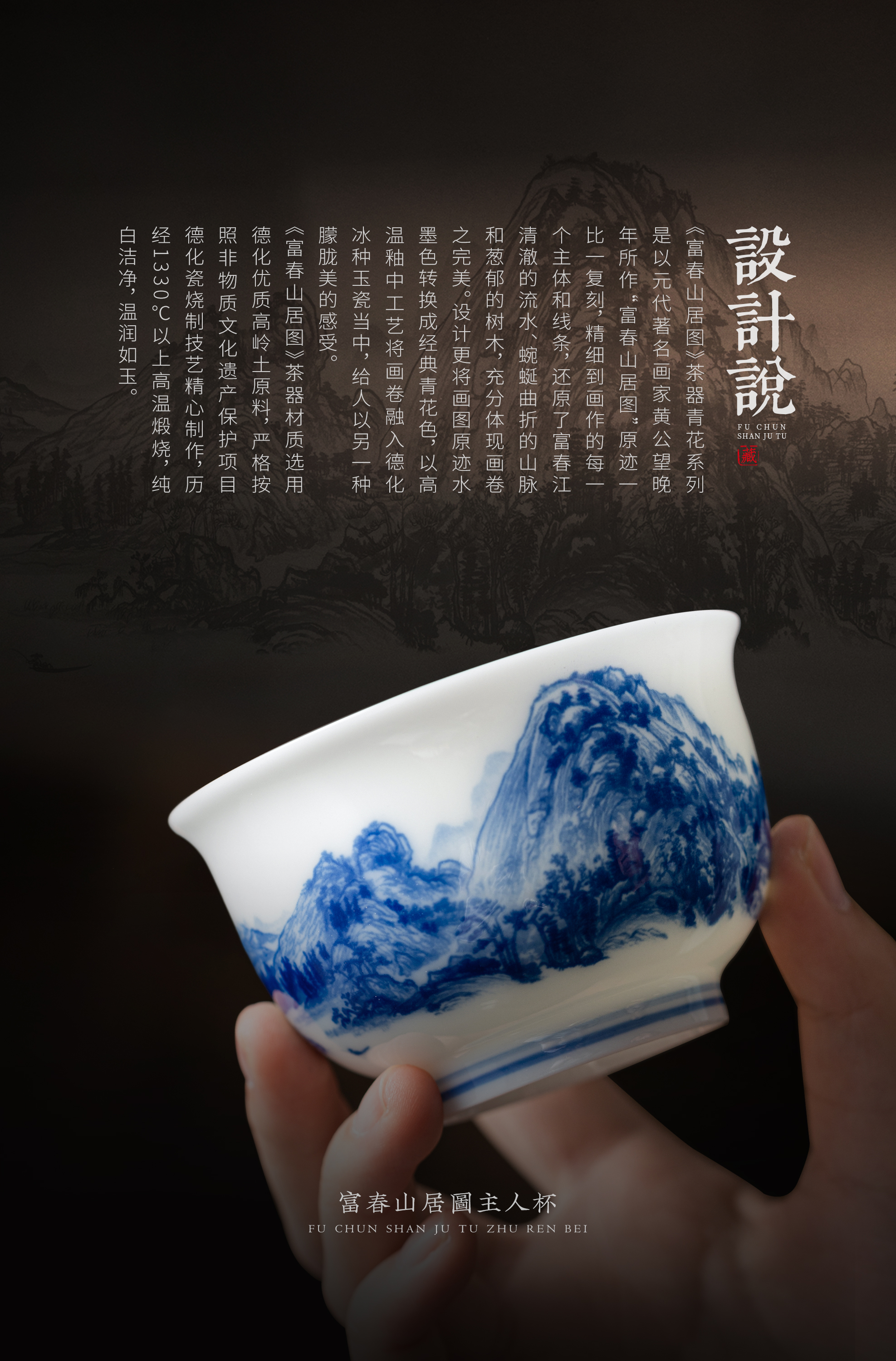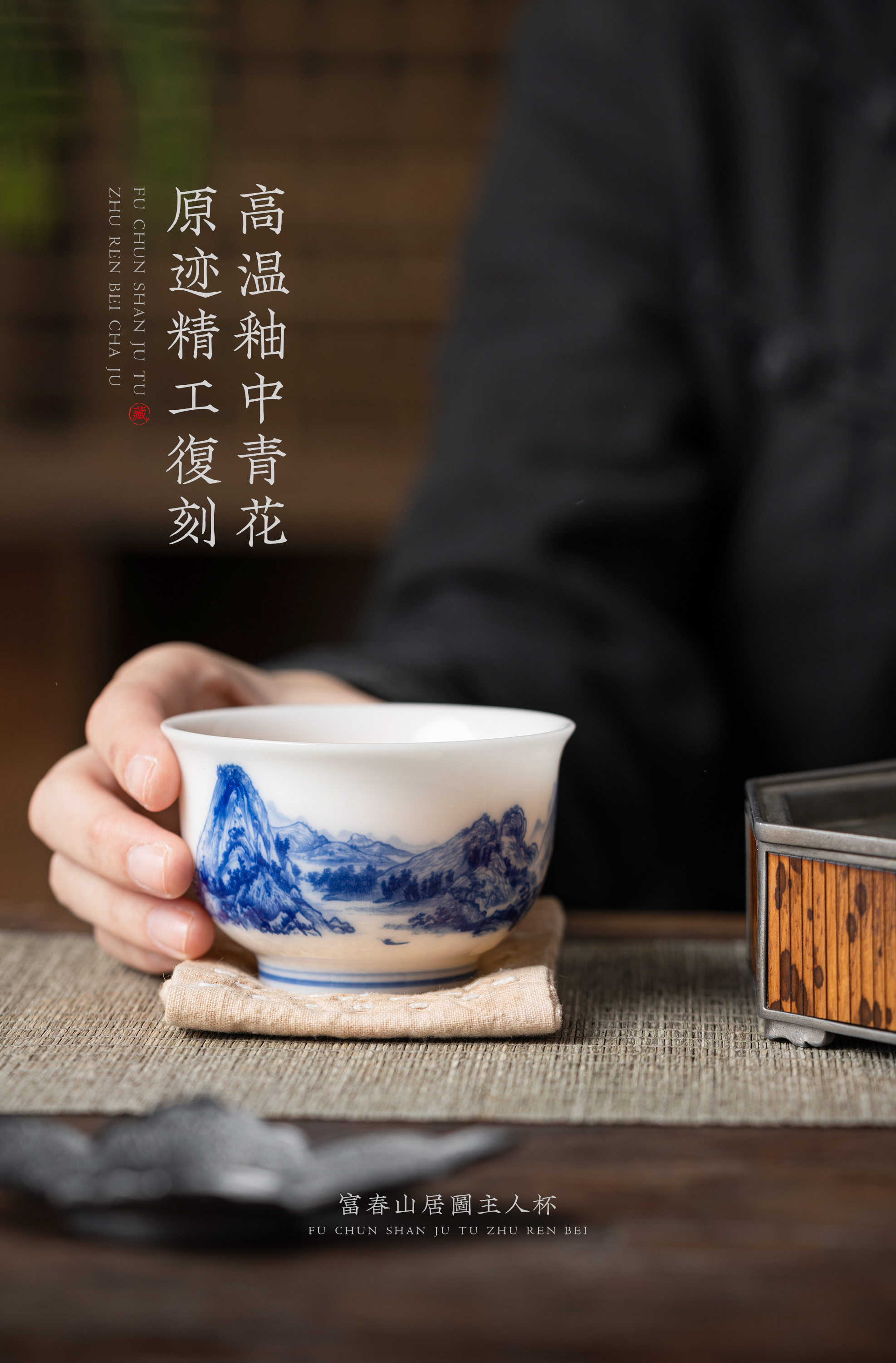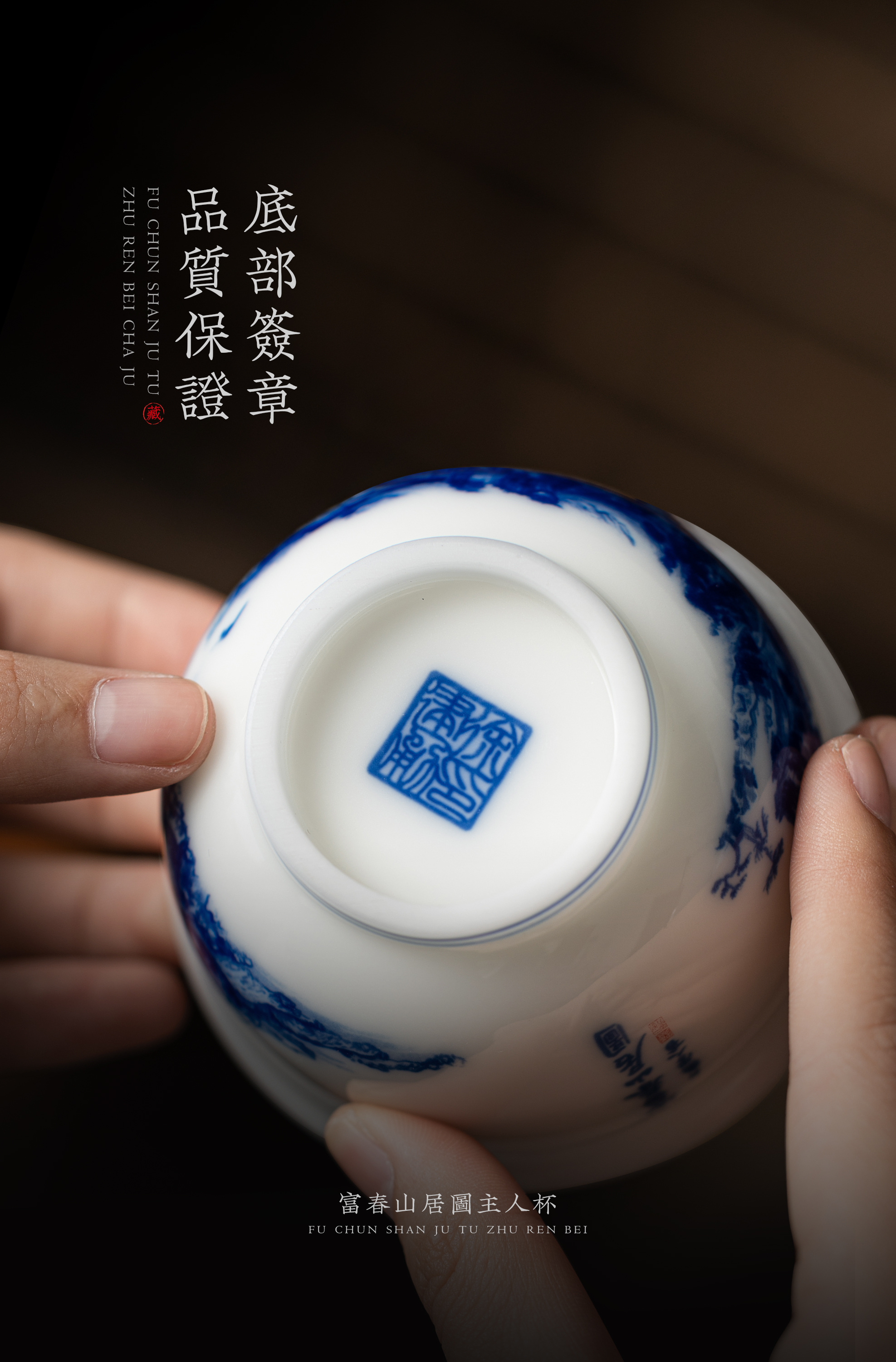 【富春山居图】冰种玉瓷青花主人杯,温润通透 精工复刻,作者签章 品质保证,包装精致 高端好礼