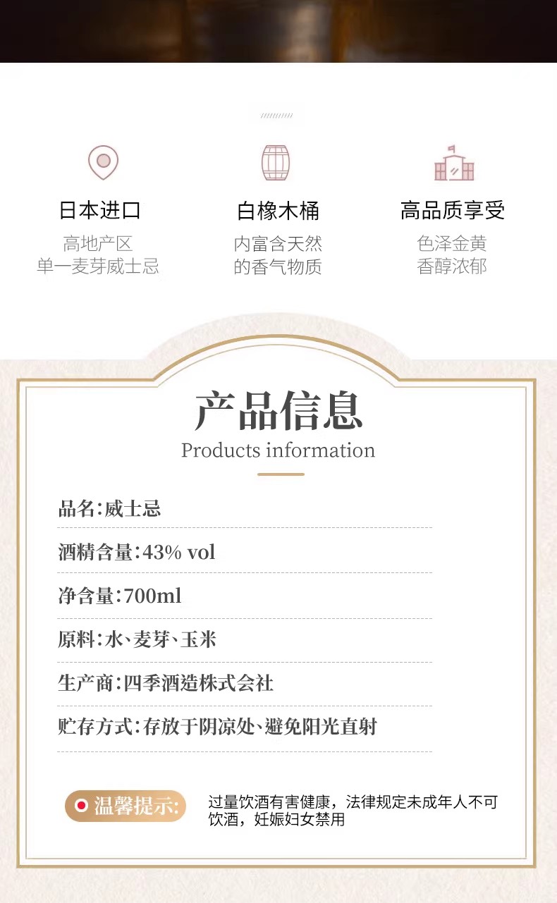 | 品牌:MAIHAMA舞滨 品名:舞滨白橡木桶威士忌 原产地:日本 酒精度:43%vol 净含量:700ml 发货地:福建省 发货时间:下单一般48小时内发货(周末、节假日除外) 发货快递:顺丰快递(以实际发货为准,暂不支持指定快递)截单时间18:00 运费模板:该商品全国地区包邮(港澳台不发货,偏远地区不包邮,新疆、西藏、内蒙古、甘肃、宁夏,快递费+20元,请知悉) 售后政策:酒水产品不支持7天无理由退货,不支持拦截与拒收,若遇破损请在签收24小时内拍照联系客服处理。 孕妇和儿童不宜饮酒,未成年人禁止购买,过度饮酒有害健康,请适度饮酒。 |