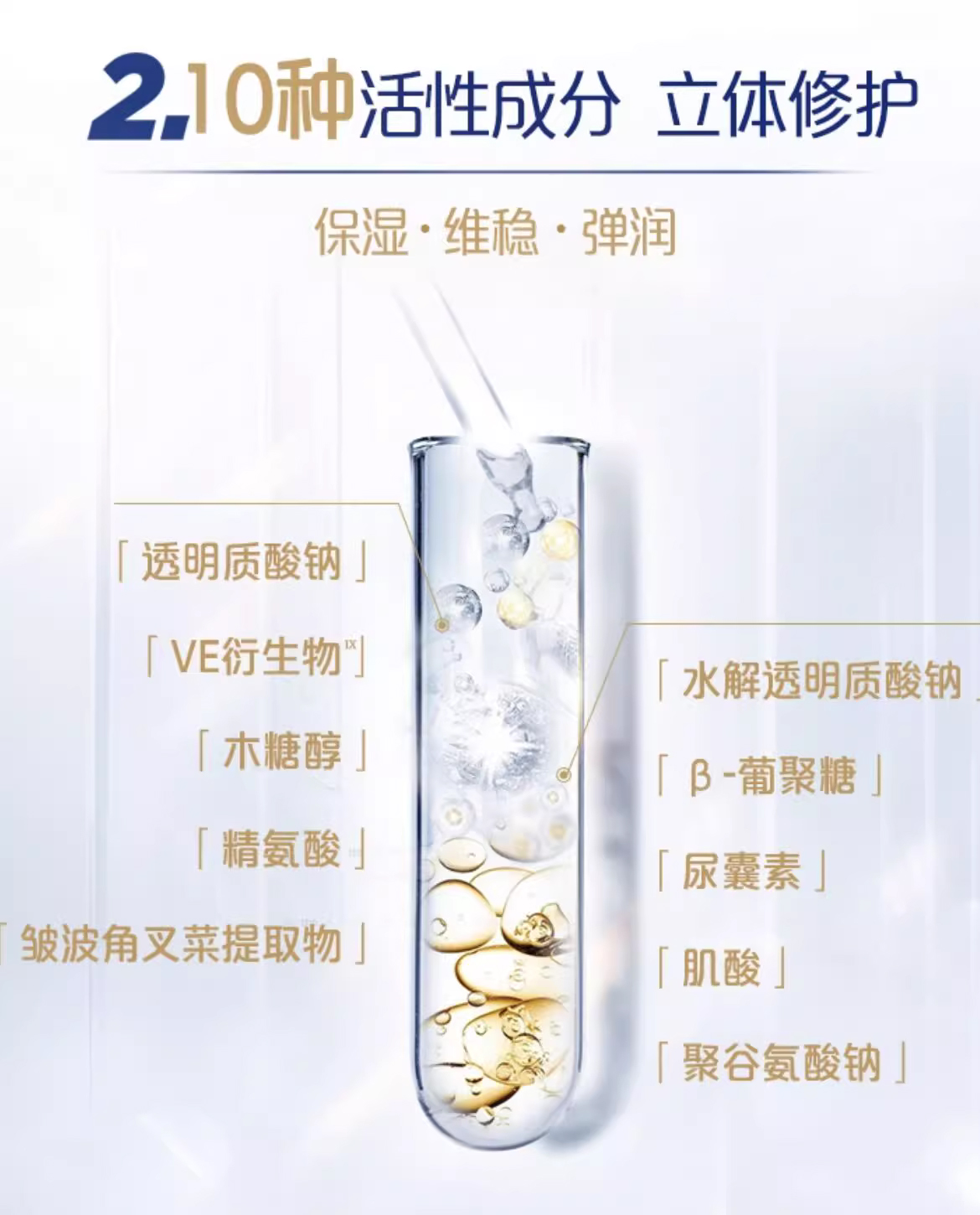 除了主打的辅酶Q10,还添加了10种活性成分:肌酸、透明质酸钠、VE衍生物、木糖醇、精氨酸、皱波角叉菜提取物、水解透明质酸钠、β-葡聚糖、尿囊素、尿囊素、聚谷氨酸钠等,强大的组合拳,兼顾保湿、维稳、弹润~