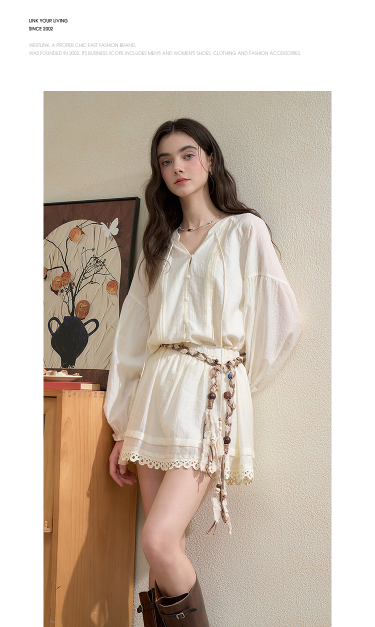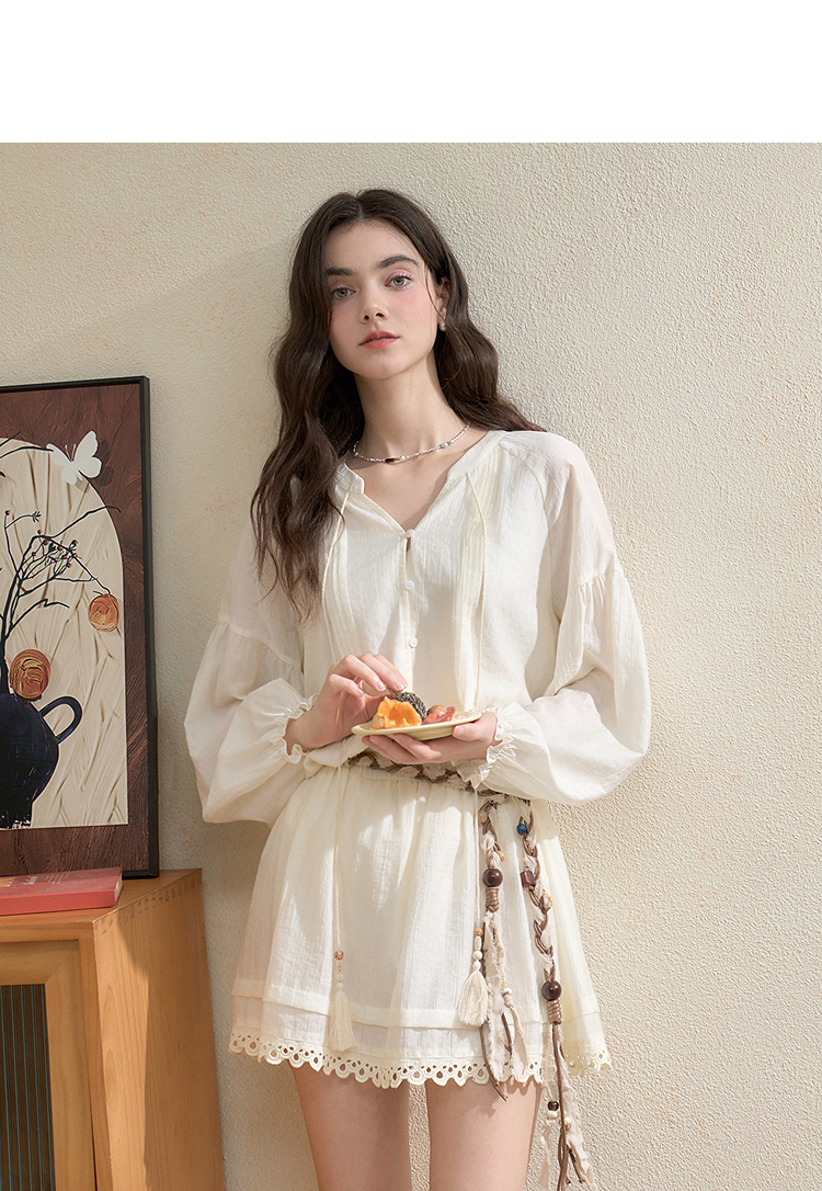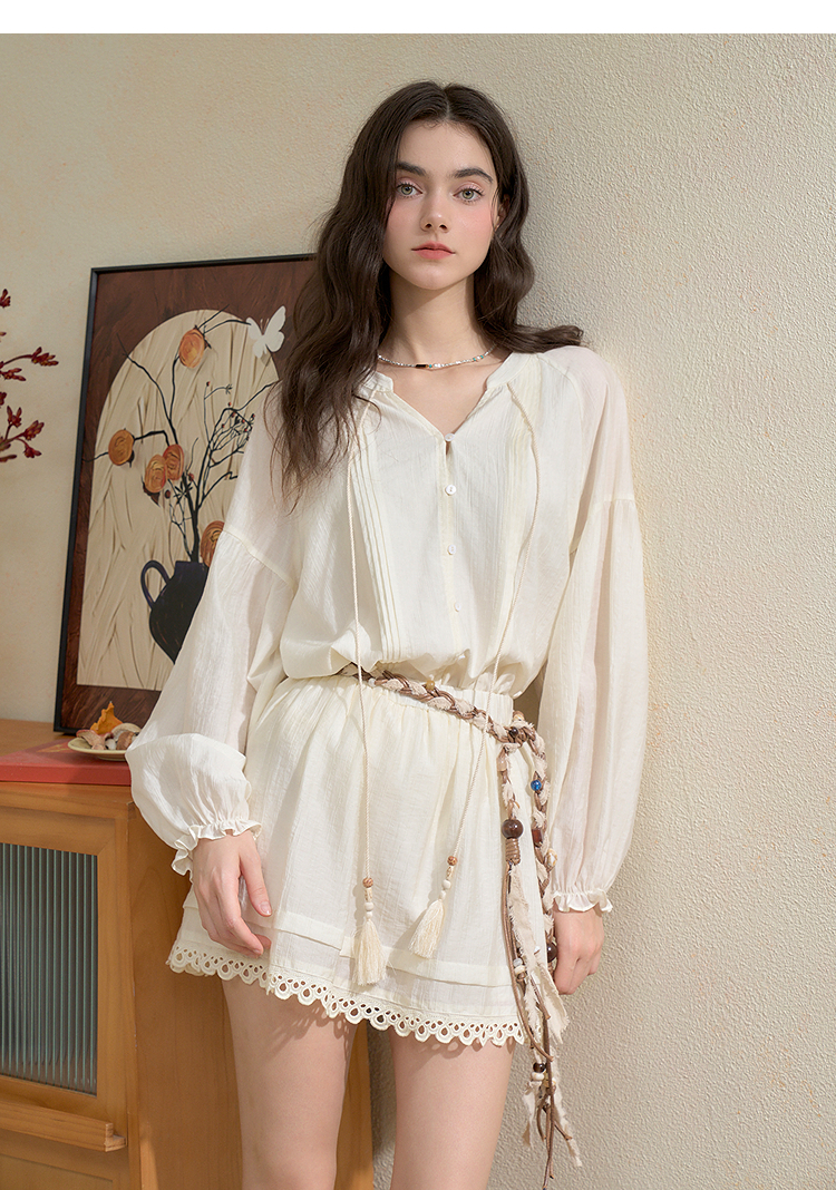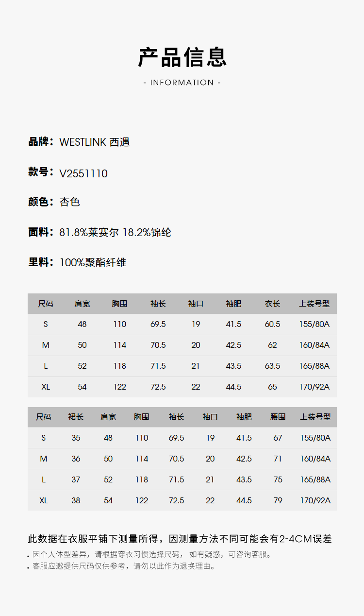 西遇莱赛尔文艺休闲套装女秋季V领长袖衬衫搭半身裙两件套V2551110