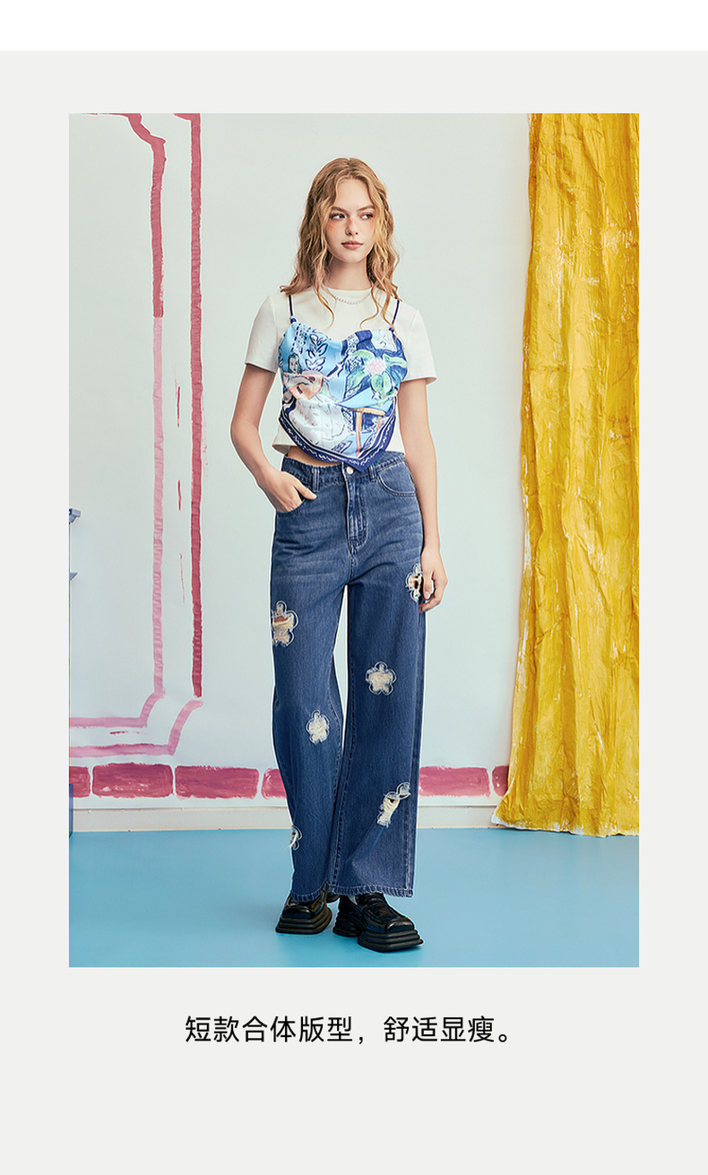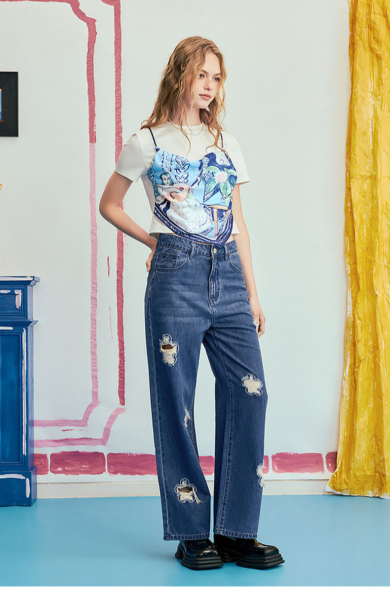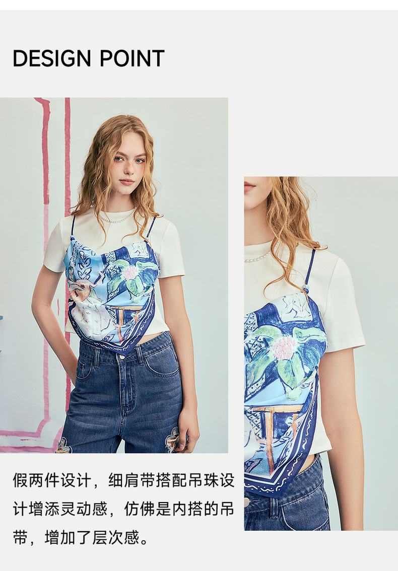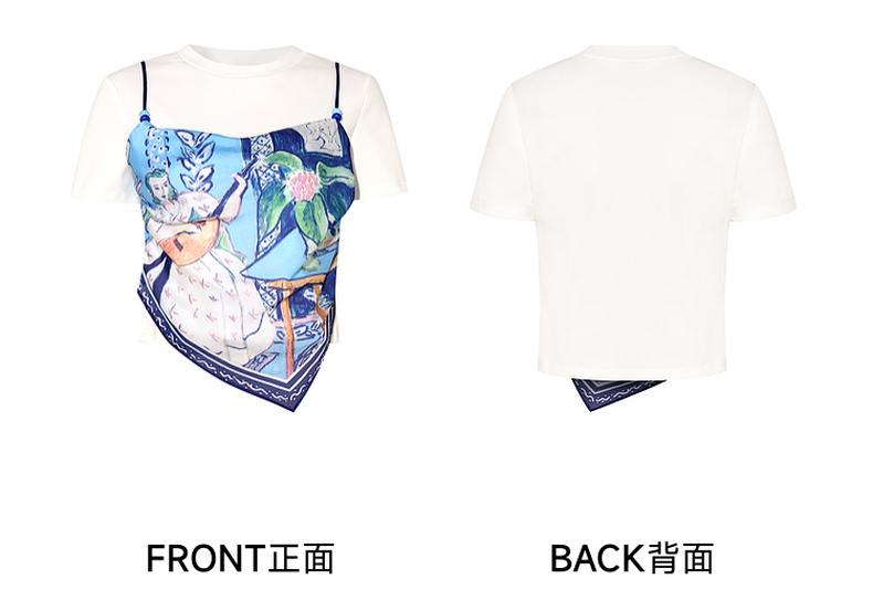两三事 剪夏狂想 2025夏季新款时尚印花拼接假两件短袖棉t恤女