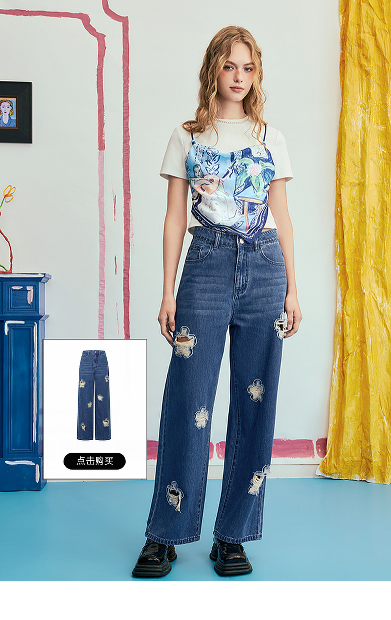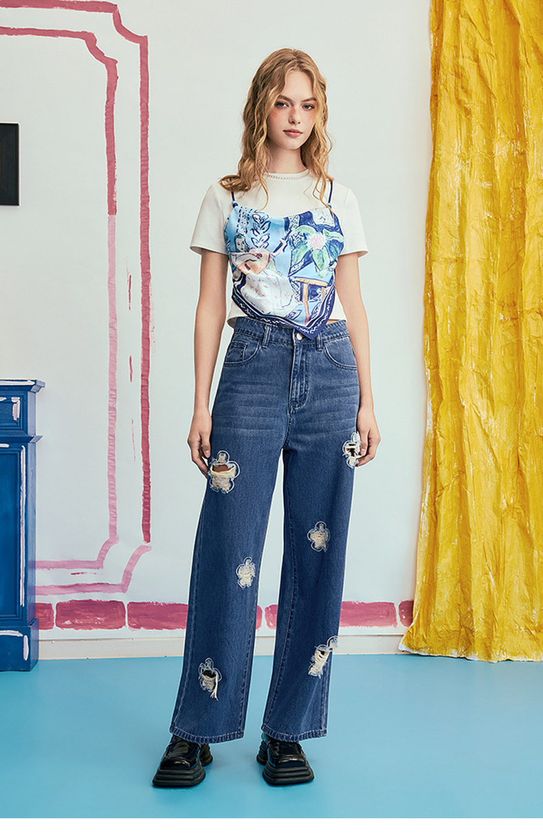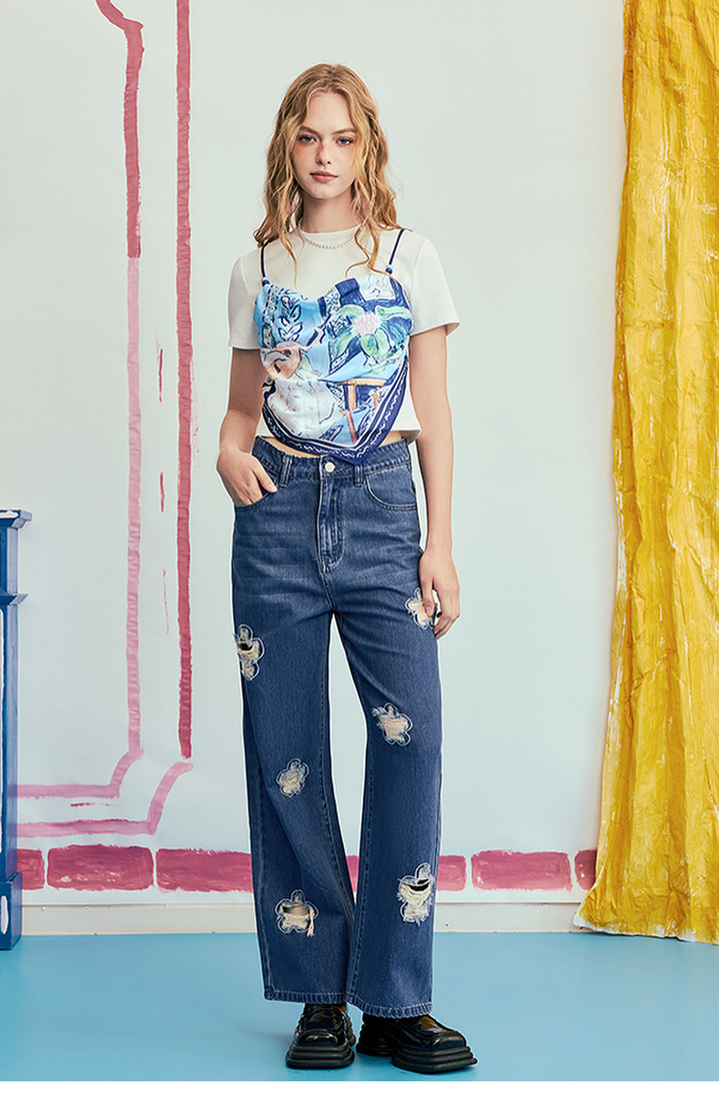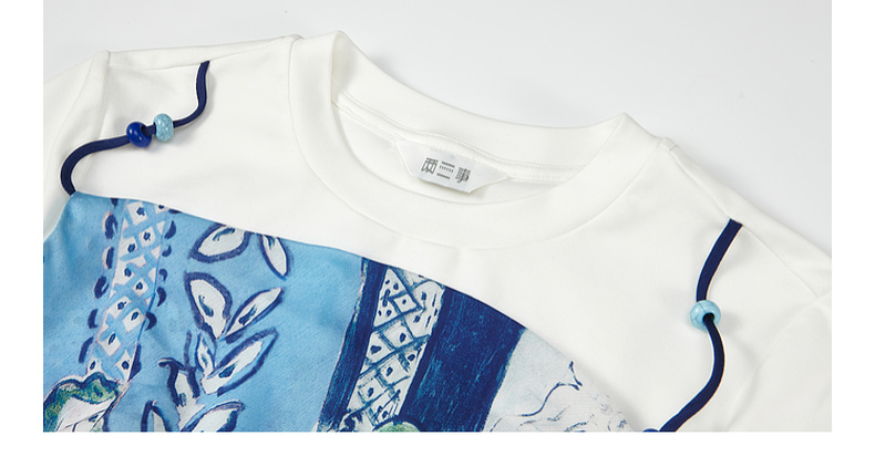 两三事 剪夏狂想 2025夏季新款时尚印花拼接假两件短袖棉t恤女