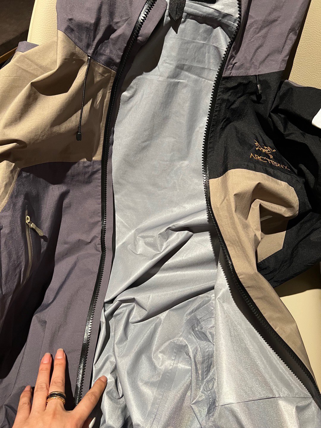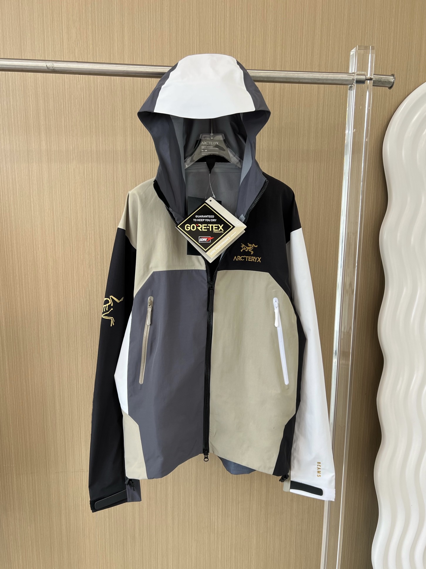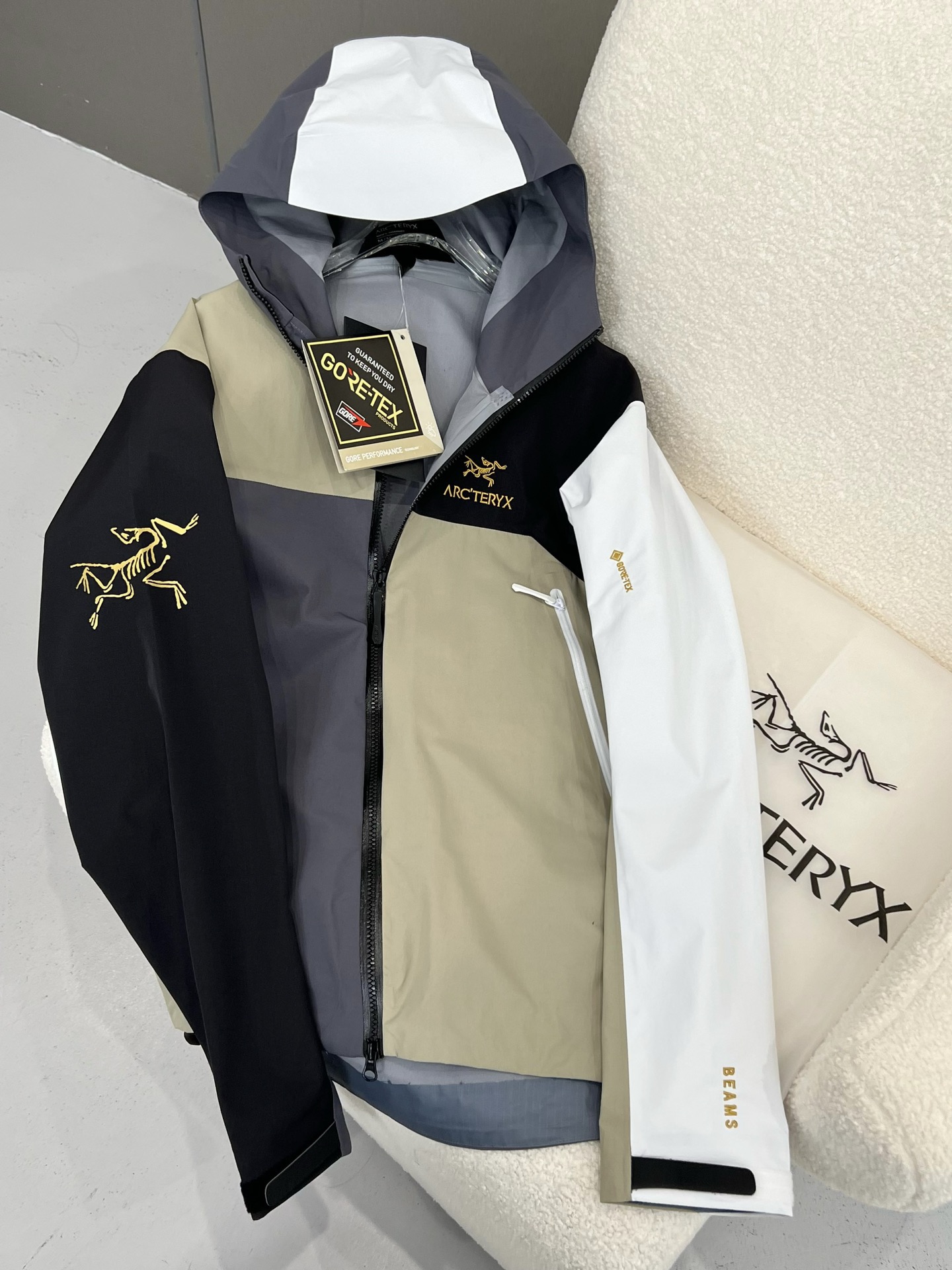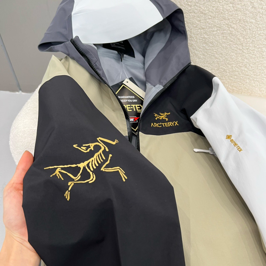 同样也是防水面料。面料不是那种硬板板的,很软,但不是那种软塌塌的,其中经典BETAJACKET采用GORE-TEX面料,并且搭载C-KNIT™背衬技术,在强大防水功能加持下,仍旧拥有出色的柔软度及透气性。
