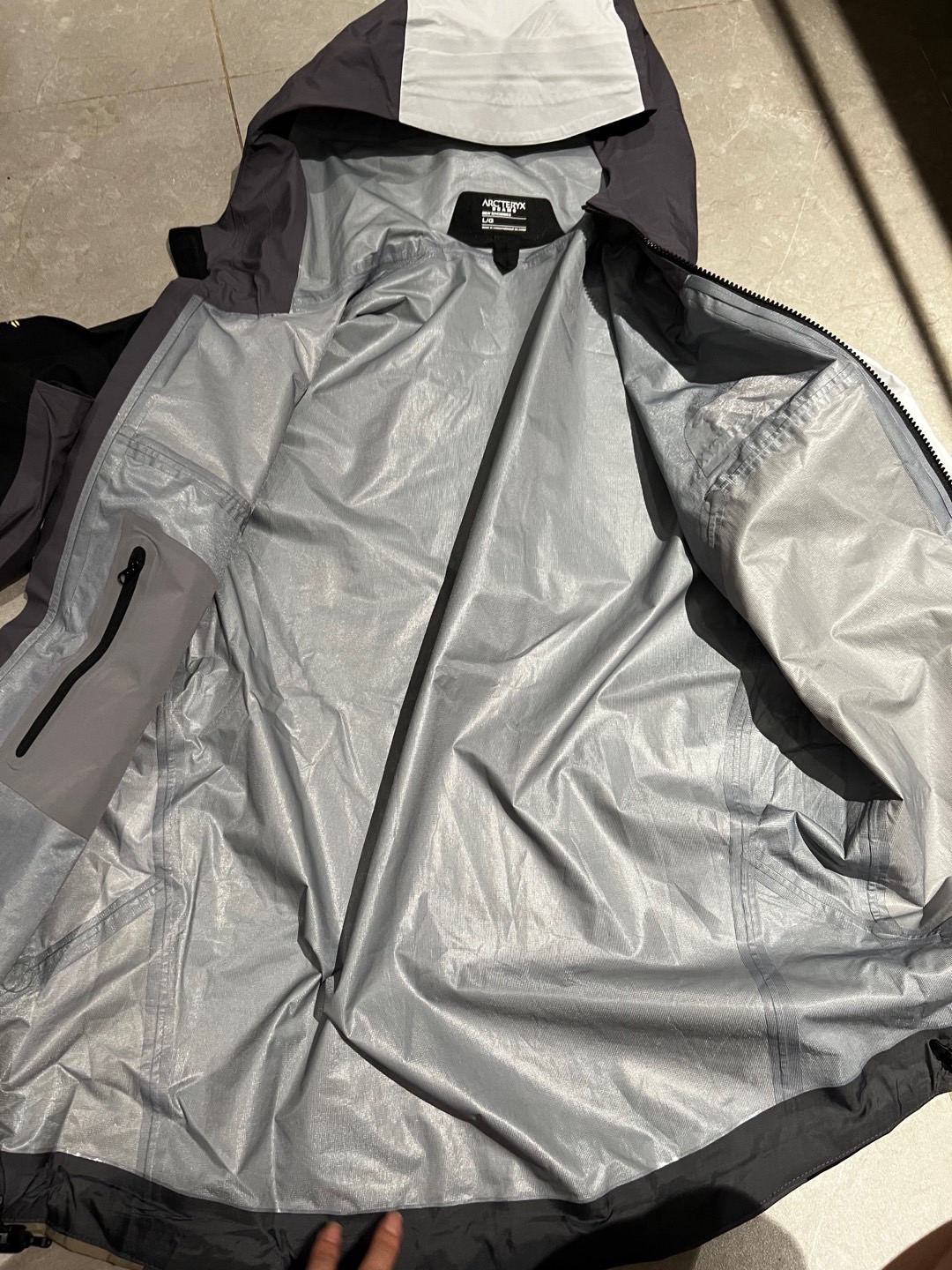 内里很软是银色像是一层一样的科技感。这是品牌的特殊面料。风雨无阻