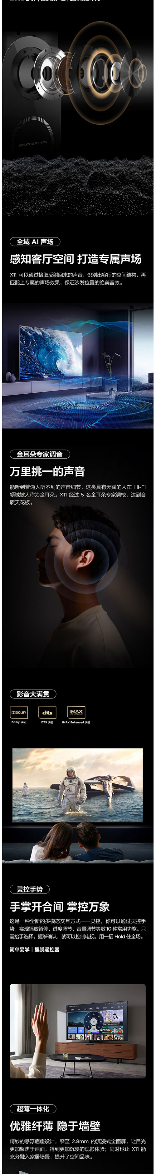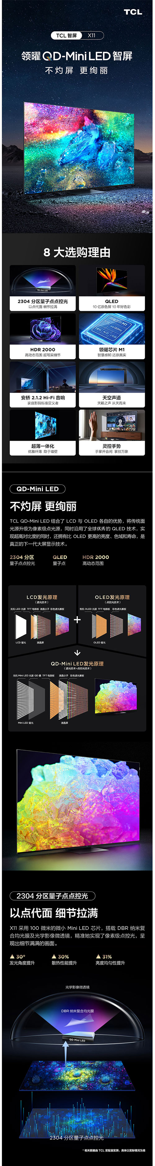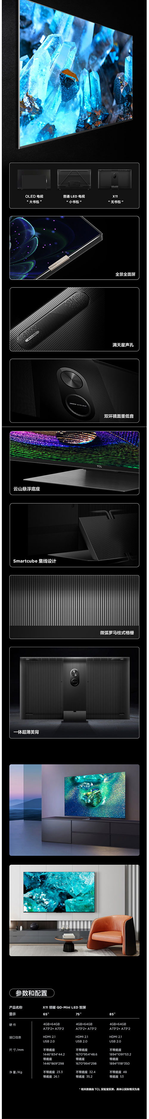 TCL电视 75X11 75英寸 QD-mini LED智能4K超清电视 AI声控智屏 标配摄像头 超薄全面屏 4+64GB液晶平板电视机