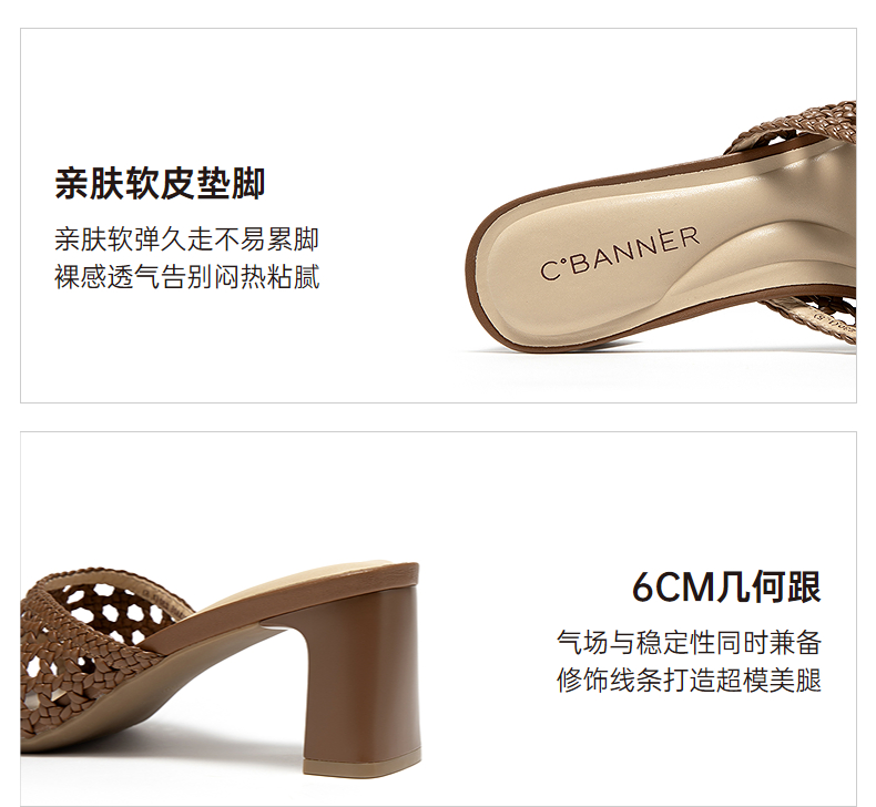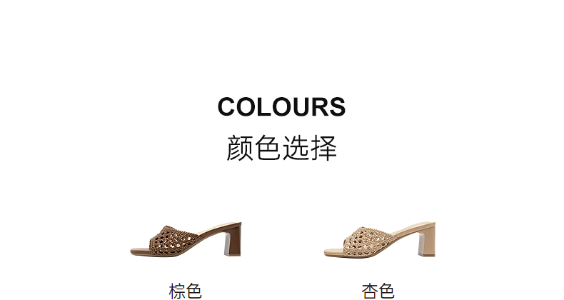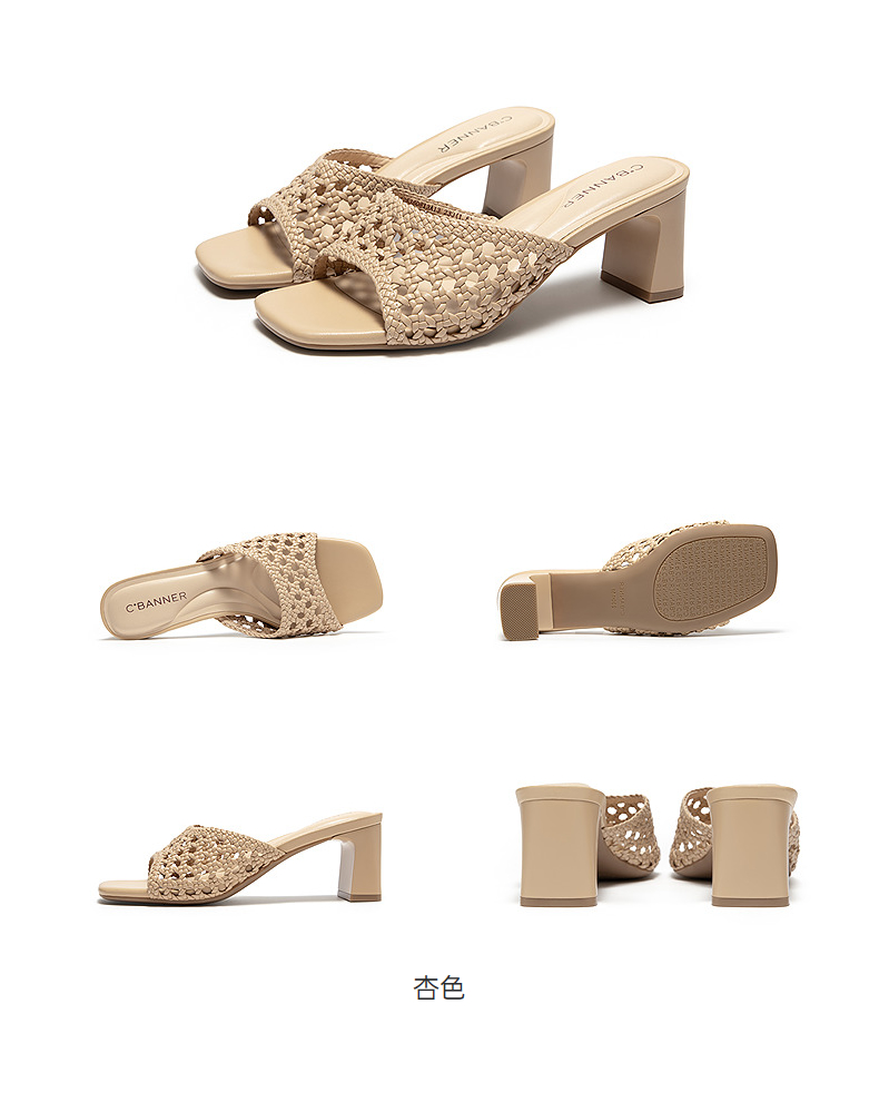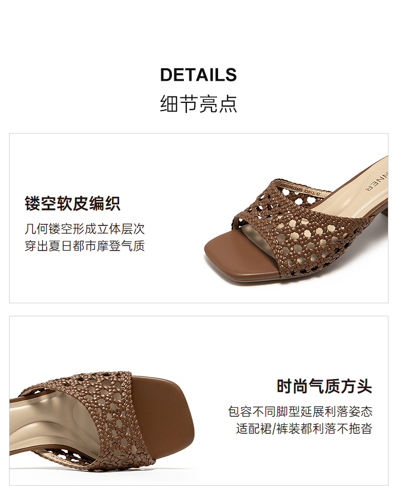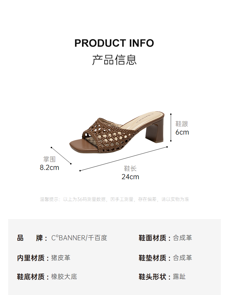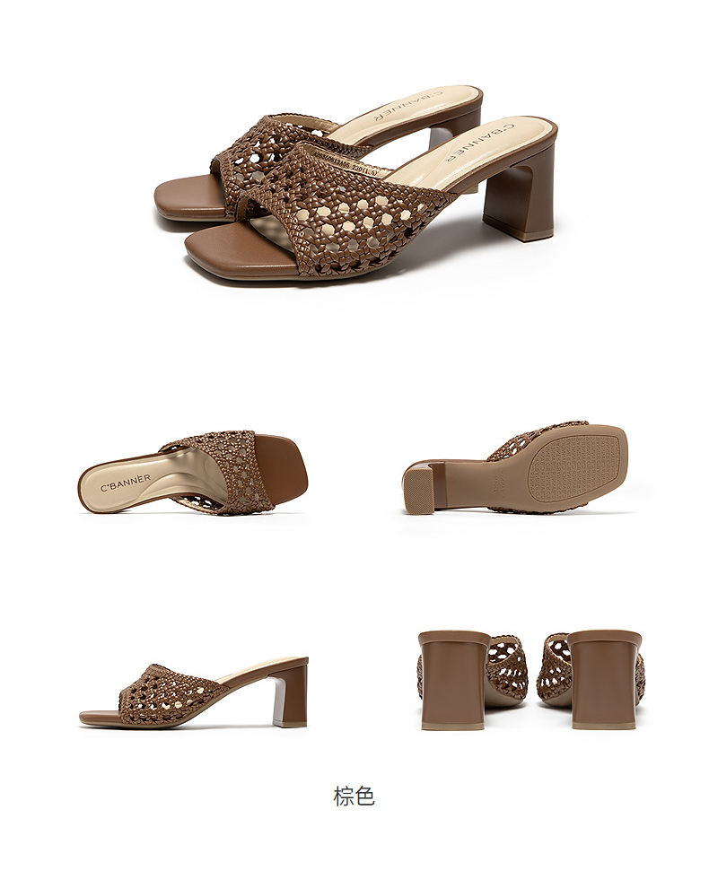 千百度镂空编织一字拖女2026夏季新款粗高跟露趾一脚蹬外穿凉拖鞋A26360813
