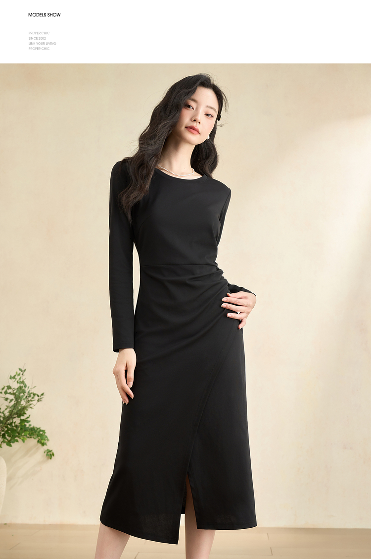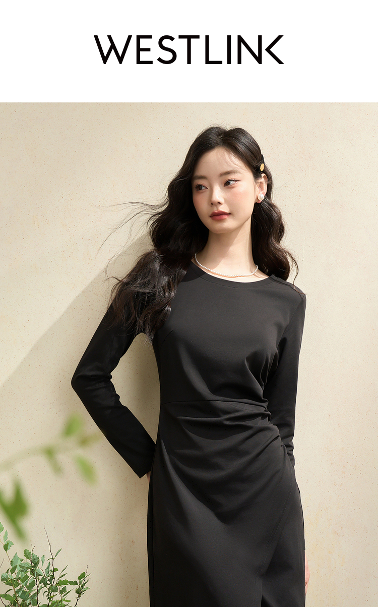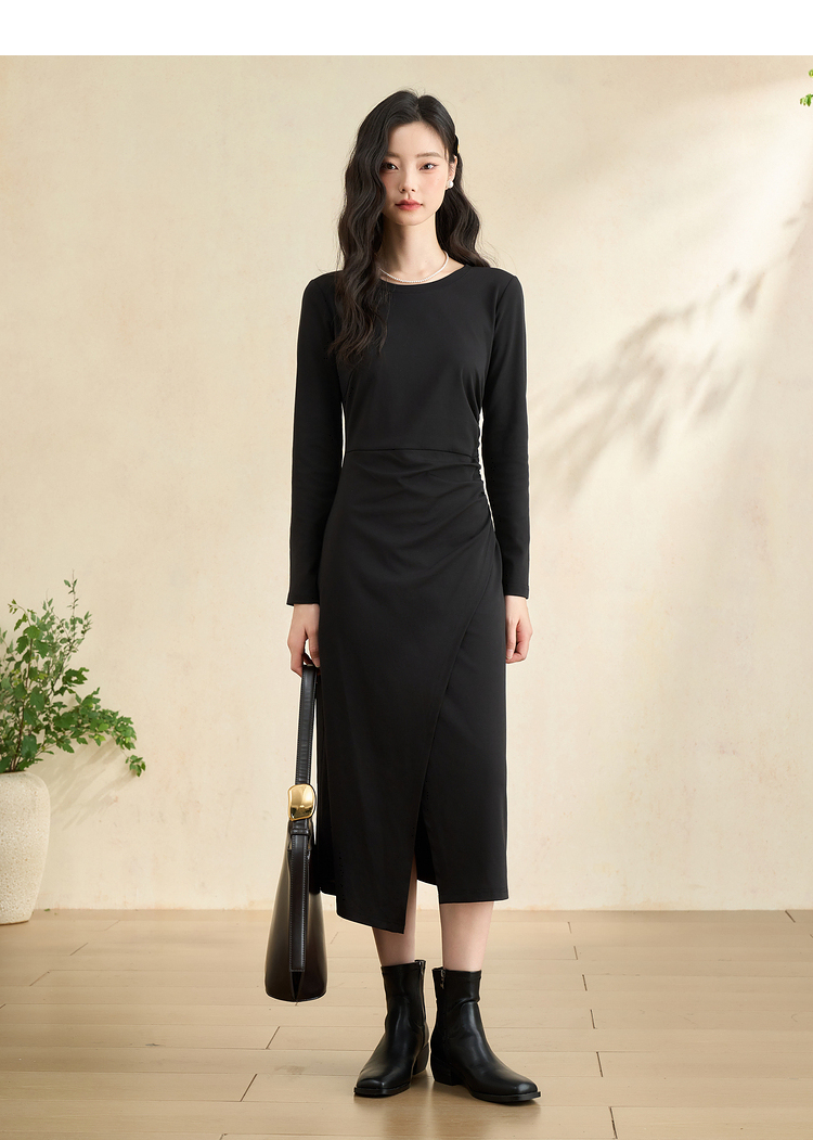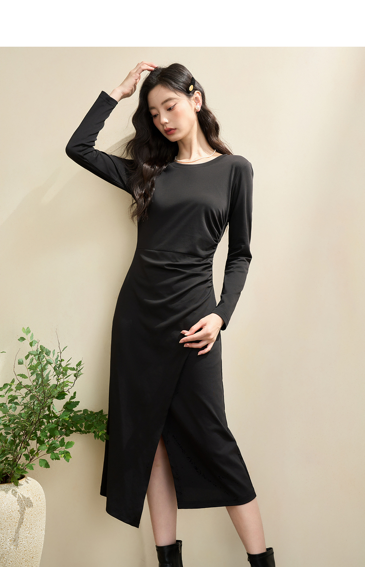 简约高级感开叉针织裙女秋季气质通勤褶皱收腰长袖连衣裙V3342208