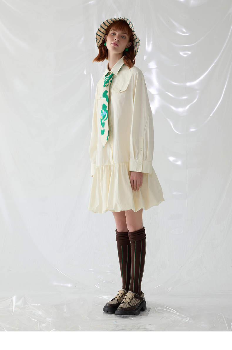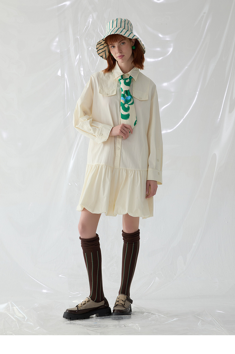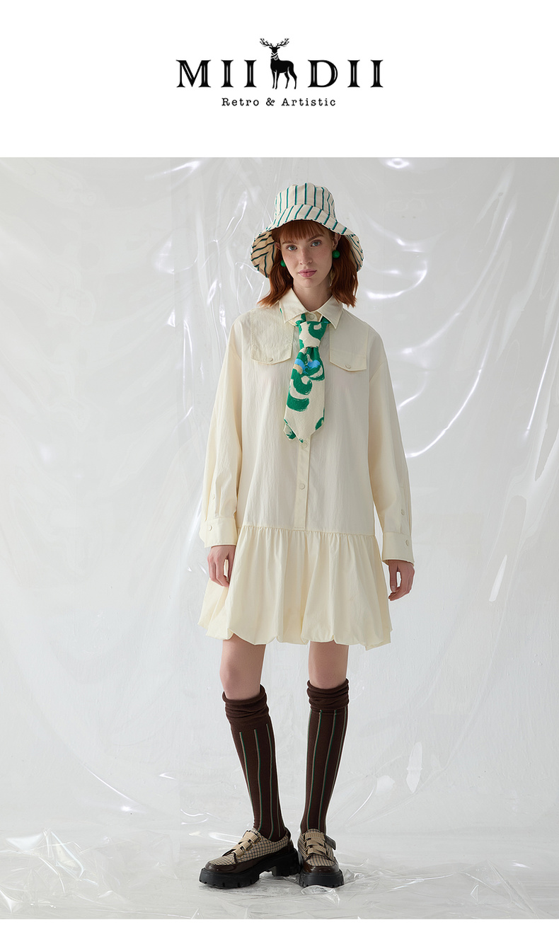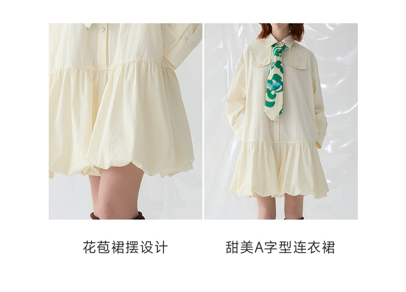 谜底衬衫式连衣裙2025春季新品挺阔A字型花苞裙长袖短裙251ML0121