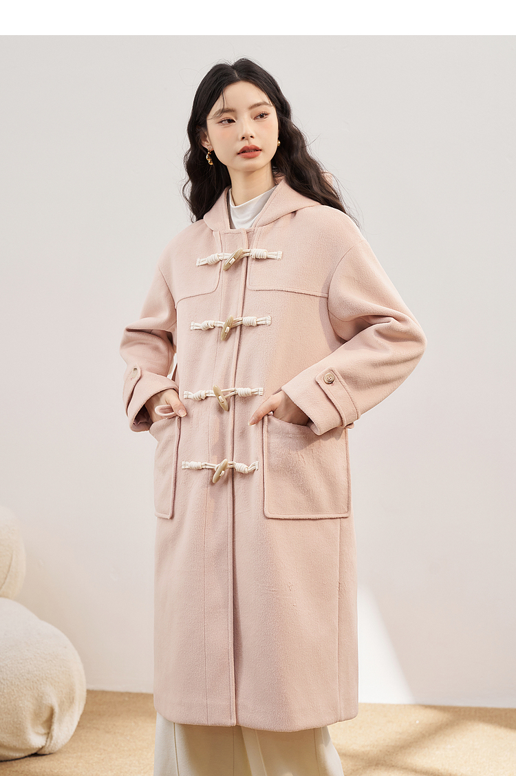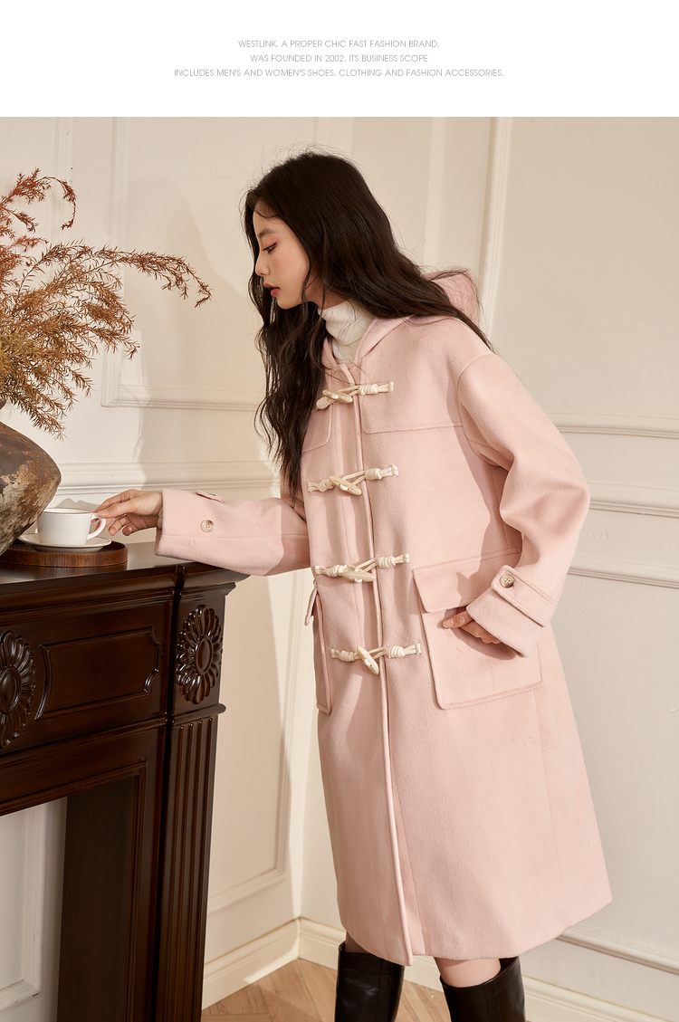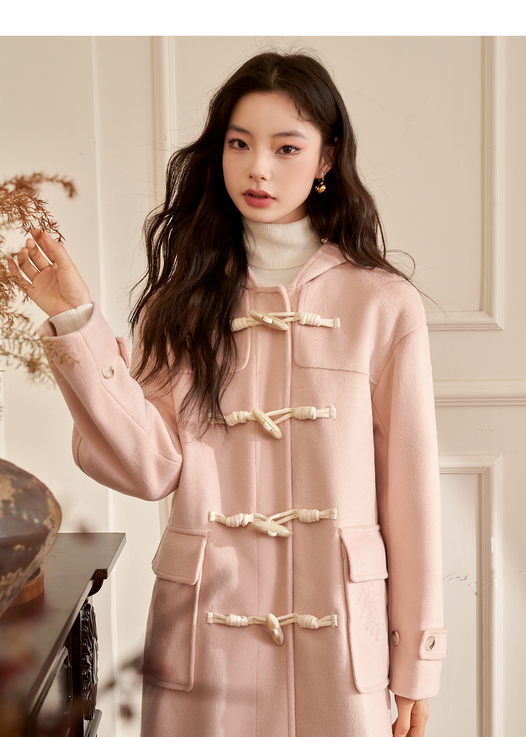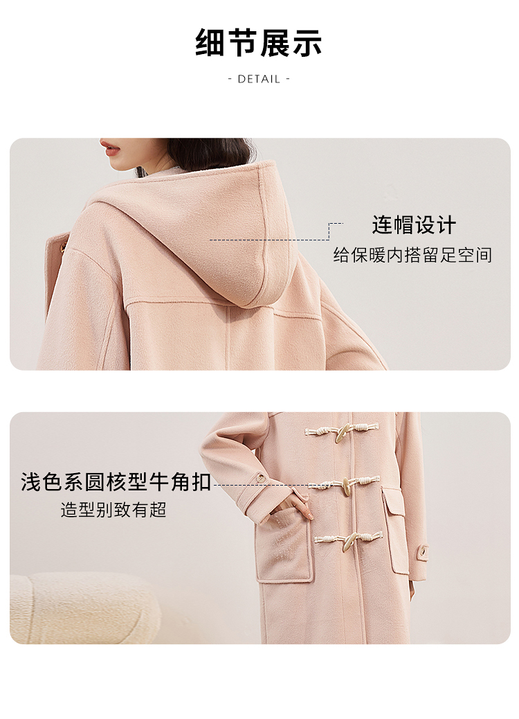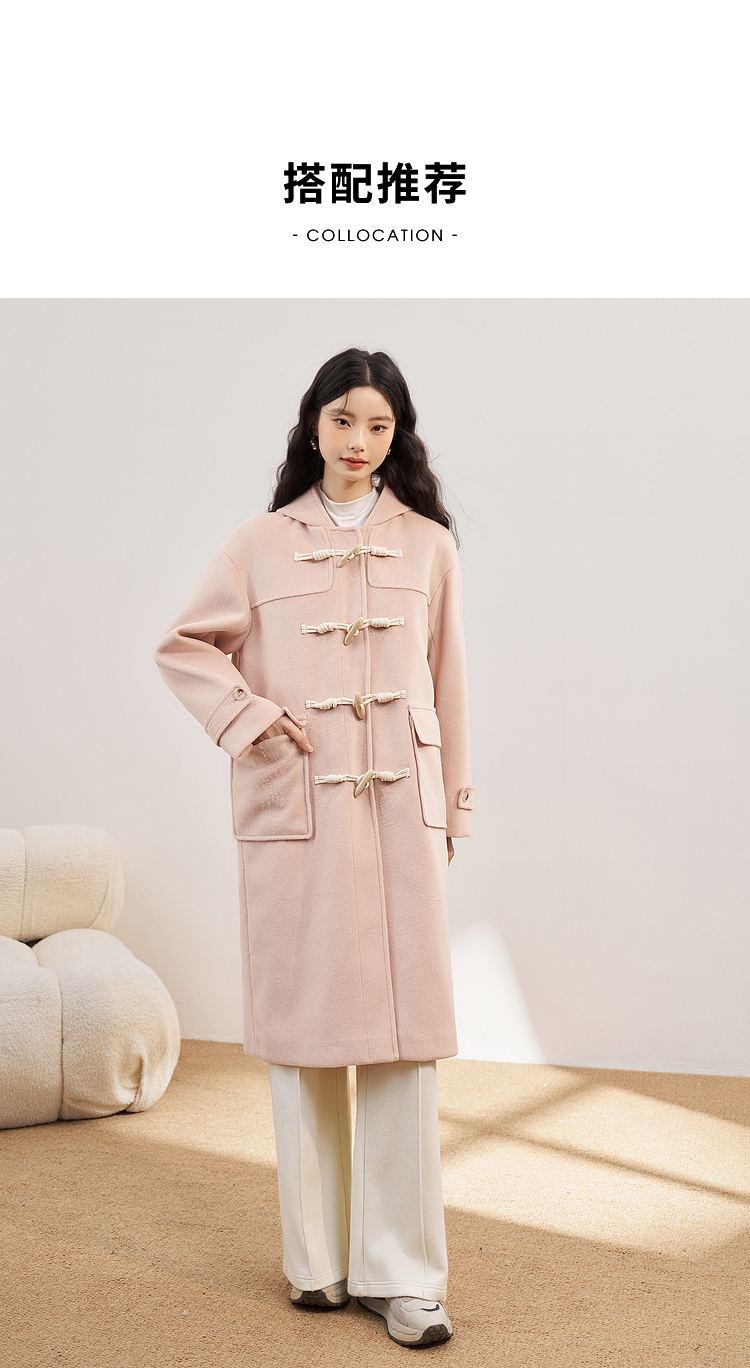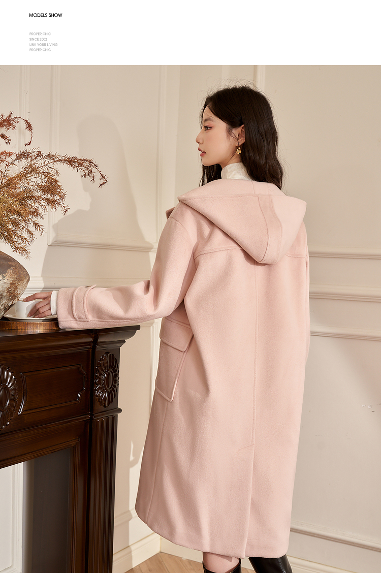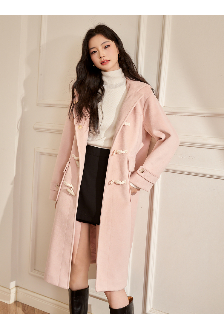 西遇赫本风毛呢外套秋冬新款小众粉色牛角扣大衣连帽外套女D2138677
