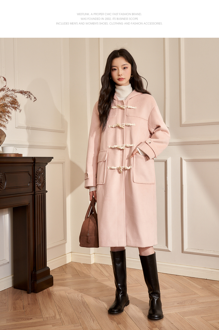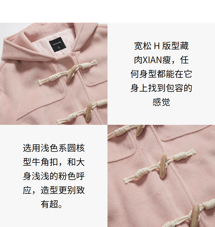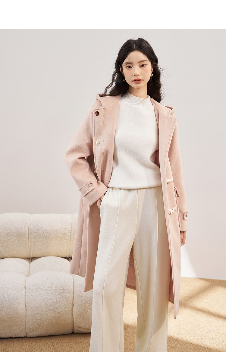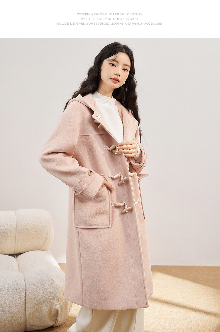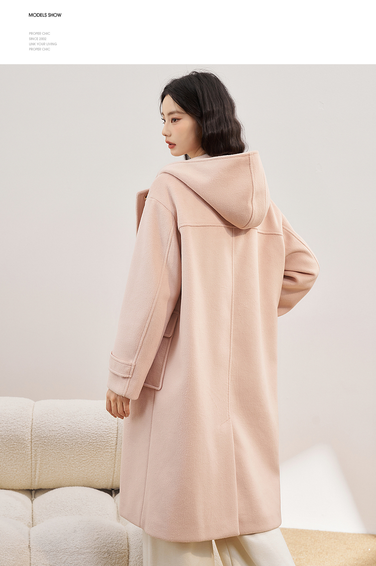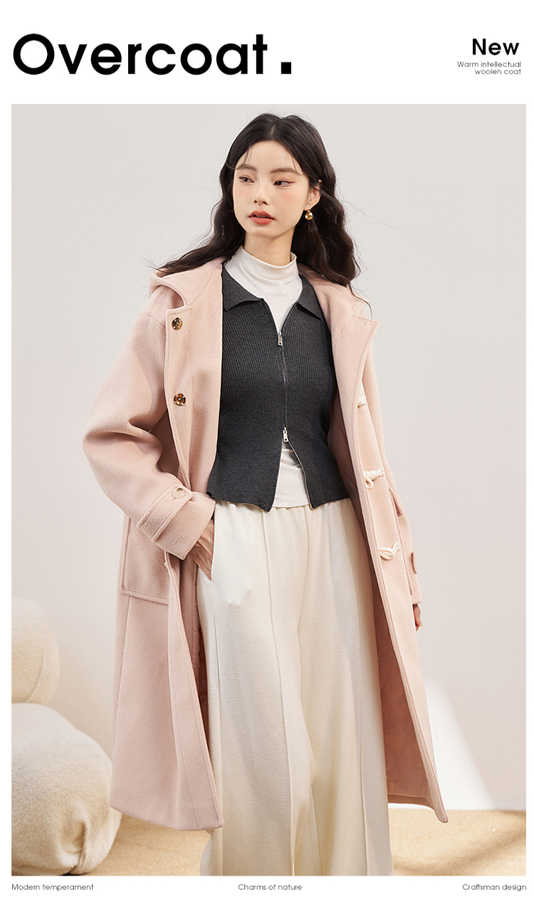 西遇赫本风毛呢外套秋冬新款小众粉色牛角扣大衣连帽外套女D2138677