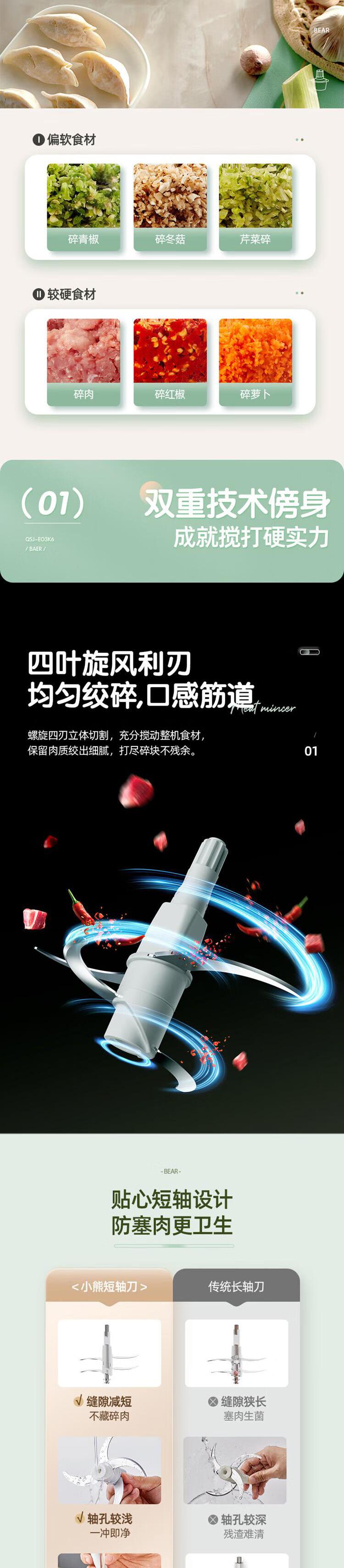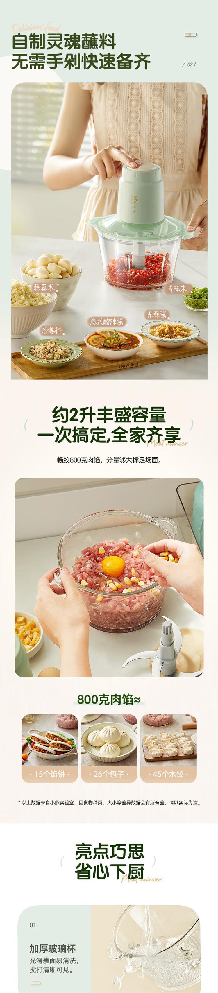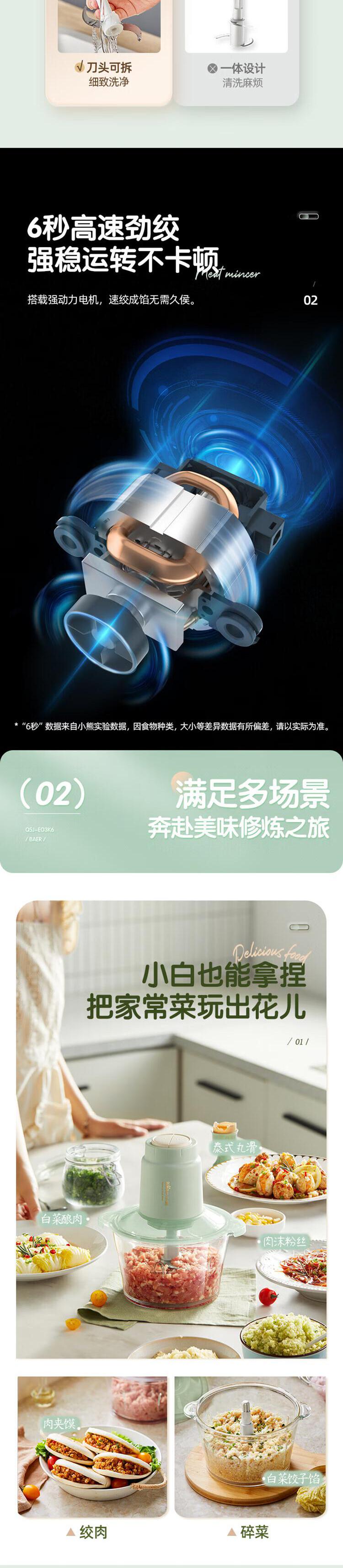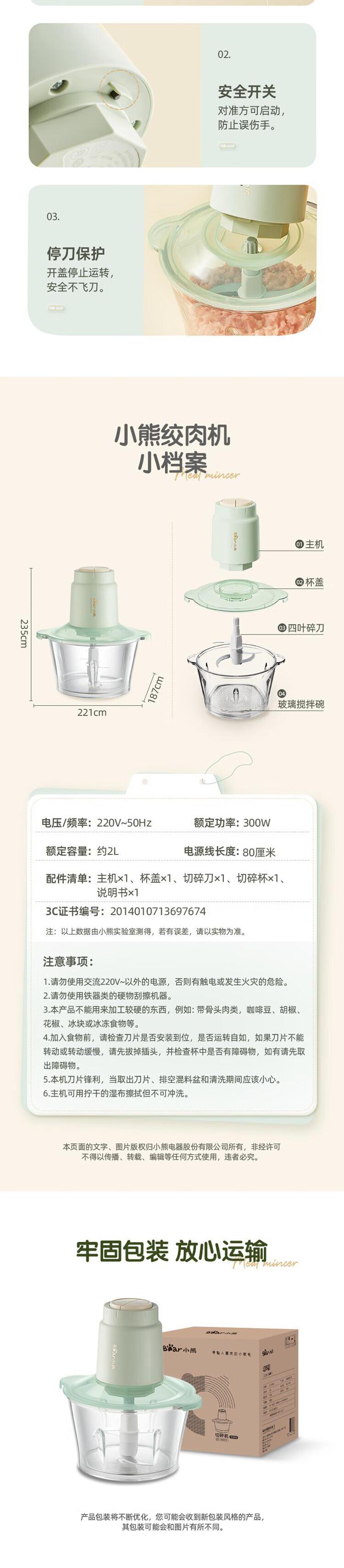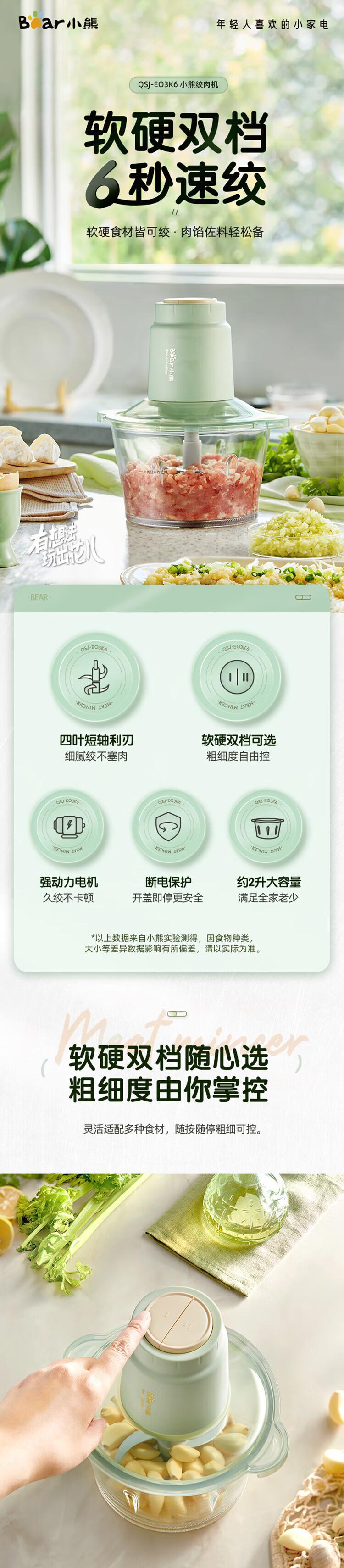 【自营】小熊绞肉机家用 绞馅机 碎肉机 电动多功能料理搅拌打肉饺子肉馅蒜蓉机 QSJ-E03K6双层四刀不锈钢碗两档调速快切省力