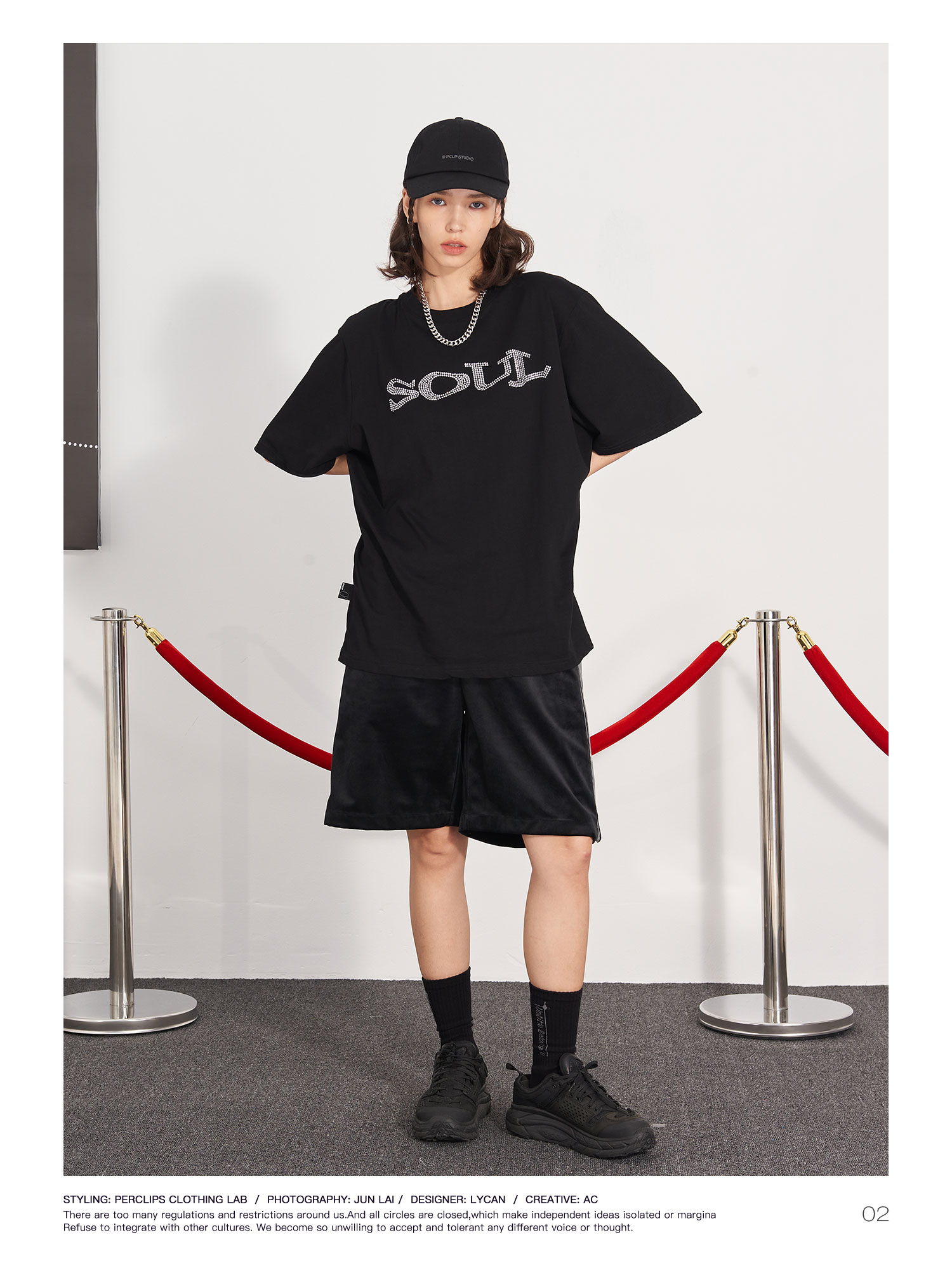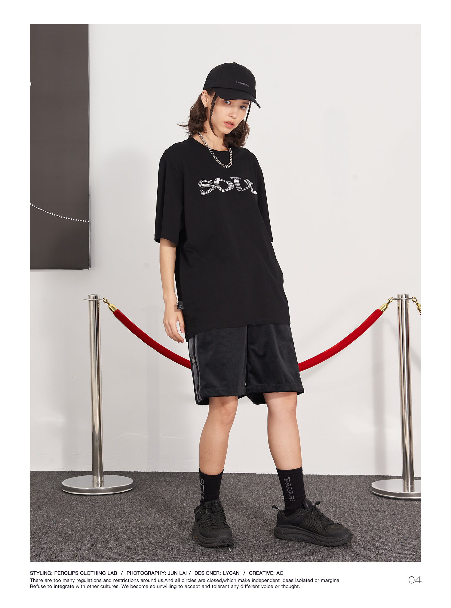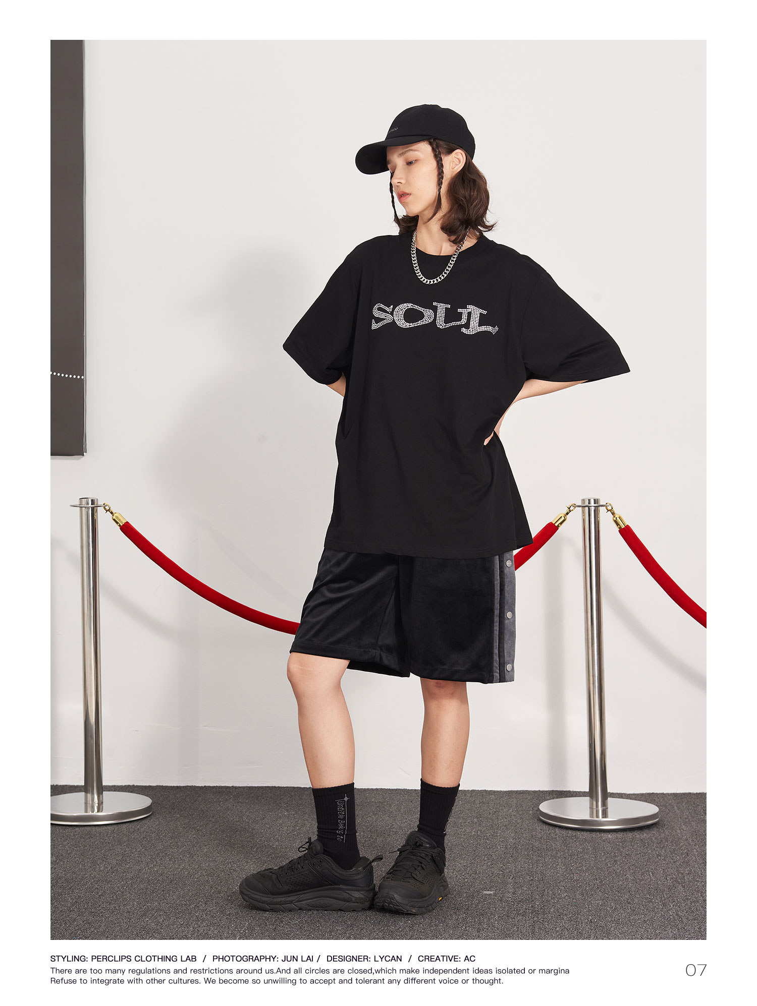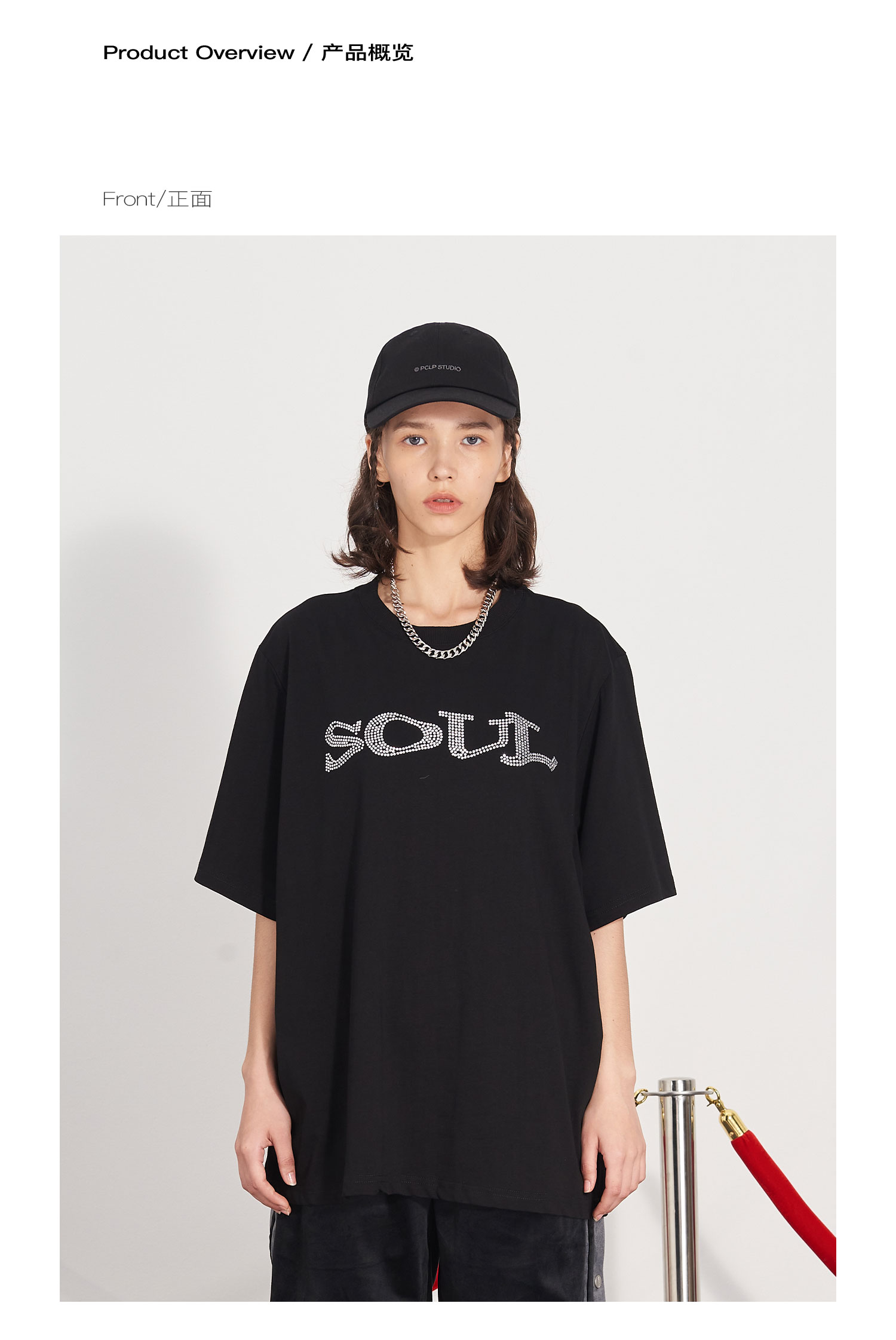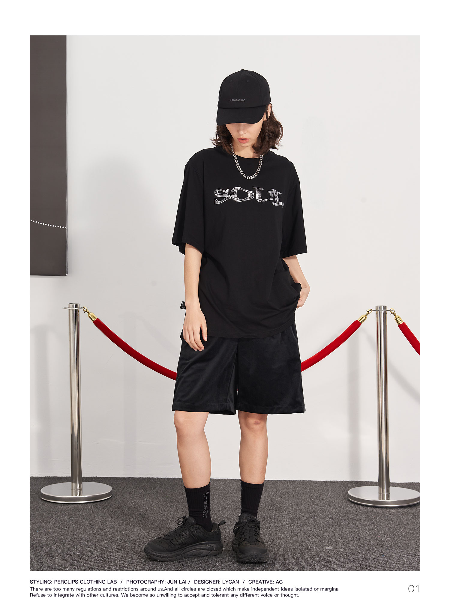 PCLP(PERCLIPS) 烫钻SOUL潮流印花短袖男国潮牌纯棉宽松半袖t恤男