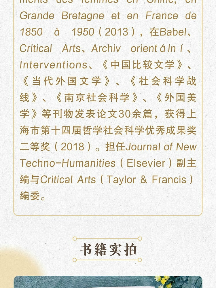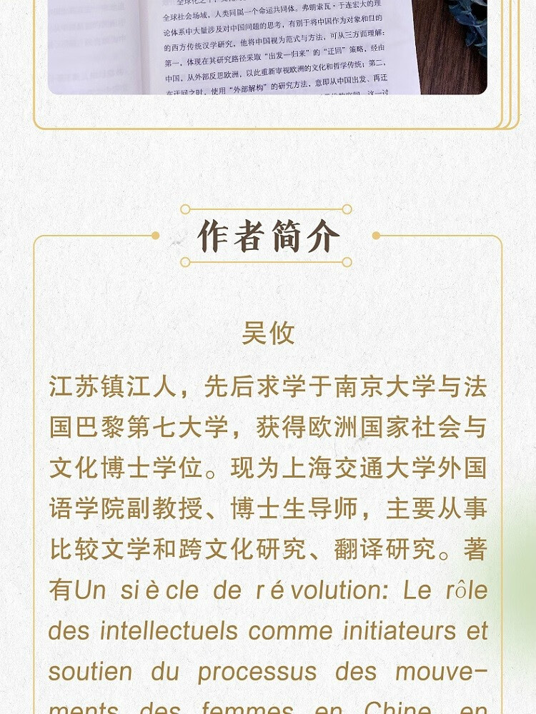 吴攸,江苏镇江人,先后求学于南京大学与法国巴黎第七大学,获得欧洲国家社会与文化博士学位。现为上海交通大学外国语学院副教授、博士生导师,主要从事比较文学和跨文化研究、翻译研究。著有Un siècle de révolution: Le rôle des intellectuels comme initiateurs et soutien du processus des mouvements des femmes en Chine, en Grande Bretagne et en France de 1850 à 1950(2013),在Babel、Critical Arts、Archiv orientální、Interventions、《中国比较文学》、《当代外国文学》、《社会科学战线》、《南京社会科学》、《外国美学》等刊物发表论文30余篇,获得上海市第十四届哲学社会科学优秀成果奖二等奖(2018)。担任Journal of New Techno-Humanities(Elsevier)副主编与Critical Arts(Taylor & Francis)编委。