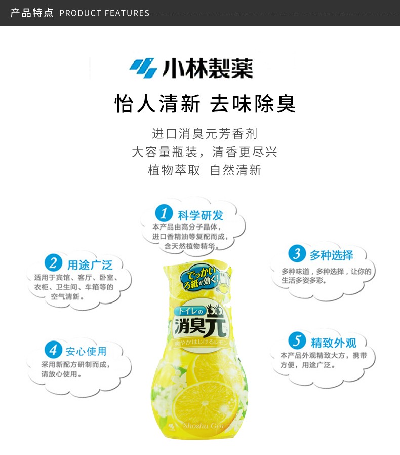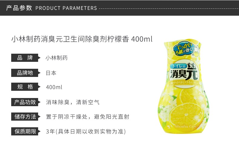 小林制药 清新剂消臭元除臭卧室卫生间清新剂 柠檬香 400ml 日本