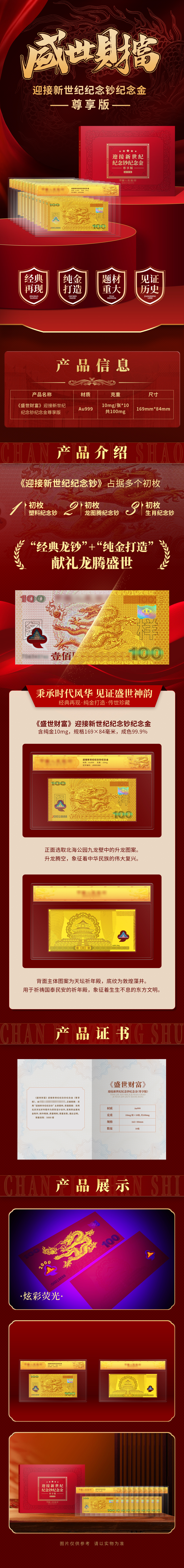 《盛世财富》迎接新世纪纪念钞纪念金单张十连号(带长城画)