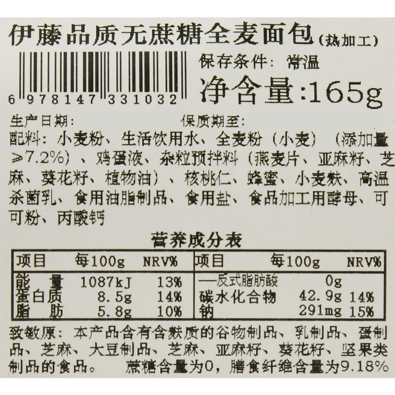 伊藤品质无蔗糖全麦面包 165g/袋