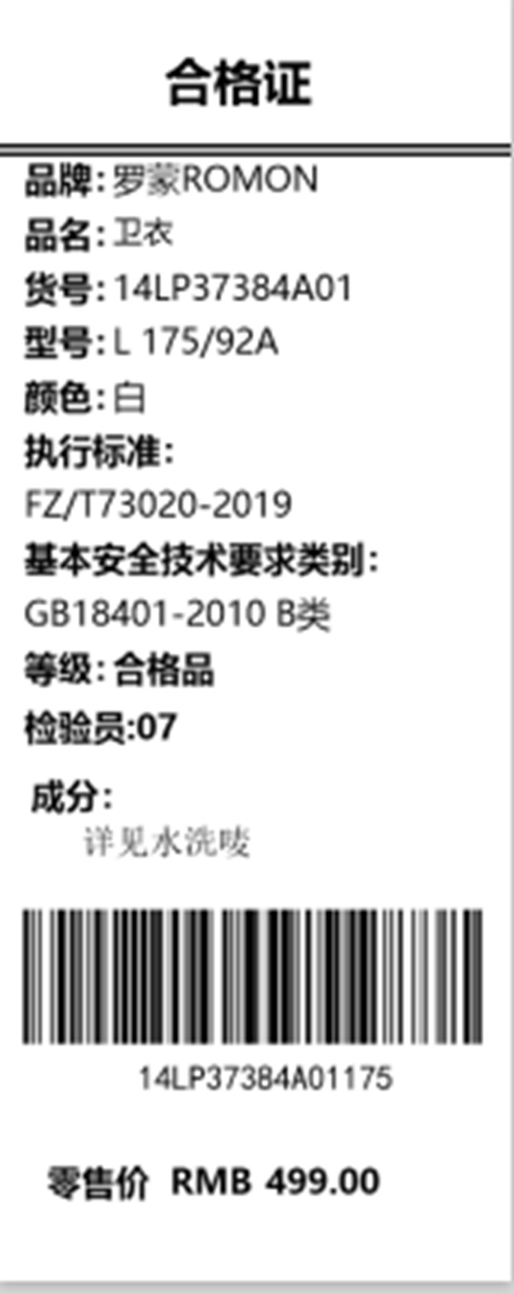 面料:60.8%棉 37.1%聚酯纤维 2.1%桑蚕丝 里料:93.5%聚酯纤维 6.5%氨纶(非纤维物质除外)