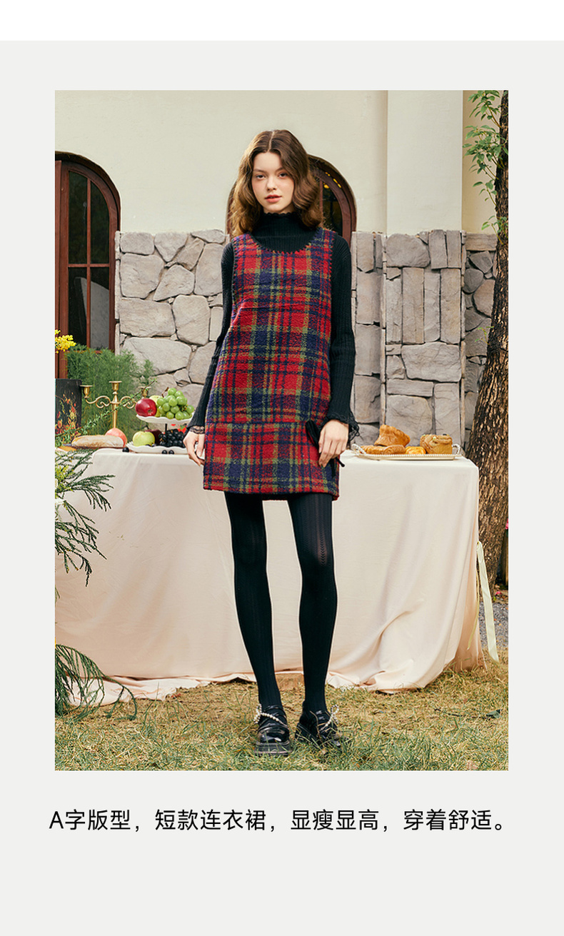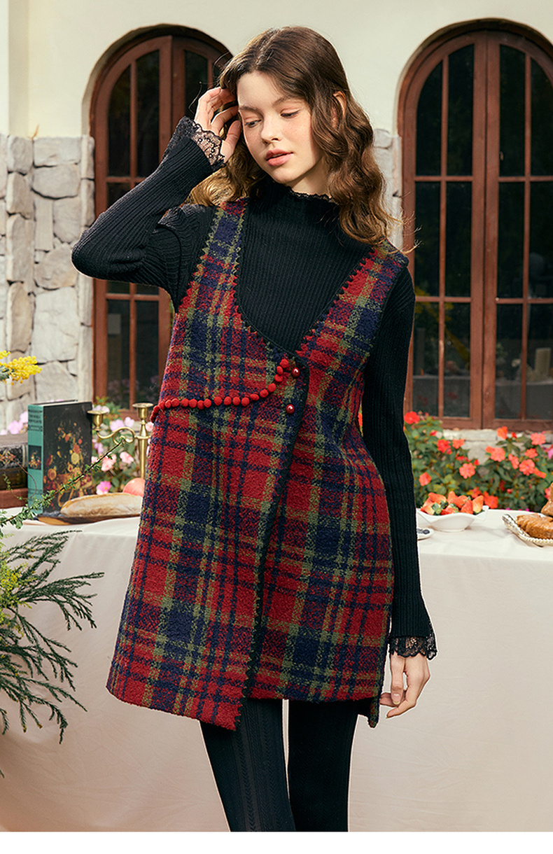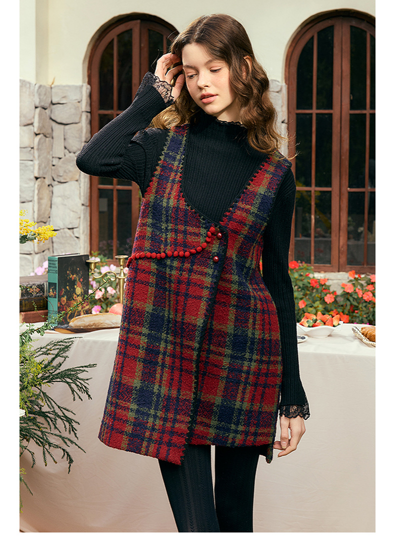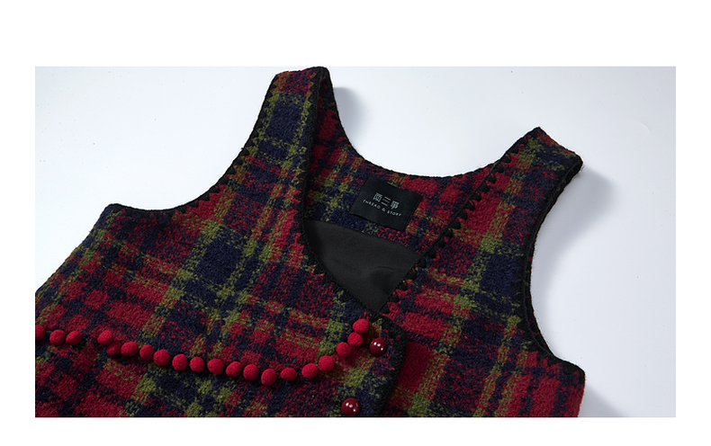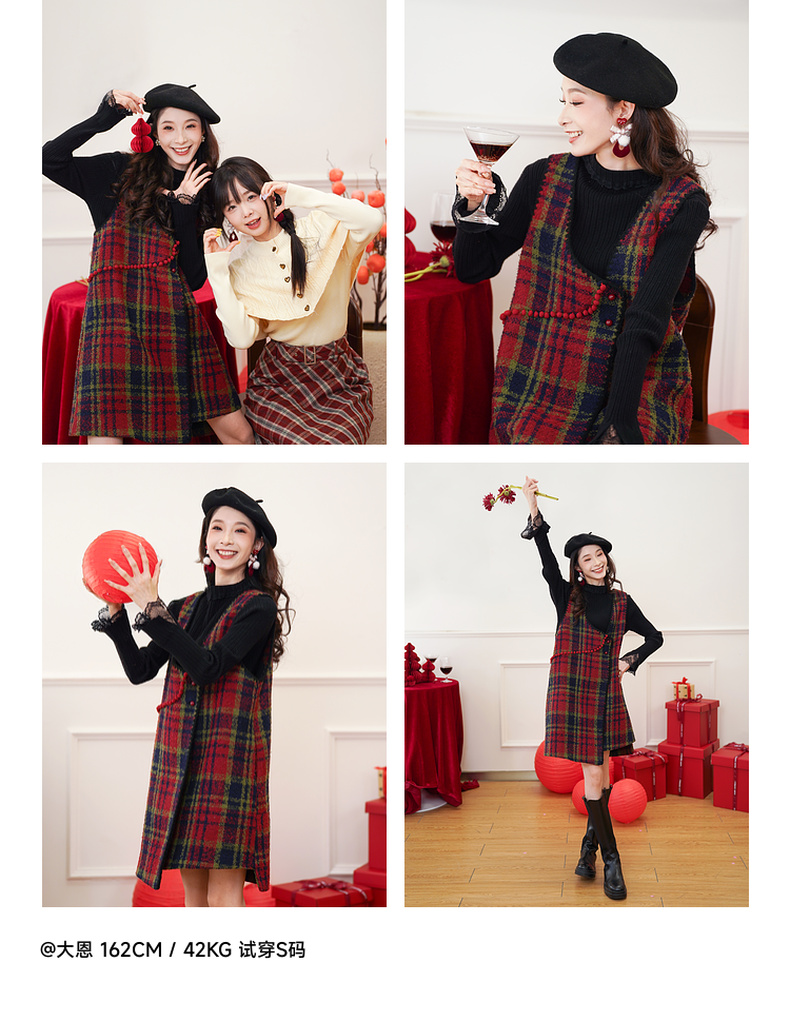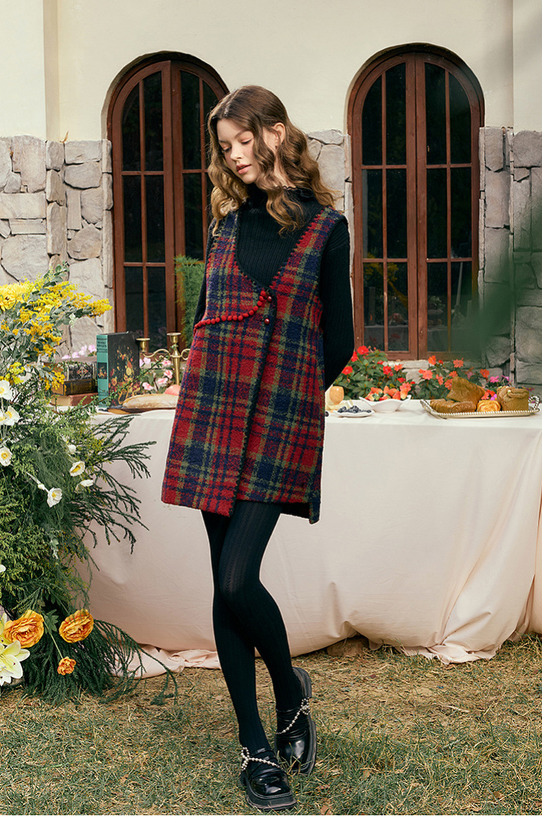 两三事玫色红酒2025春季新款复古毛球装饰两面穿格子背心裙连衣裙