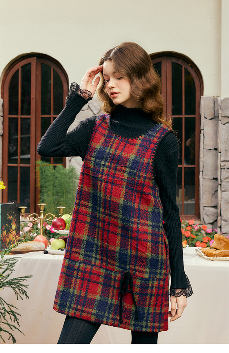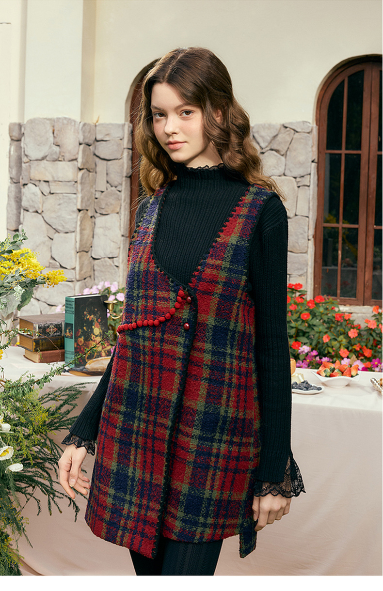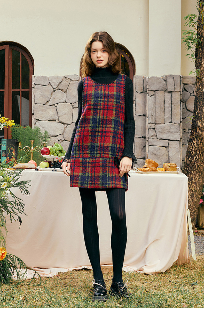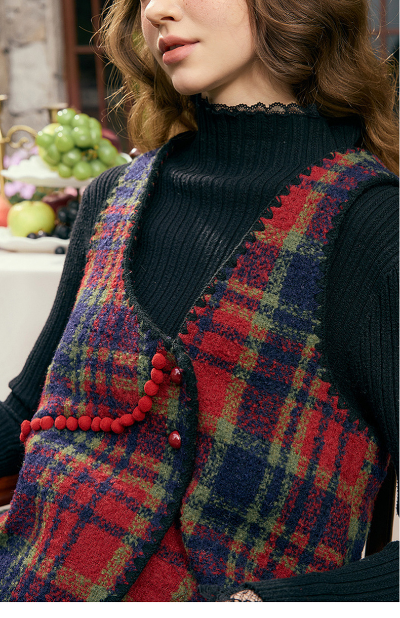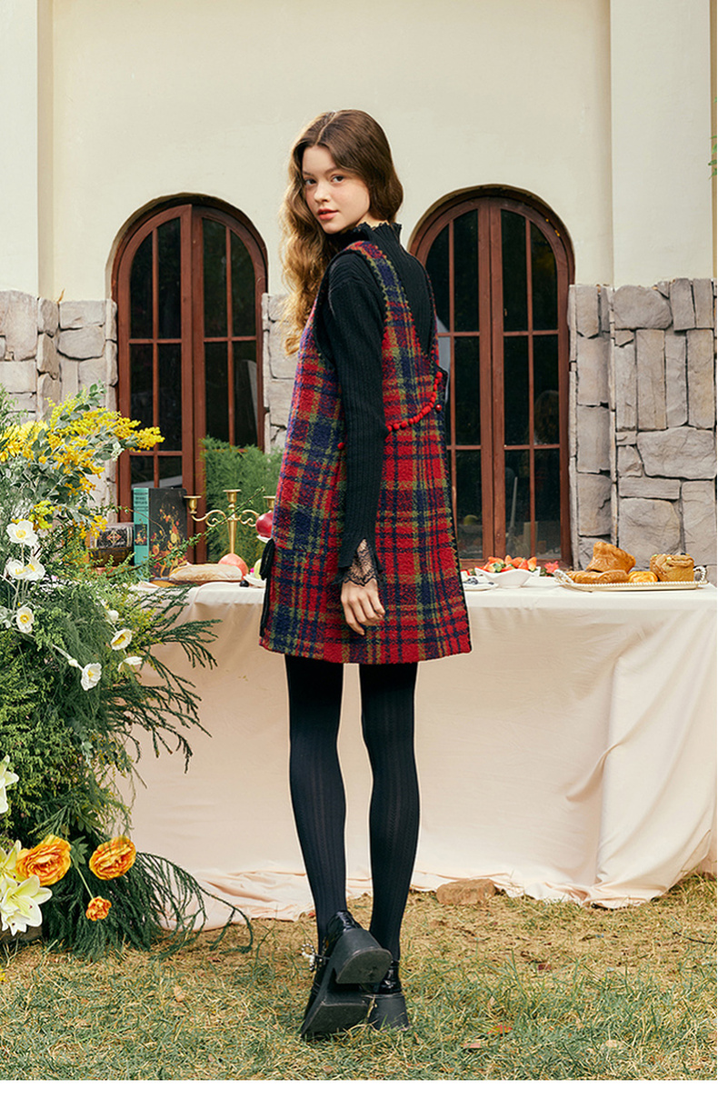 两三事玫色红酒2025春季新款复古毛球装饰两面穿格子背心裙连衣裙
