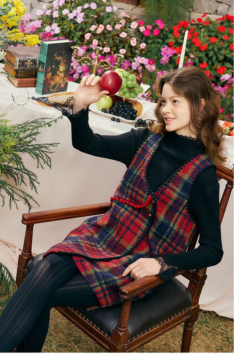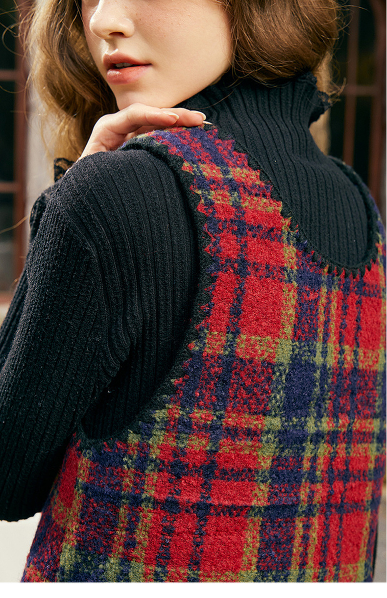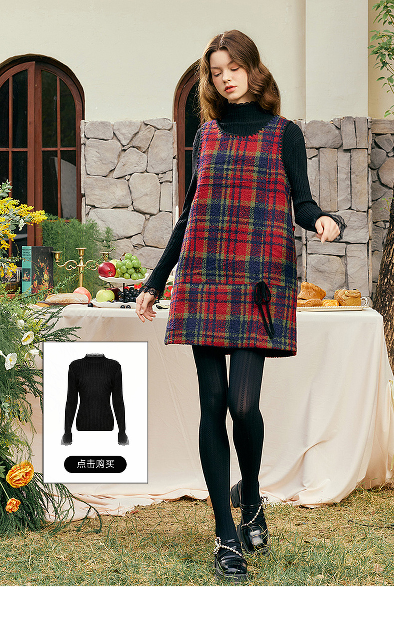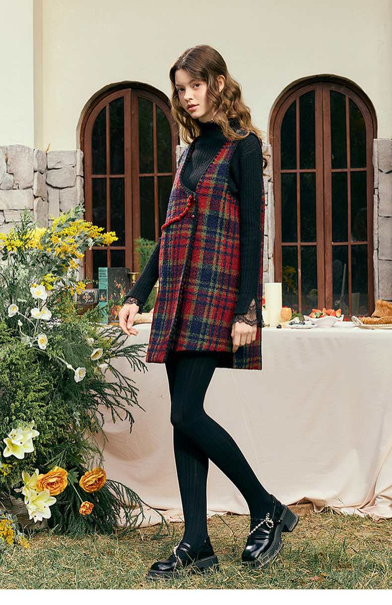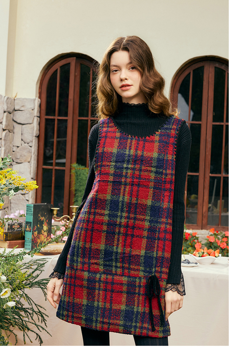 两三事玫色红酒2025春季新款复古毛球装饰两面穿格子背心裙连衣裙