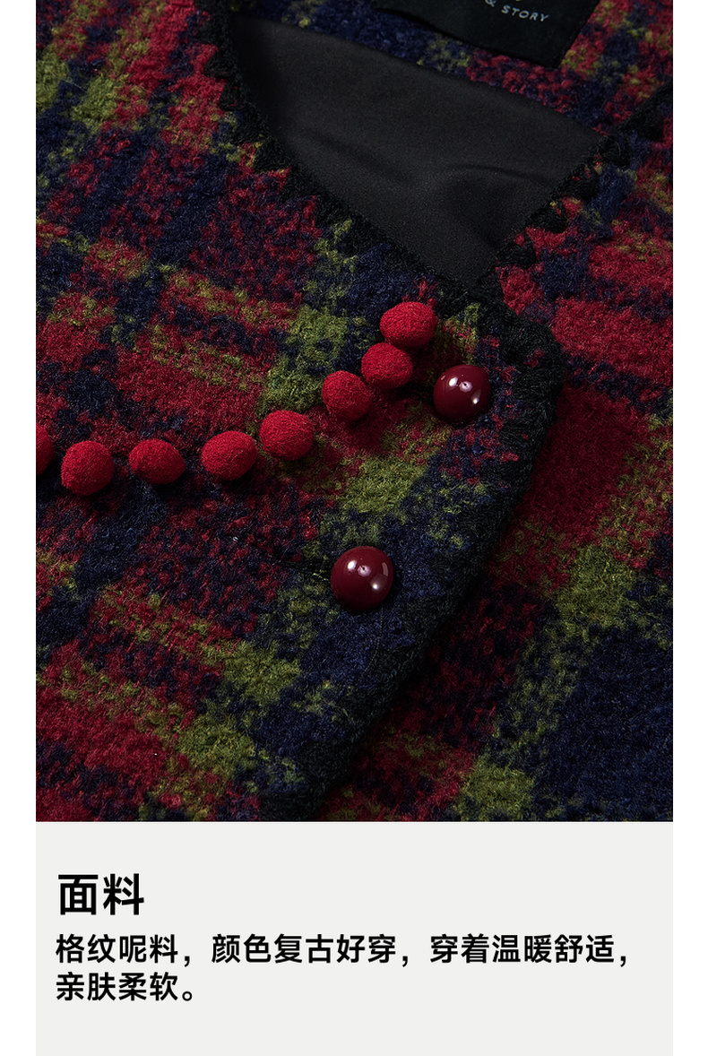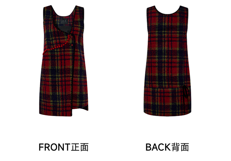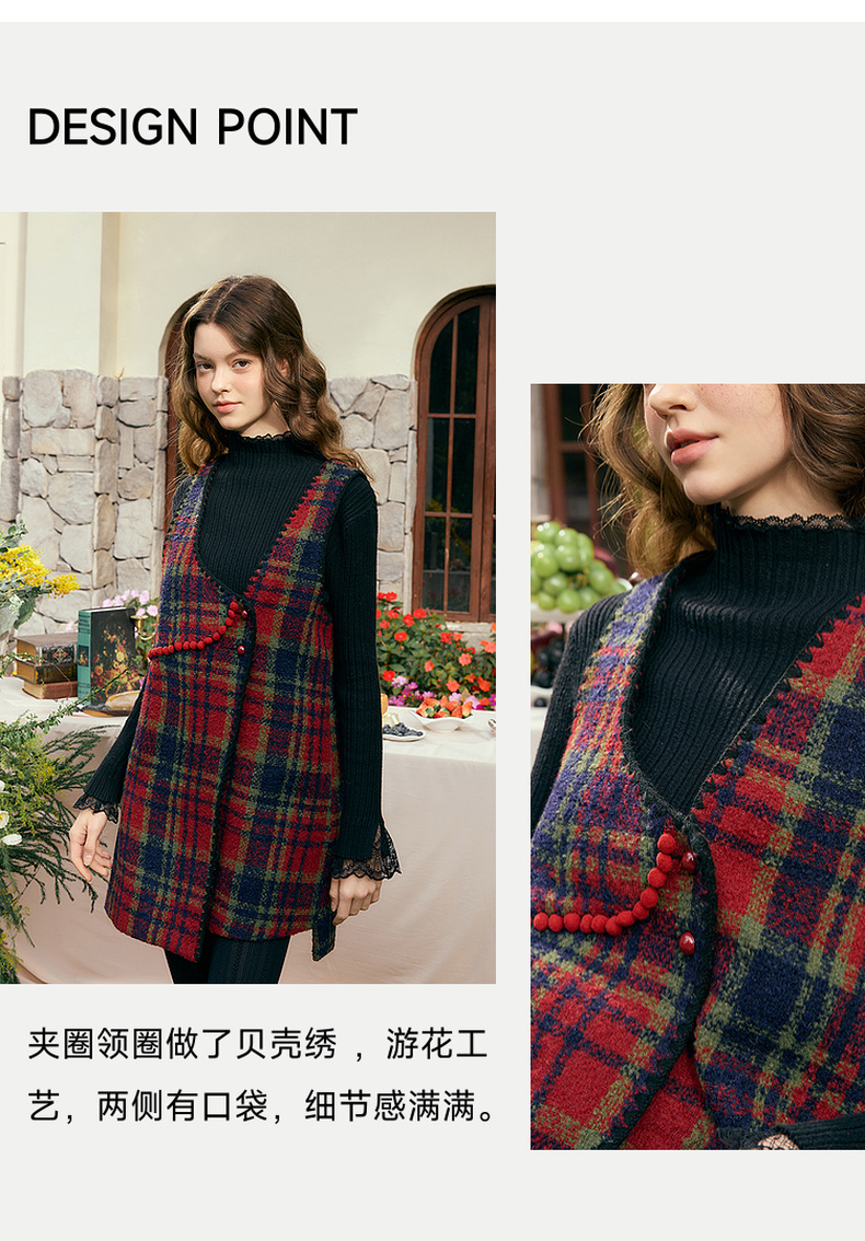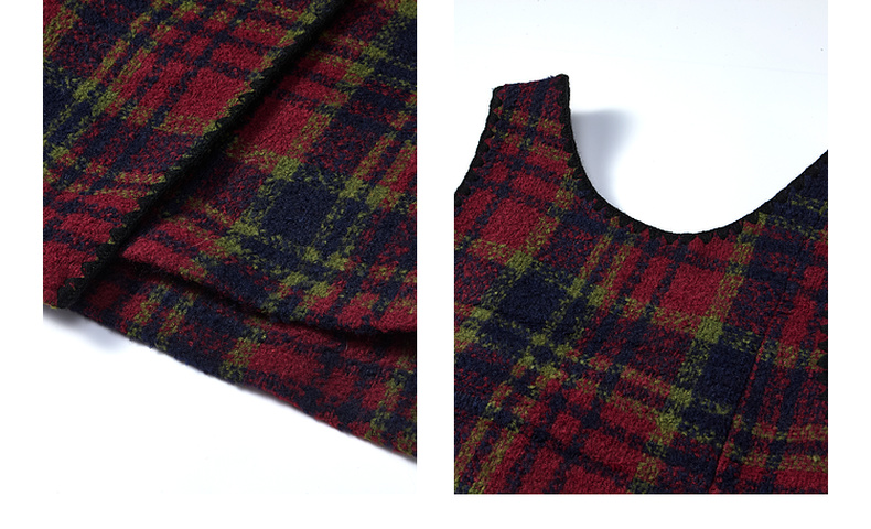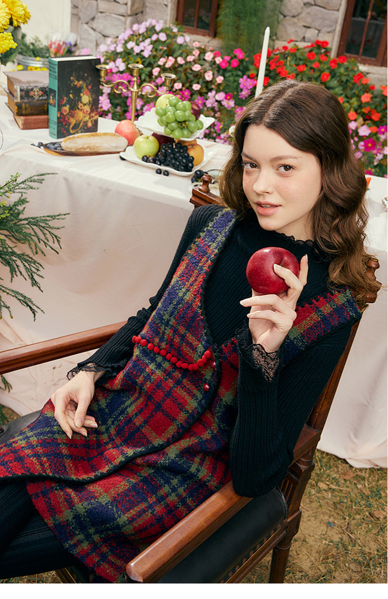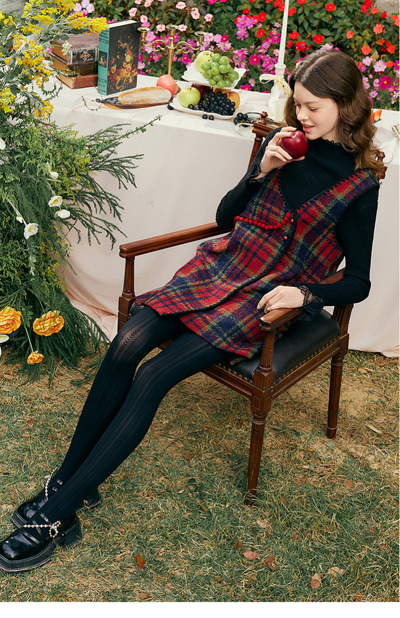 两三事玫色红酒2025春季新款复古毛球装饰两面穿格子背心裙连衣裙