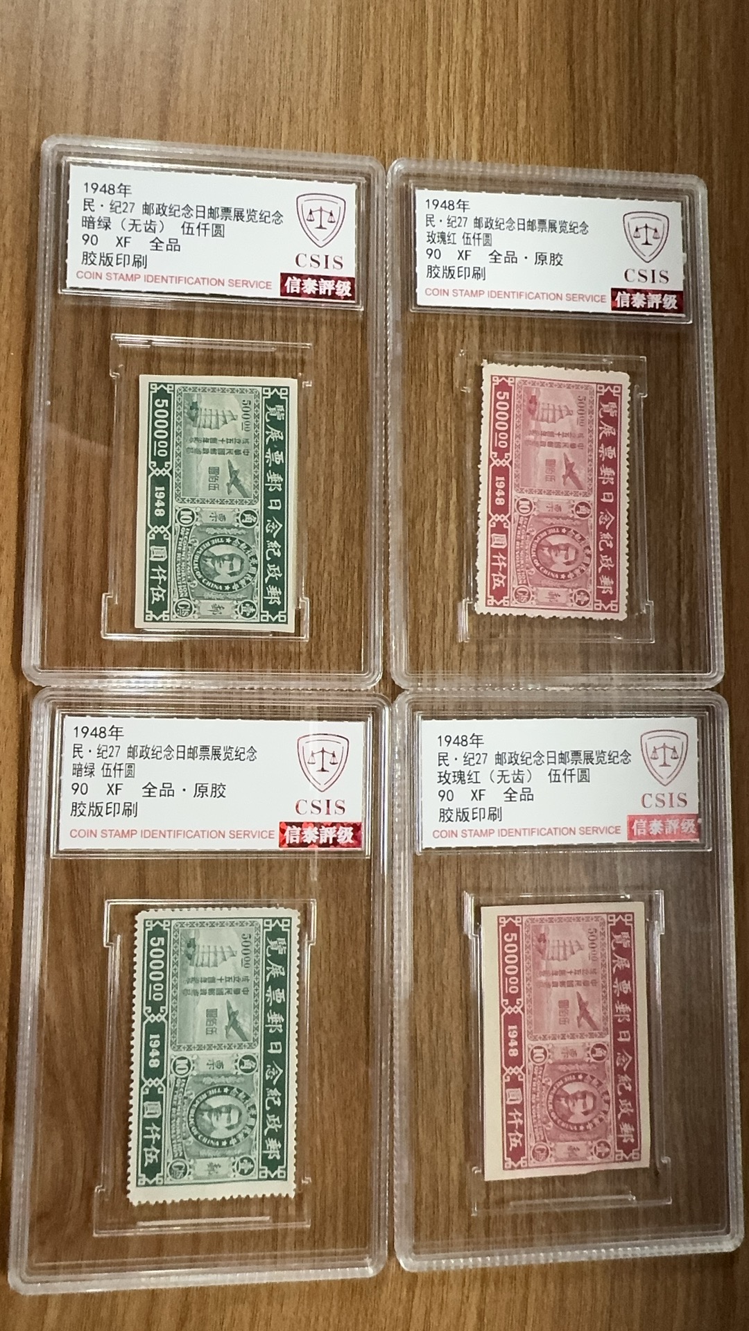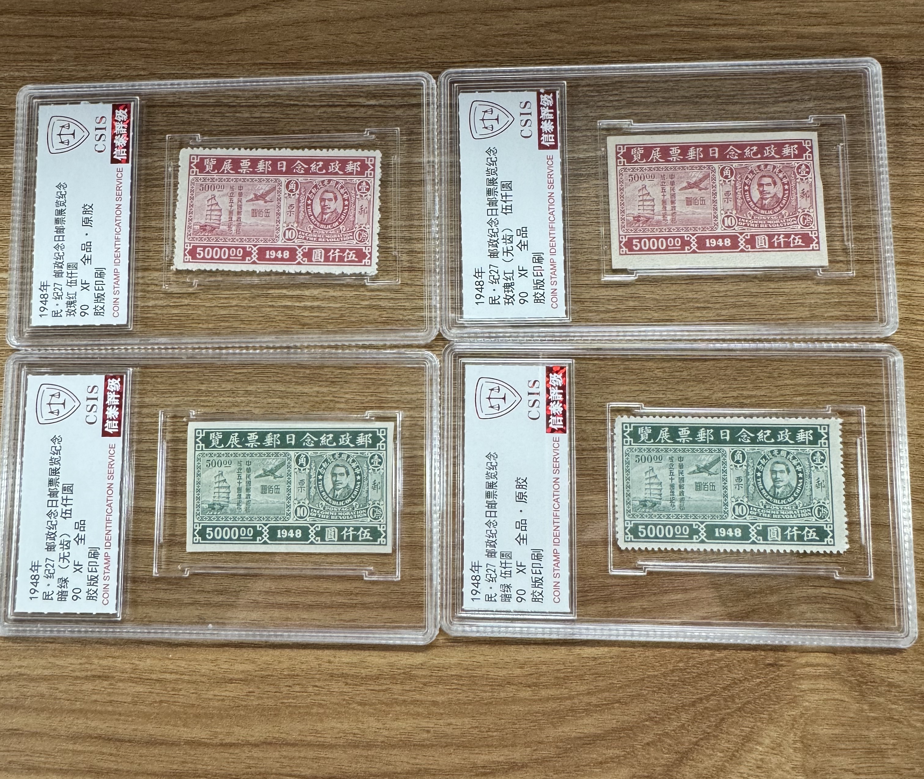 1948年 民 纪27 邮政纪念日邮票展览纪念 套票(一套4枚)无齿+有齿 评级90分