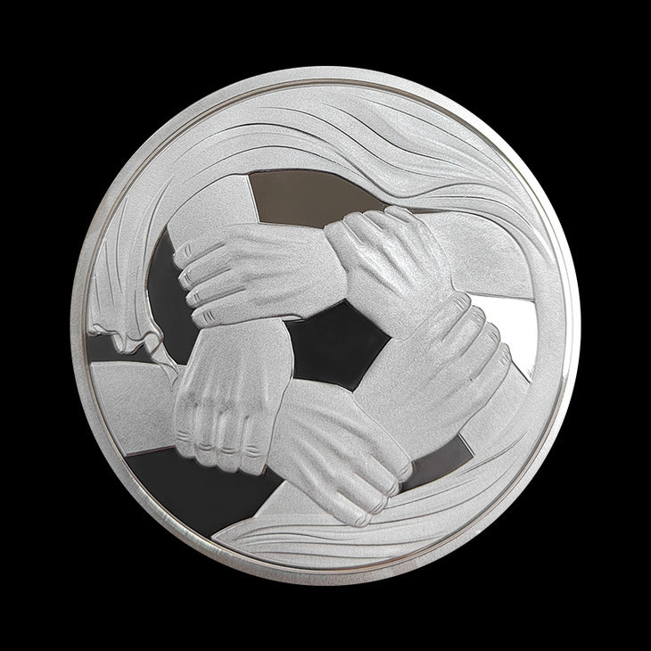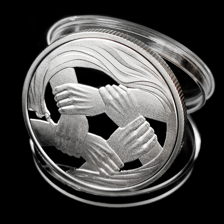 背面为心形丝带包裹着的五只紧扣的手臂,展现了人们众志成城、携手共度难关。细节雕刻的十分细腻,口罩上、防护服上的褶皱都真实地刻画出来,非常写实!