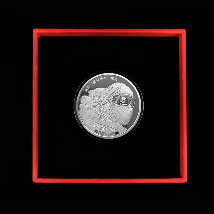为致敬抗疫医务人员,中国钱币有限公司特别发行“抗击疫情纪念章”一枚,直径40mm,合金镀纯银,采用高浮雕、镜面喷砂工艺