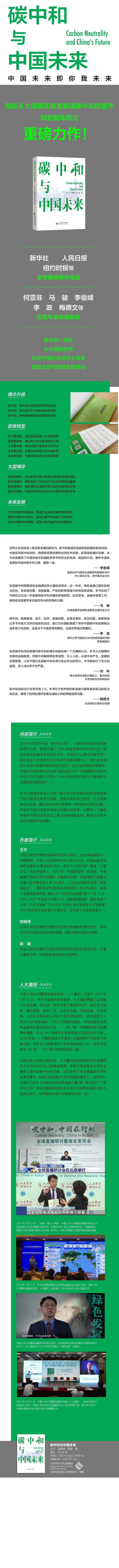 本书仔细梳理并深入分析了碳中和目标和国际低碳发展背景下的气候理论传承与发展、国 家政策制定与规划、行业减排路径与进展、国际合作合作与竞争等一系列碳中和前沿问题。希 望本书能为读者带来碳中和理念的思考,令更多人了解到中国所开展的这场历史上最大的碳减 排运动,更尝试向世界讲好中国碳中和故事。